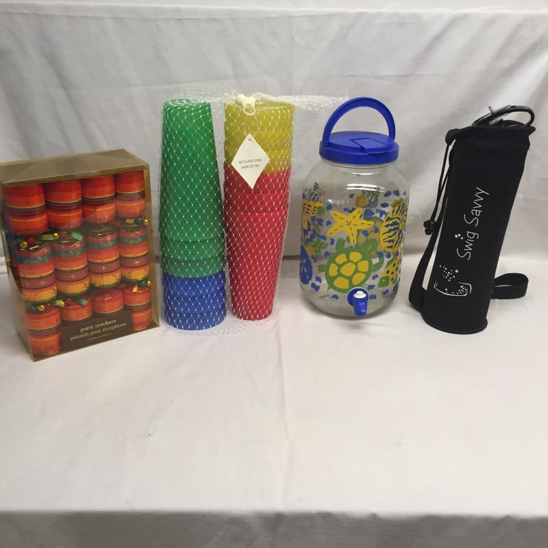 Ice Tea Cups and Jug,Drink Bottle With Carrier and Party Crackers. Drink bottle Measures 12.5” Tall.