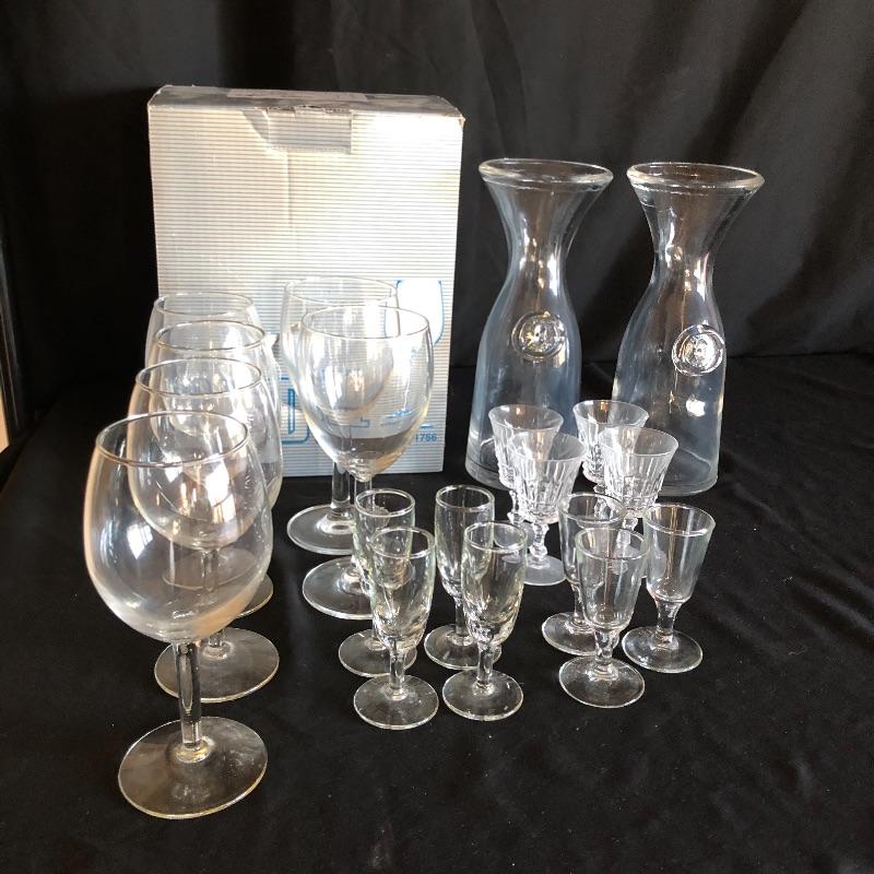 Be ready for the holidays with this selection of stemware. Lot includes six Riedel Cuvée Prestige glasses, two Italian carafes, six wine glasses, and eleven assorted liqueur glasses.