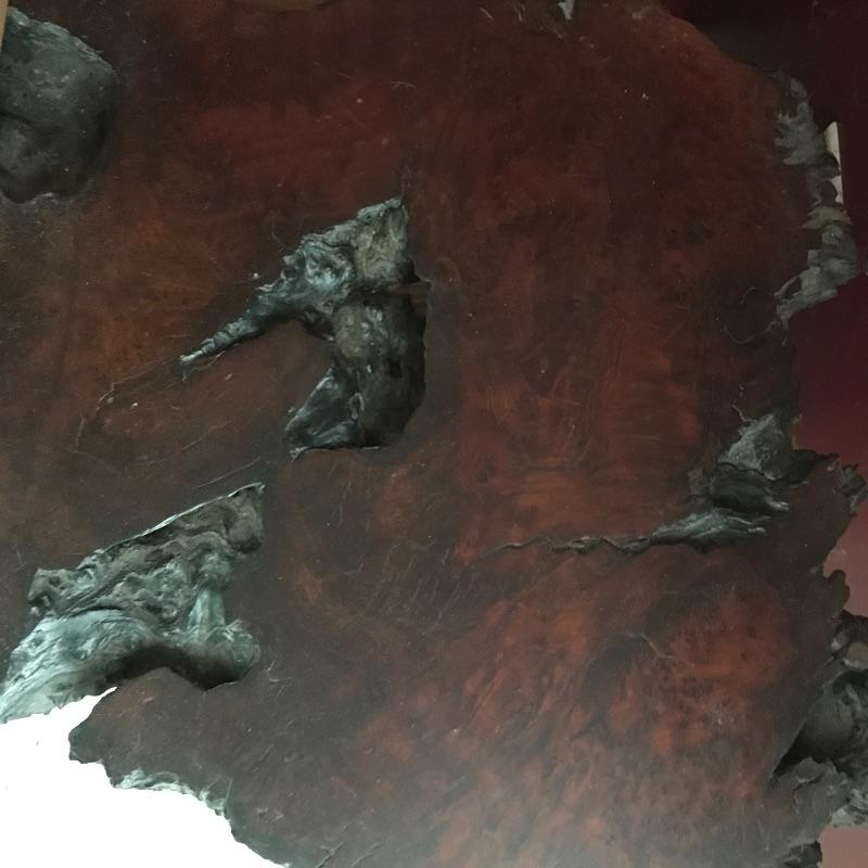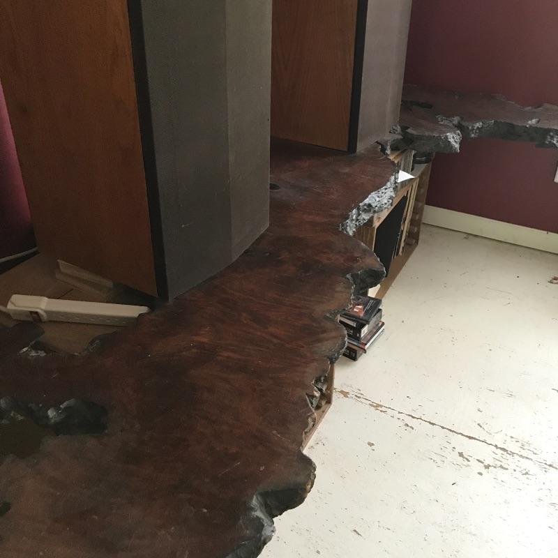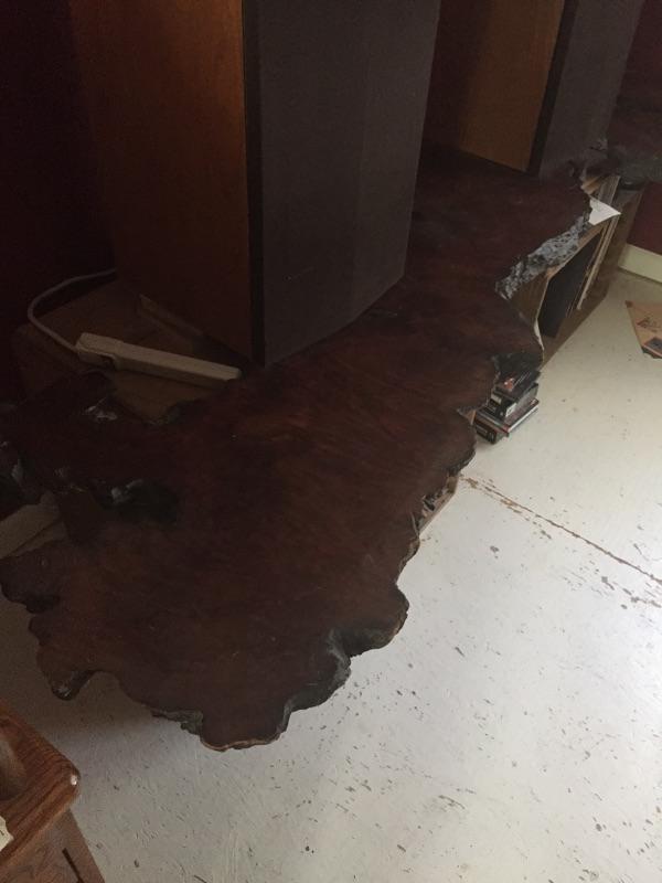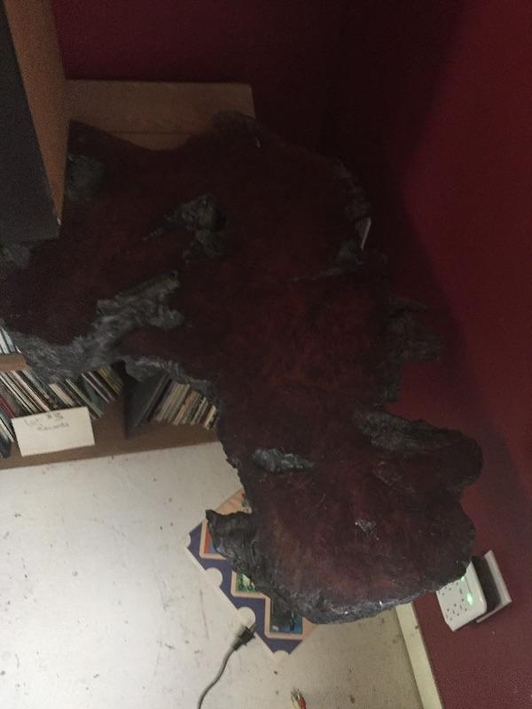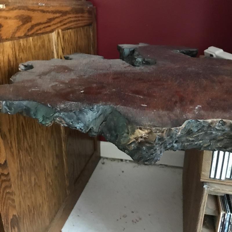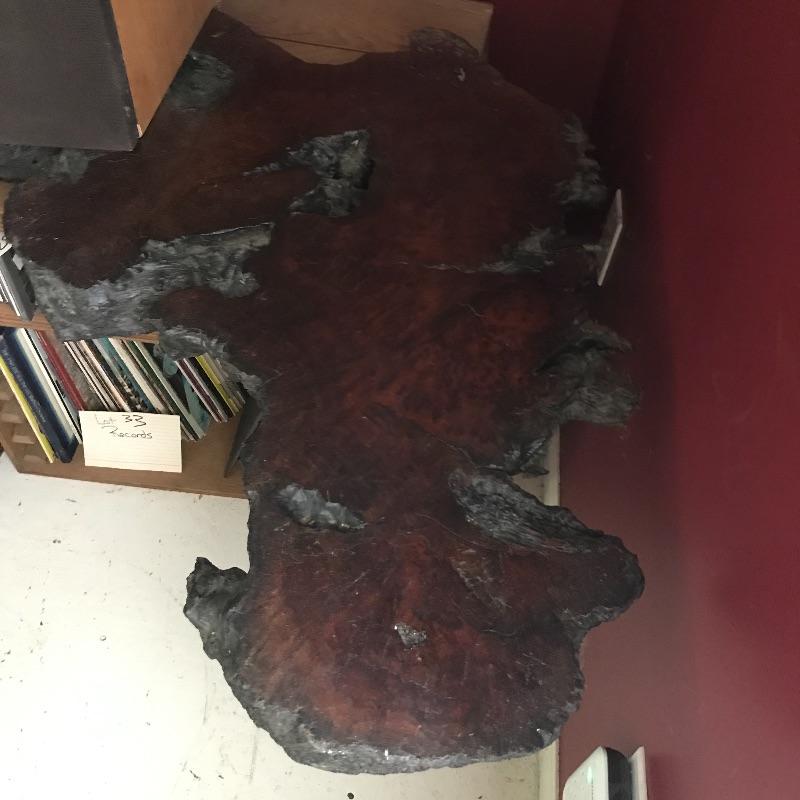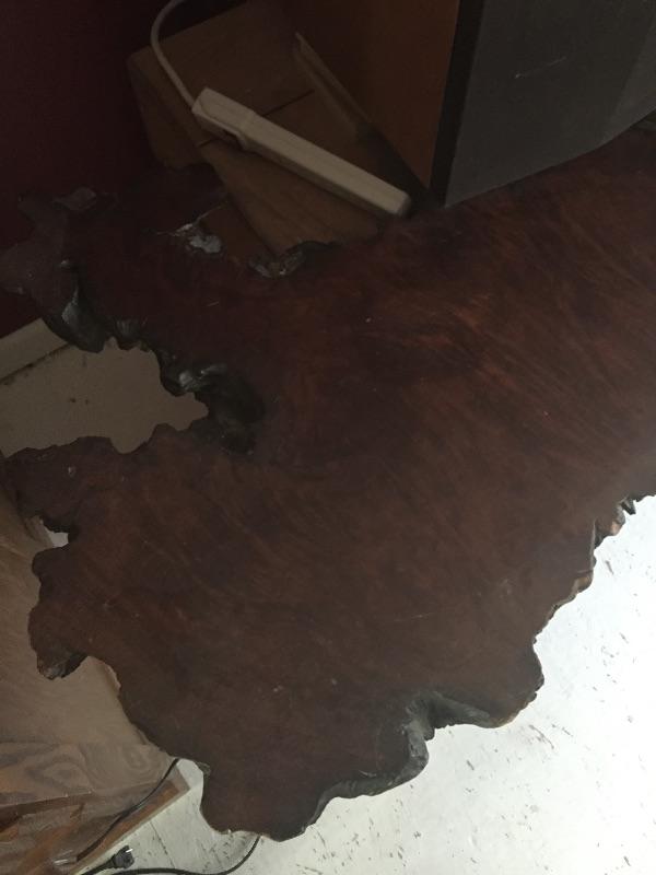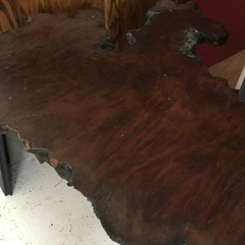This fashionable piece is a real eye catcher. A Live Edge table top with a dark stain finish that