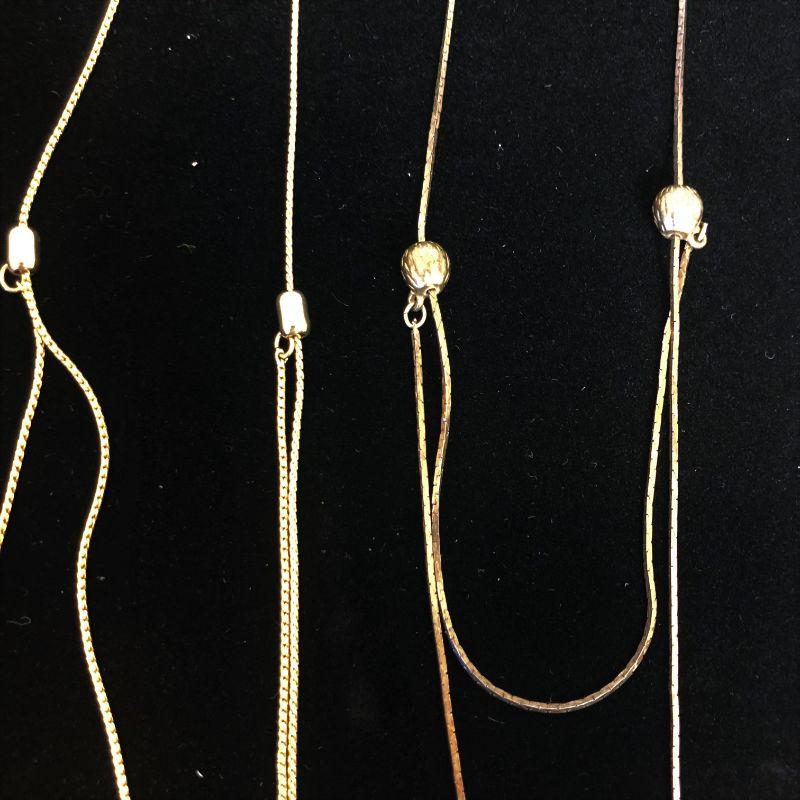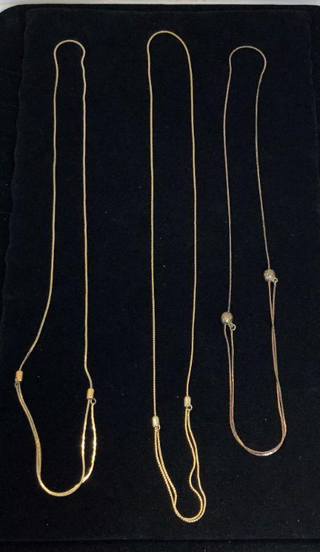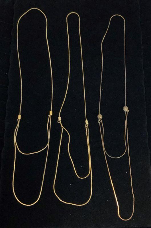 I believe that one of these is copper toned while the other two are definitely gold tone. All are in excellent condition. They all adjust by sliding on the "balls". You can make the necklaces long or into a variety of double chains.
