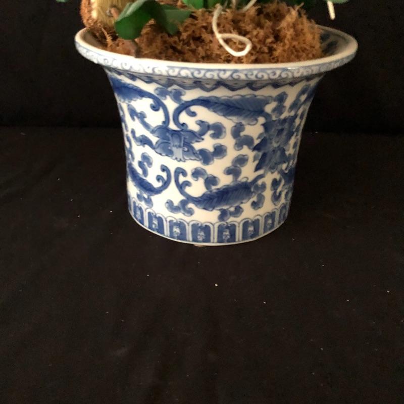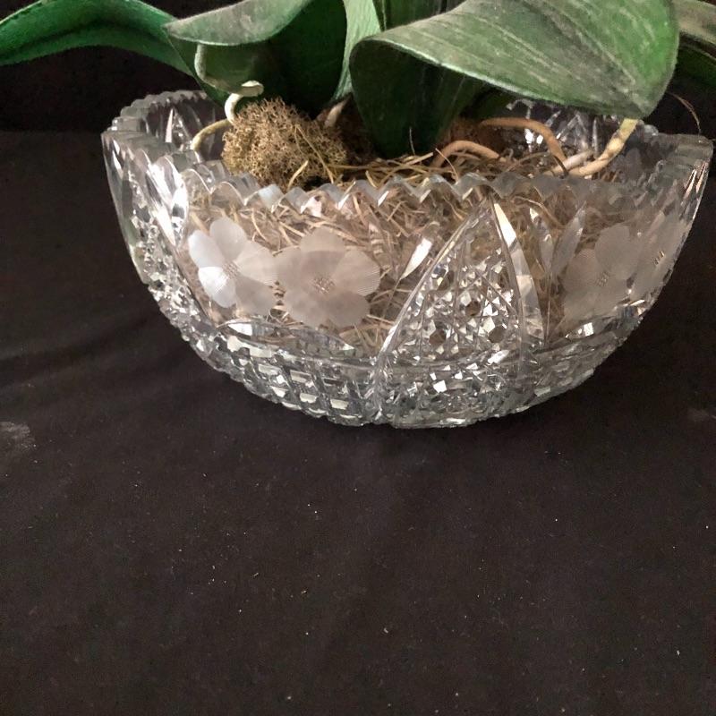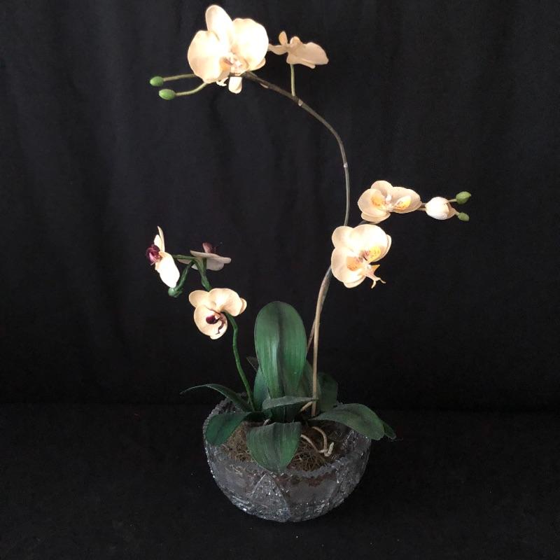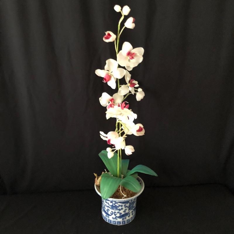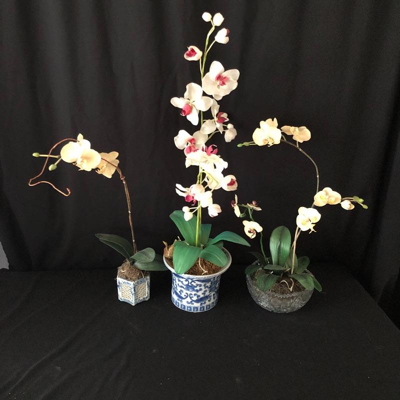 Brighten up your home with this trio of faux orchids. Lot includes faux orchid in a beautiful cut glass bowl, orchid in a blue and white pot and a smaller blue and whit pot. Largest orchid measures 33” tall.