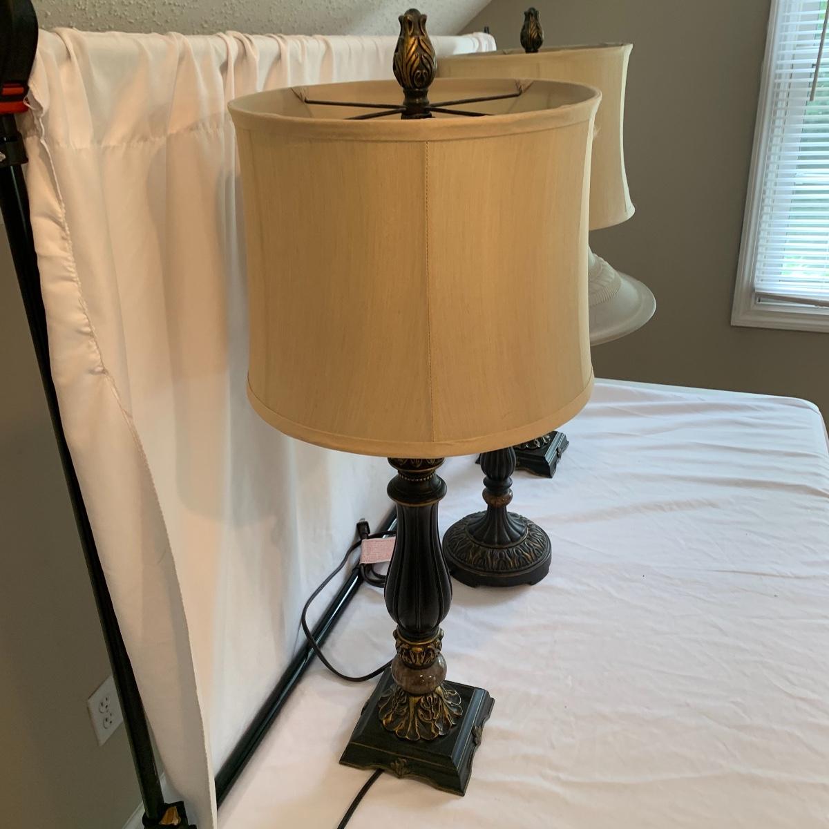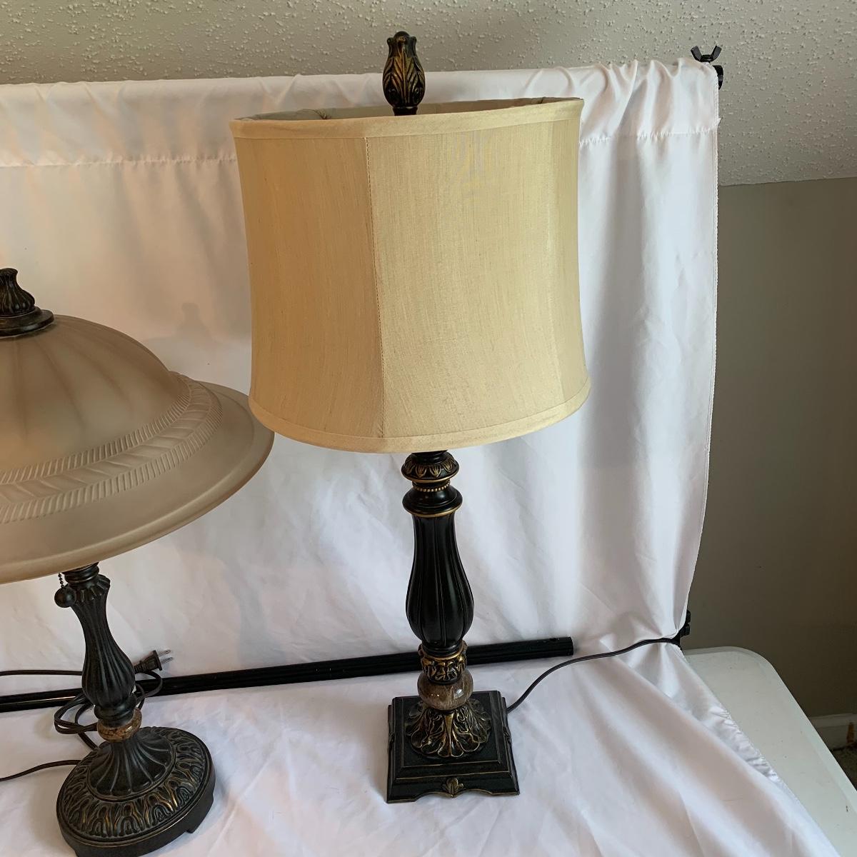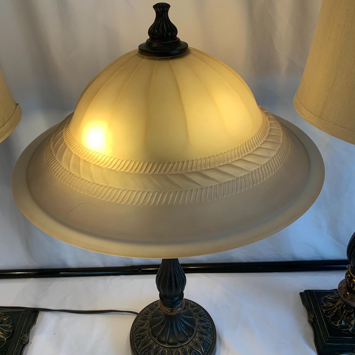 Light up your life! This lot consists of three lamps, two a matching pair. All three feature decretive trim details. The lamp in the middle has a glass shade that is beautiful when lit. The matching pair stand 30” tall, and the other is 24” tall. All three worked when tested. Local pickup only.