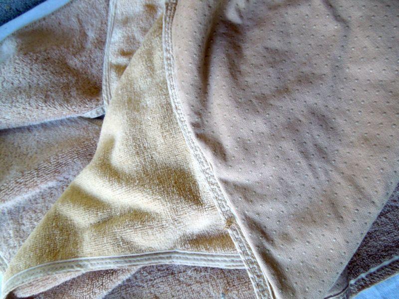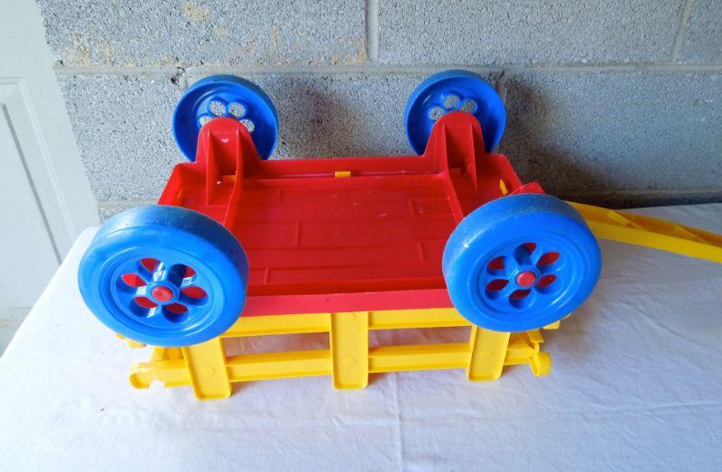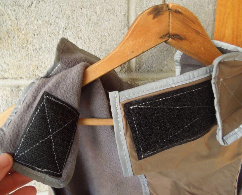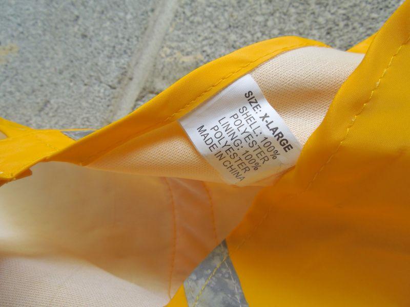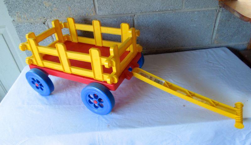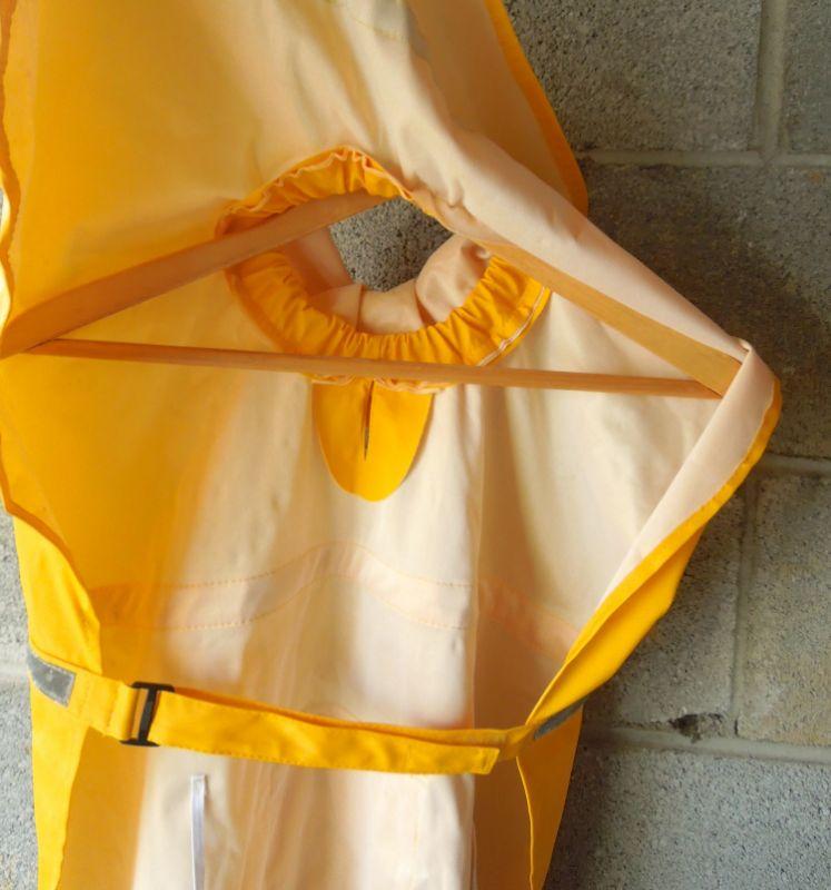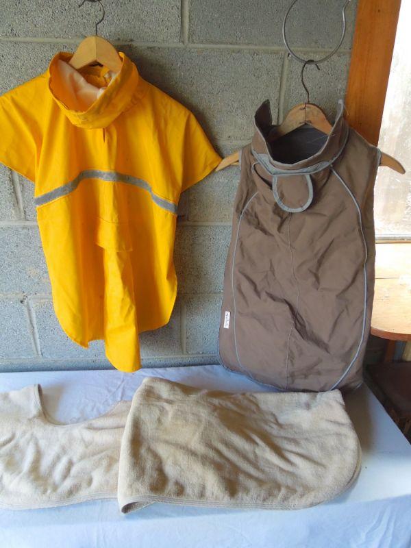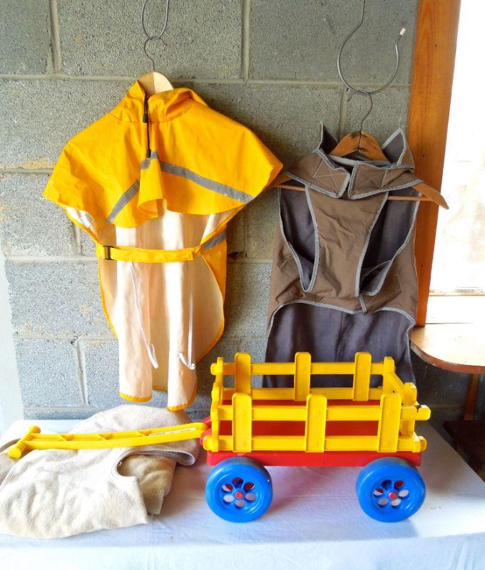 Yellow doggie rain jacket with velcro strap size XL; a brown nylon fleece lined XL jacket with velcro closures; a terry afterbath towel with hole for head; and a small 15" x 12" American Plastic toys wagon with removable sides. All are in excellent condition with little soil or pet hair.