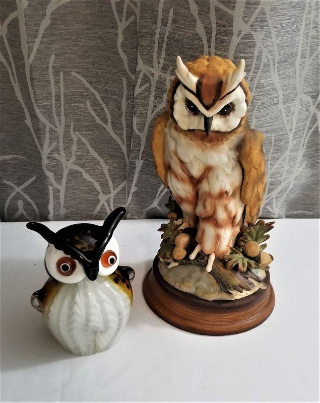 Lot #34  Two Owl Figurines - one blown Glass, one bisque porcelain