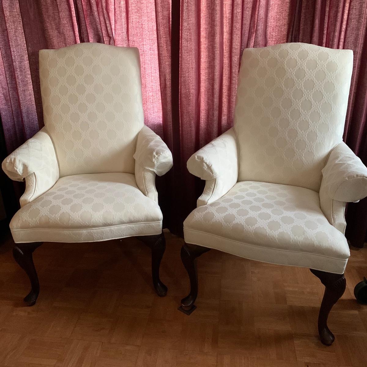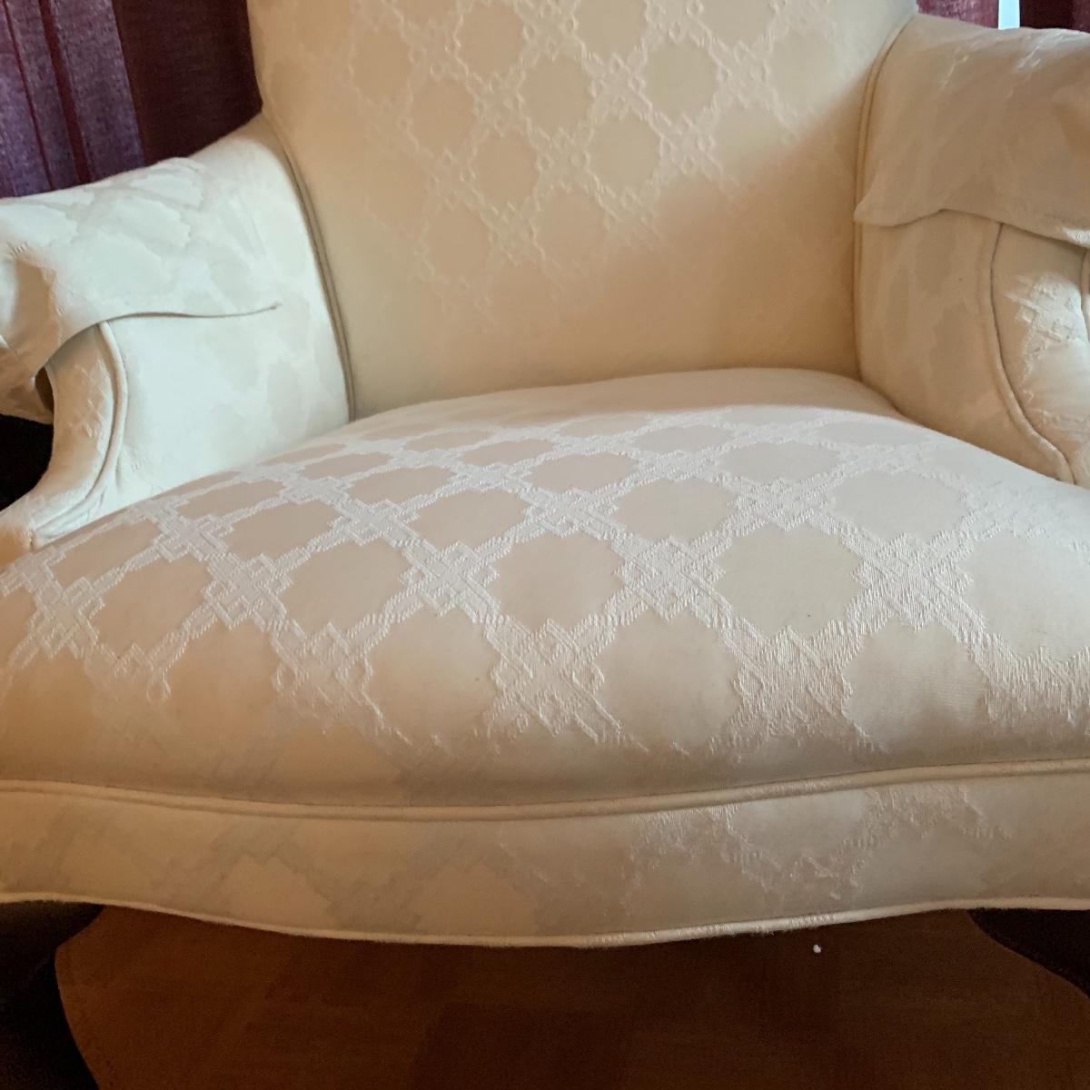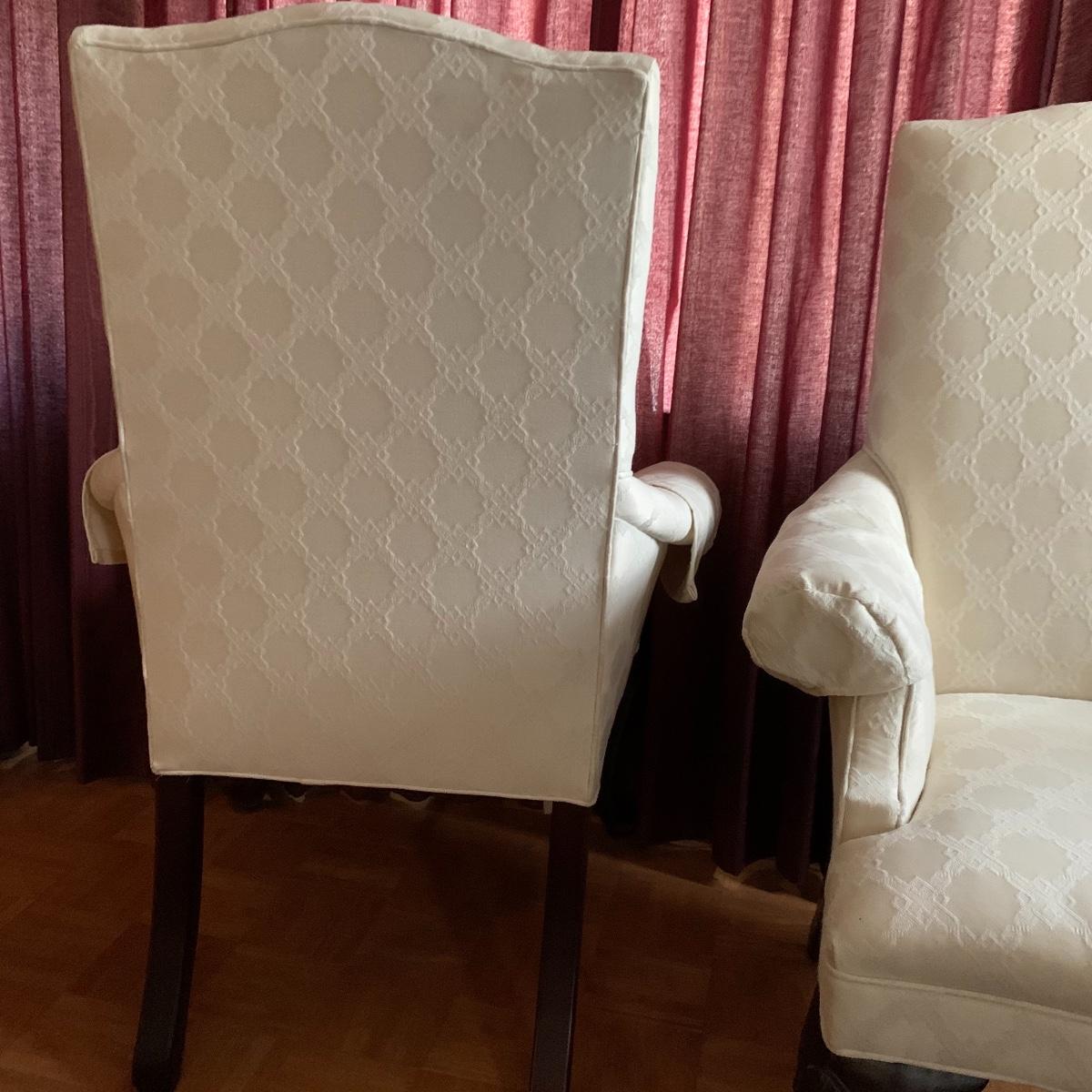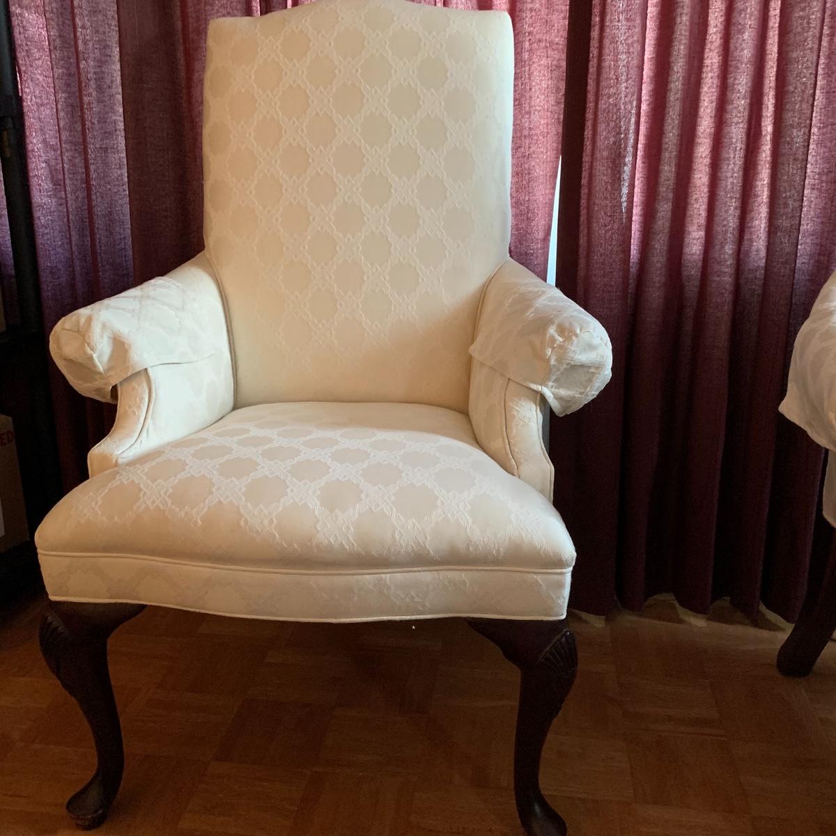 This lot includes two nice matching white upholstered armchairs. The upholstery has a lovely embroidered diamond pattern. There are some small speckle stains on the upholstery. The armrests have covers. The chairs have cherry colored wooden legs. The wooden feet show some wear. The chairs measure 25” x 30” x 43”. The seat height is 18”. Local pickup only.