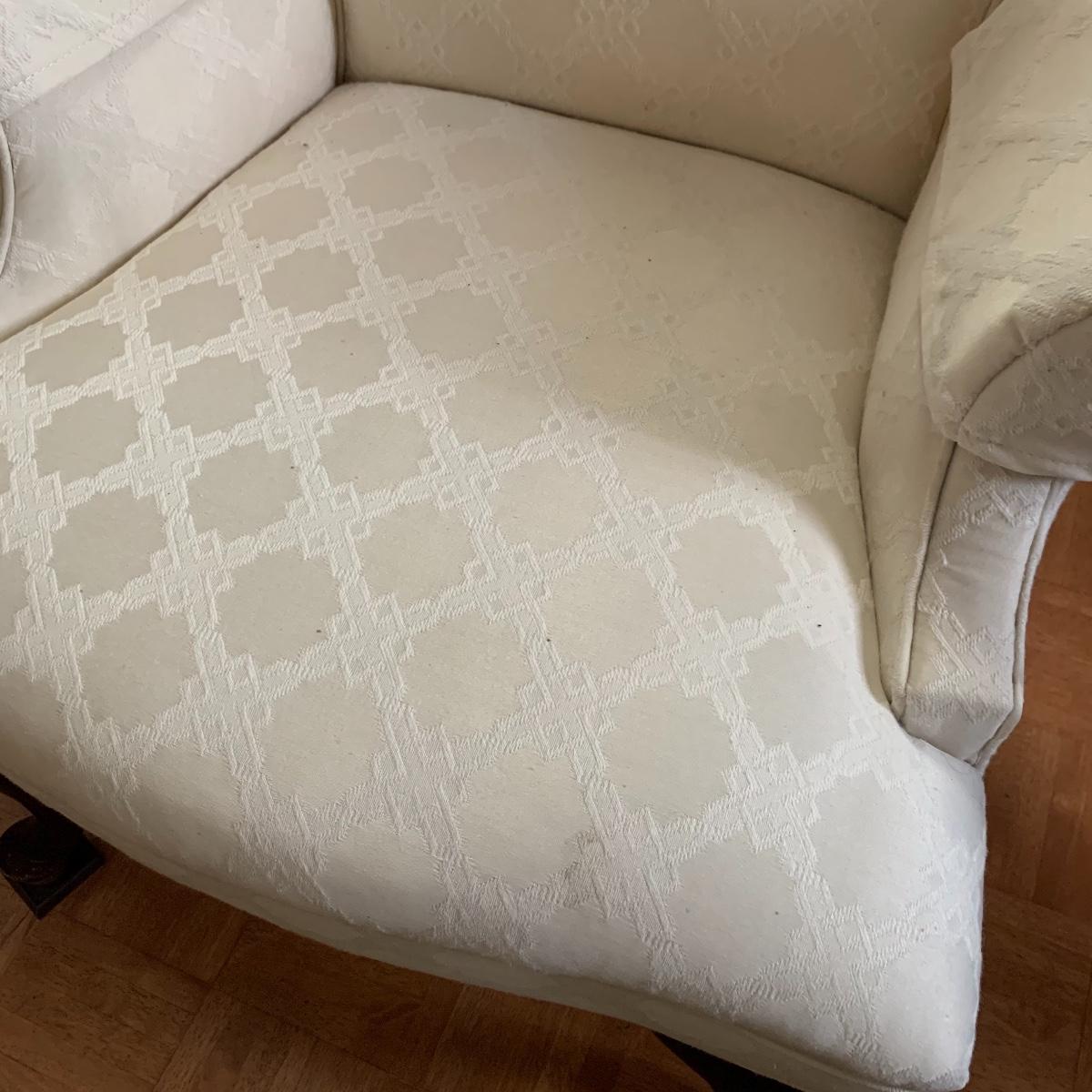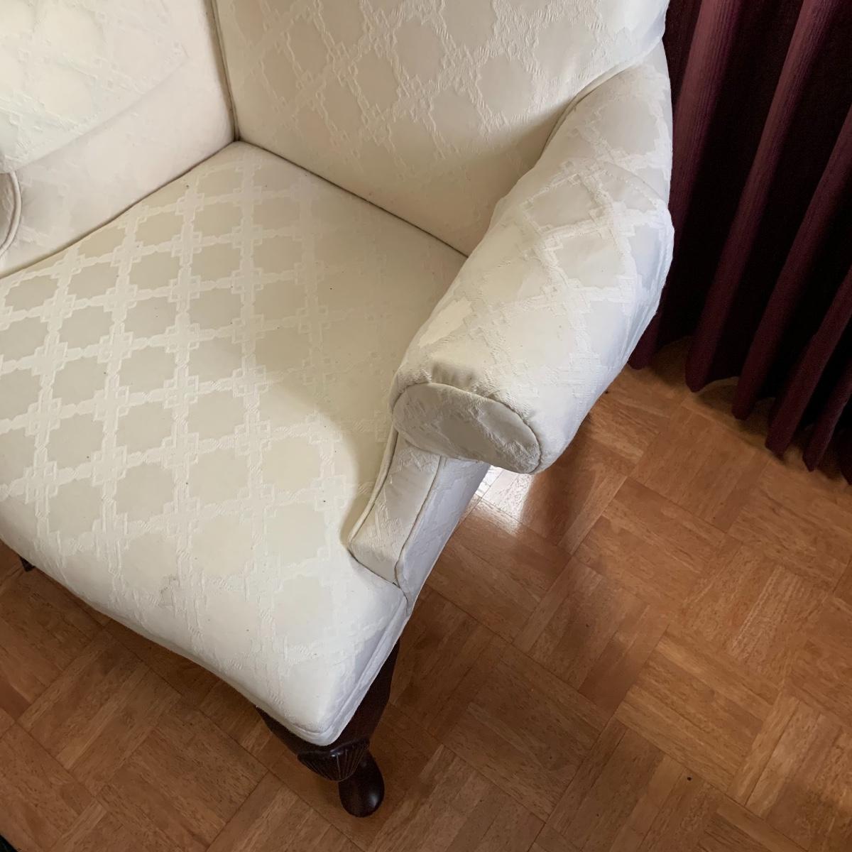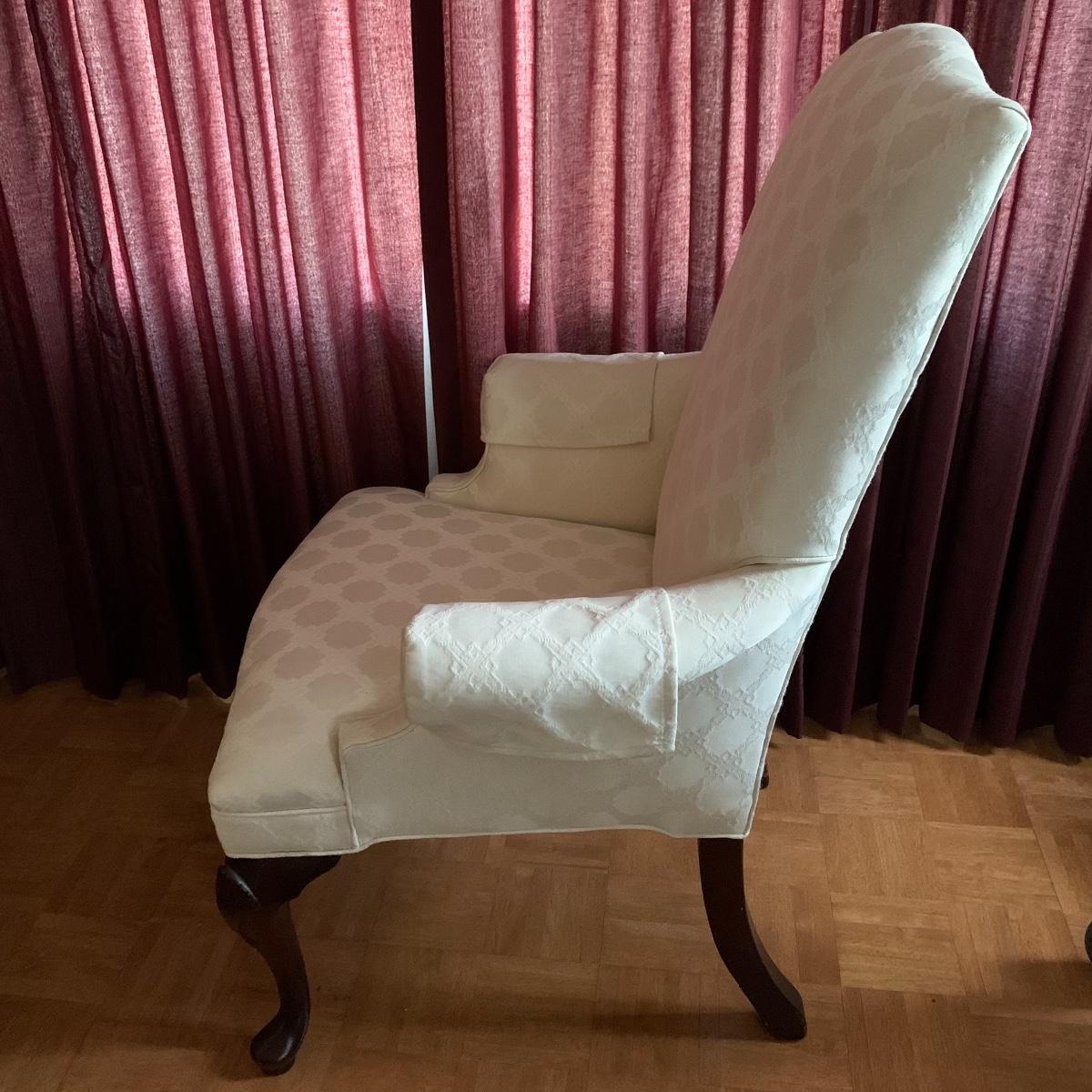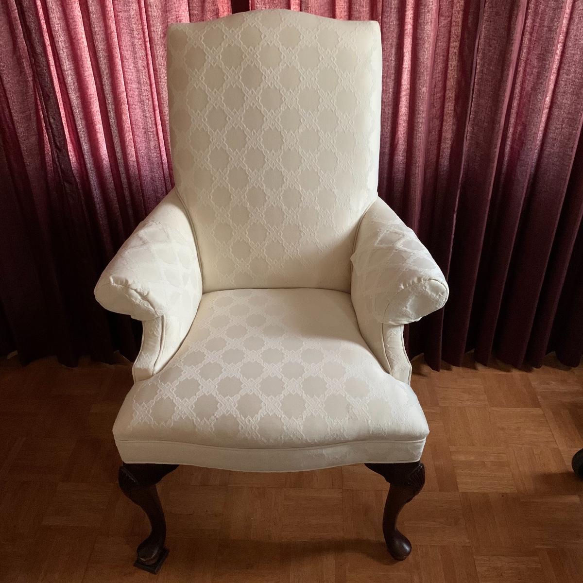 This lot includes two nice matching white upholstered armchairs. The upholstery has a lovely embroidered diamond pattern. There are some small speckle stains on the upholstery. The armrests have covers. The chairs have cherry colored wooden legs. The wooden feet show some wear. The chairs measure 25” x 30” x 43”. The seat height is 18”. Local pickup only.