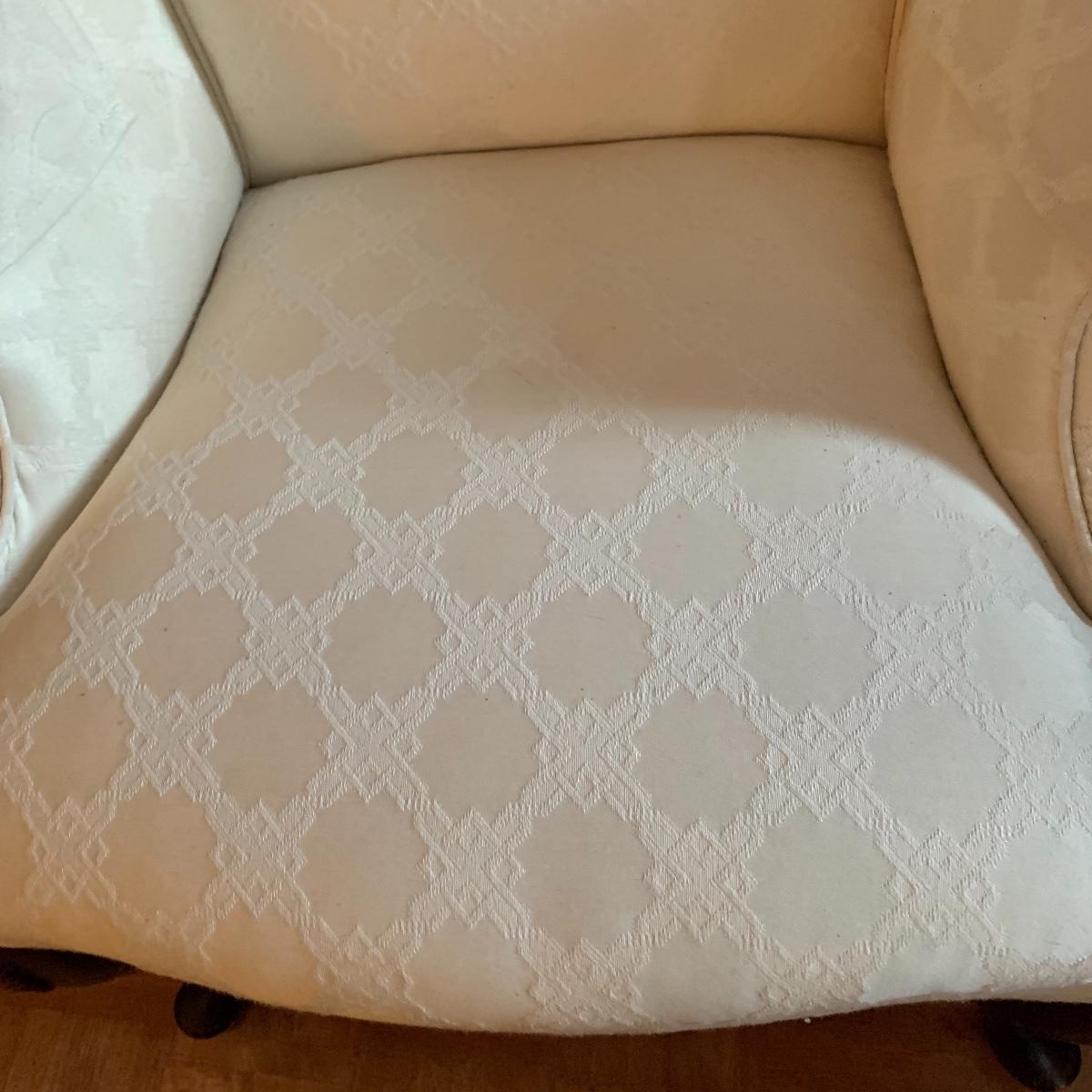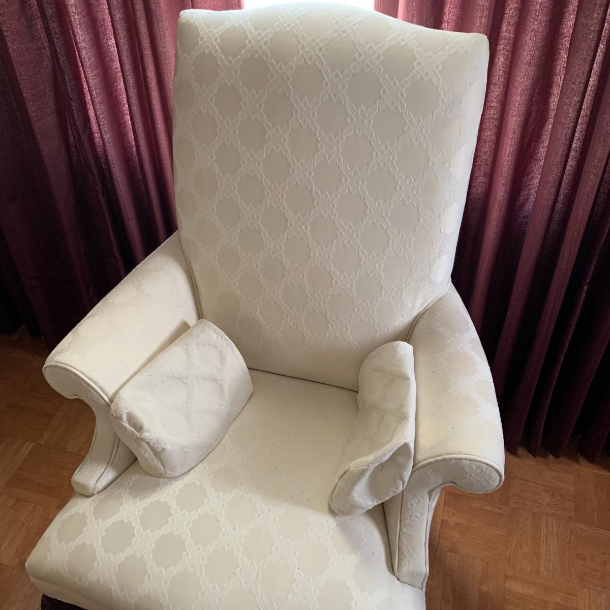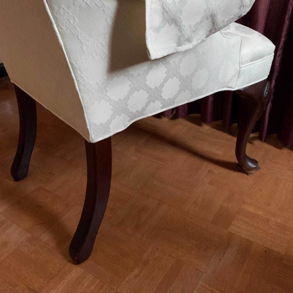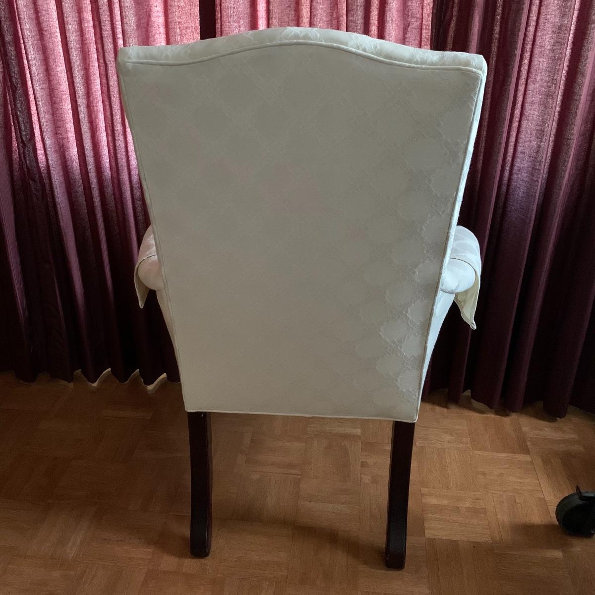This lot includes two nice matching white upholstered armchairs. The upholstery has a lovely embroidered diamond pattern. There are some small speckle stains on the upholstery. The armrests have covers. The chairs have cherry colored wooden legs. The wooden feet show some wear. The chairs measure 25” x 30” x 43”. The seat height is 18”. Local pickup only.