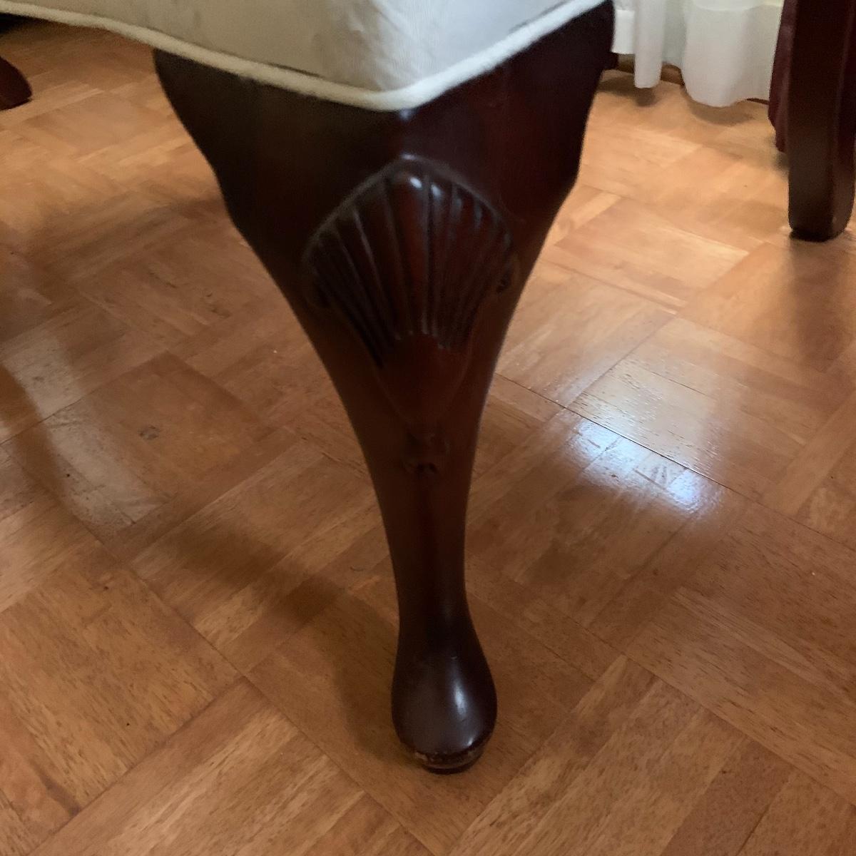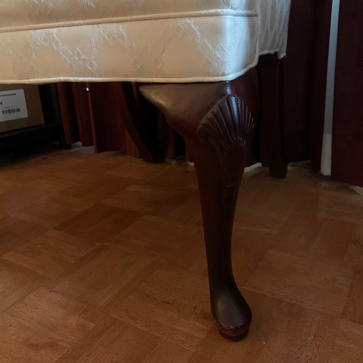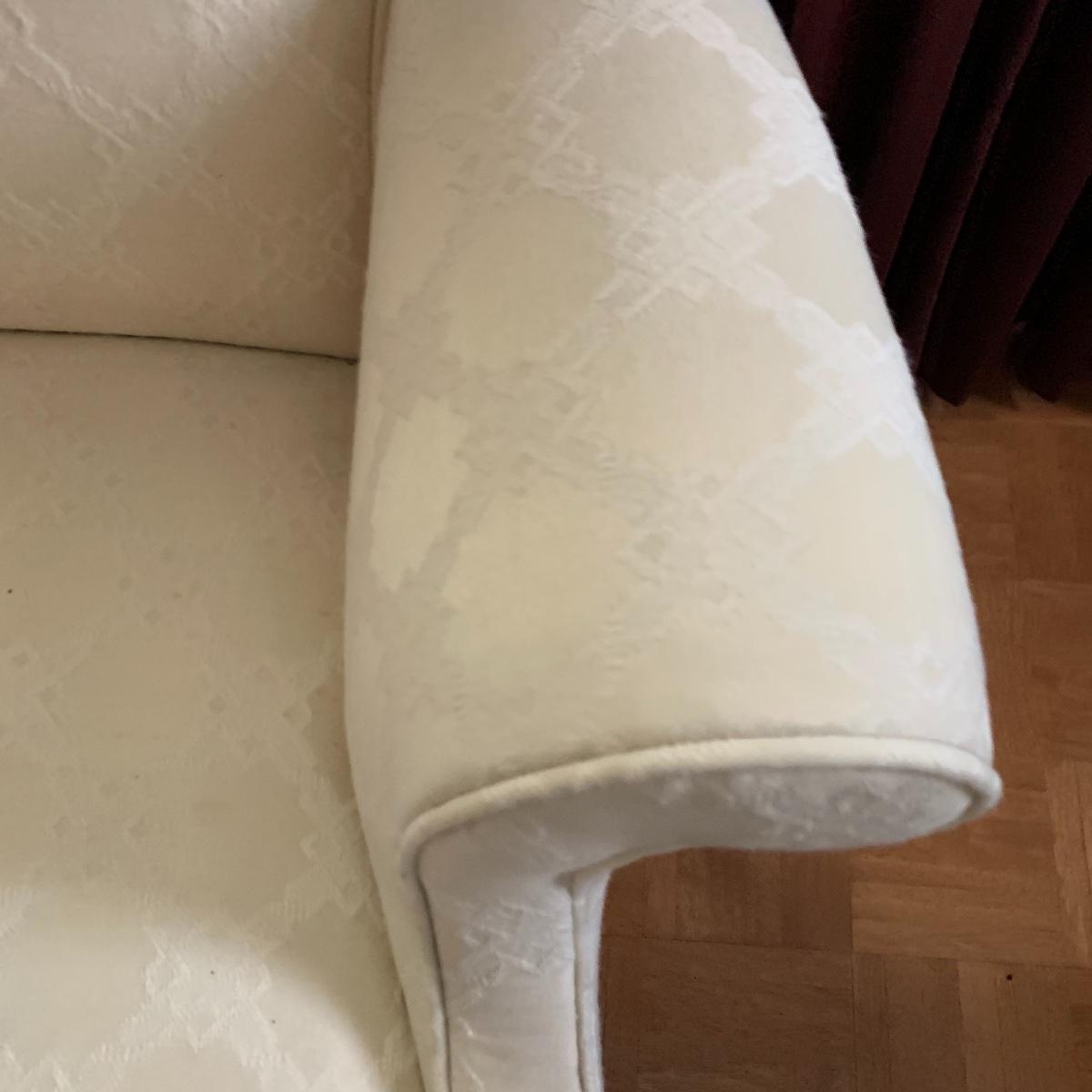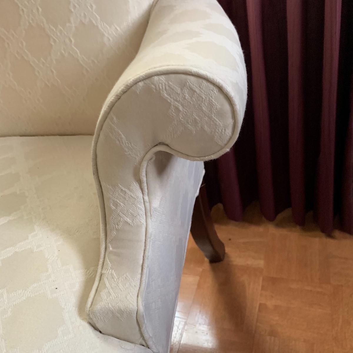 This lot includes two nice matching white upholstered armchairs. The upholstery has a lovely embroidered diamond pattern. There are some small speckle stains on the upholstery. The armrests have covers. The chairs have cherry colored wooden legs. The wooden feet show some wear. The chairs measure 25” x 30” x 43”. The seat height is 18”. Local pickup only.