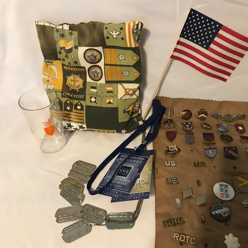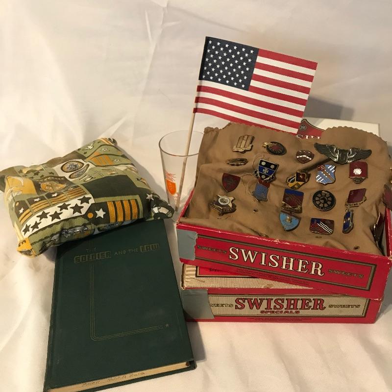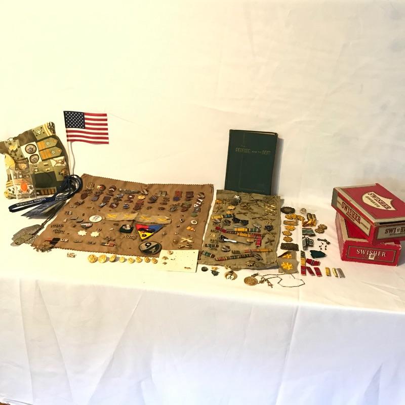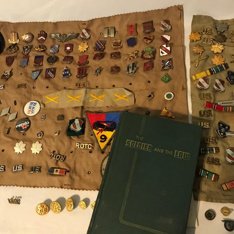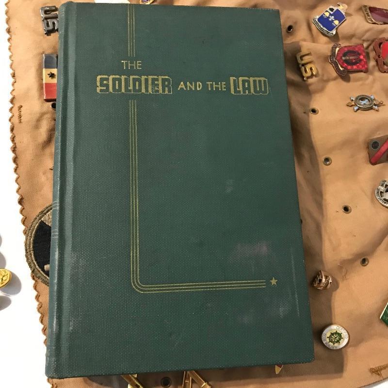 Awesome collection of military history here! Lot includes plenty of pins, patches, dog tags and more. There were at least six pins marked Sterling. See images. We’ve included a small flag, glass and book titled The Soldier and the Law. Lot also includes some non military items like tie clips and pins. See photos for entire lot inventory. Shipping available.