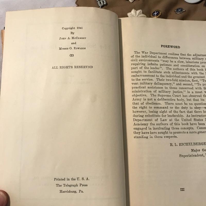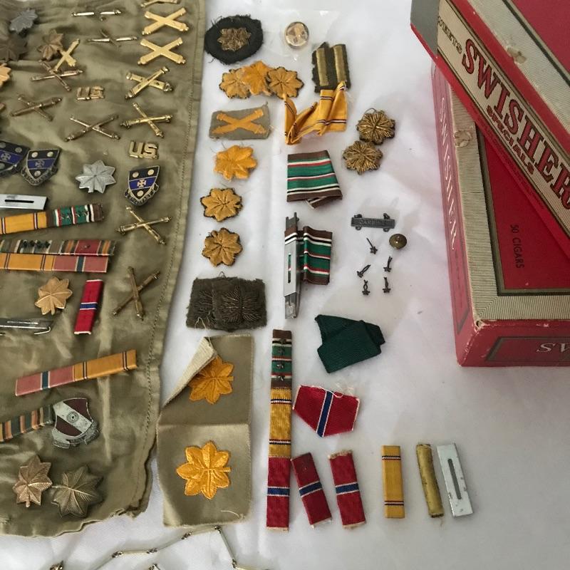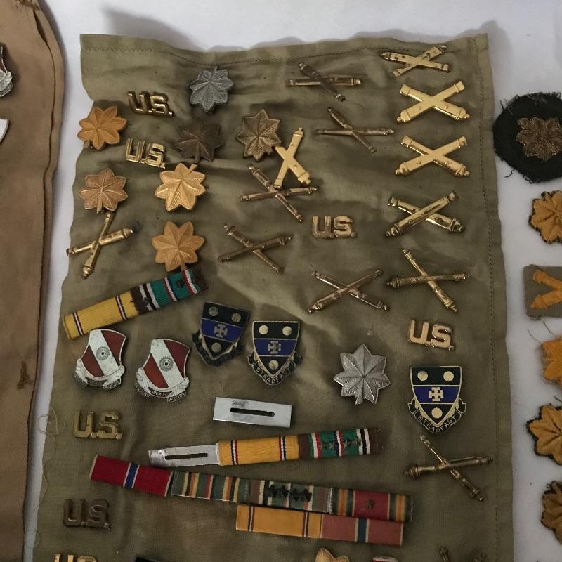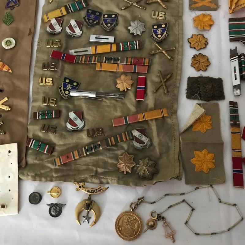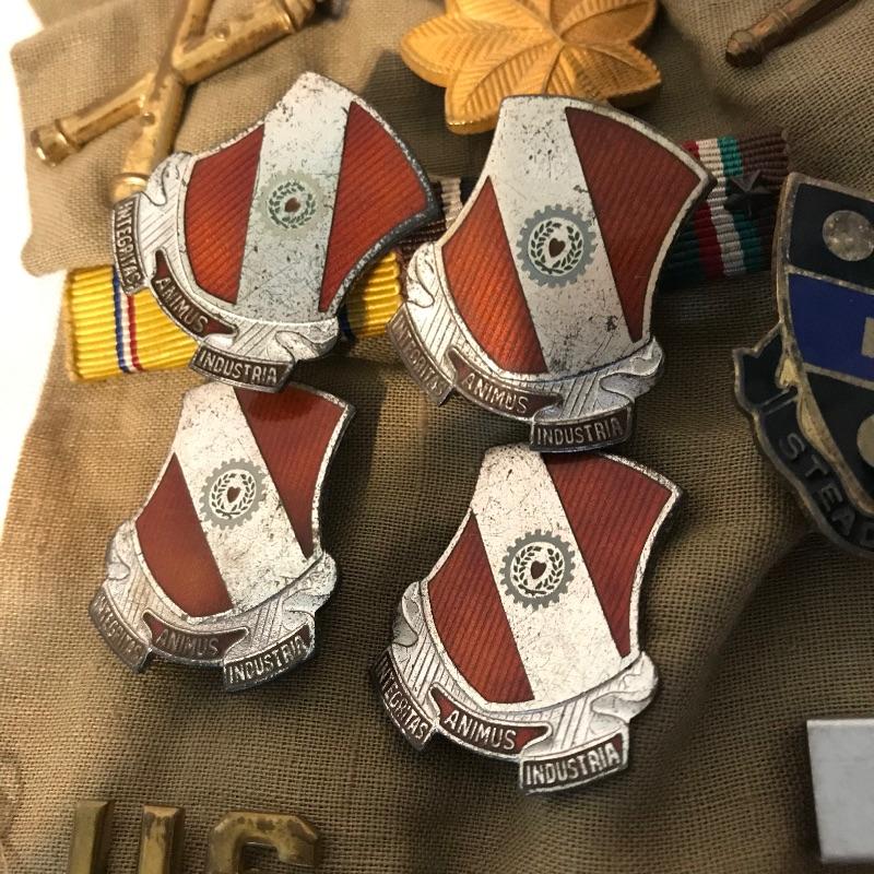 Awesome collection of military history here! Lot includes plenty of pins, patches, dog tags and more. There were at least six pins marked Sterling. See images. We’ve included a small flag, glass and book titled The Soldier and the Law. Lot also includes some non military items like tie clips and pins. See photos for entire lot inventory. Shipping available.