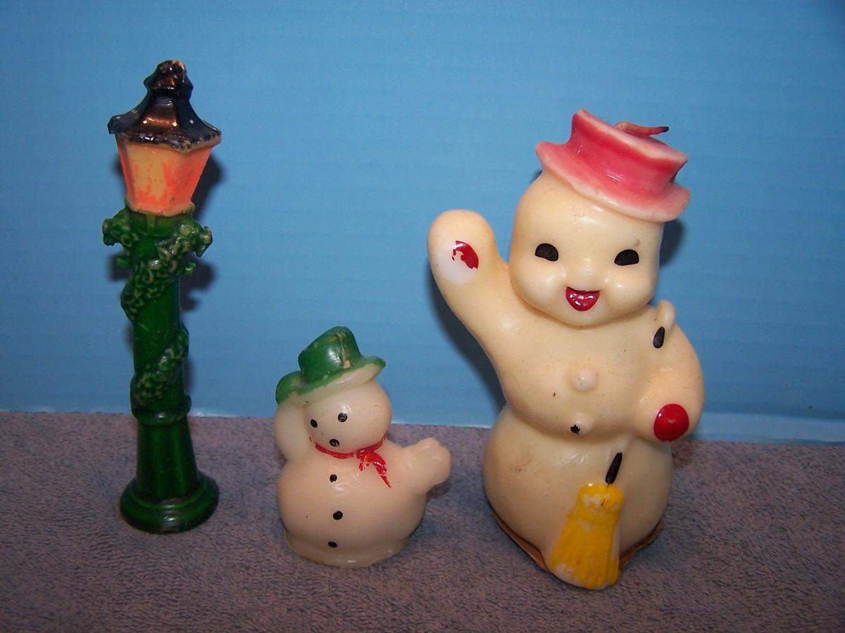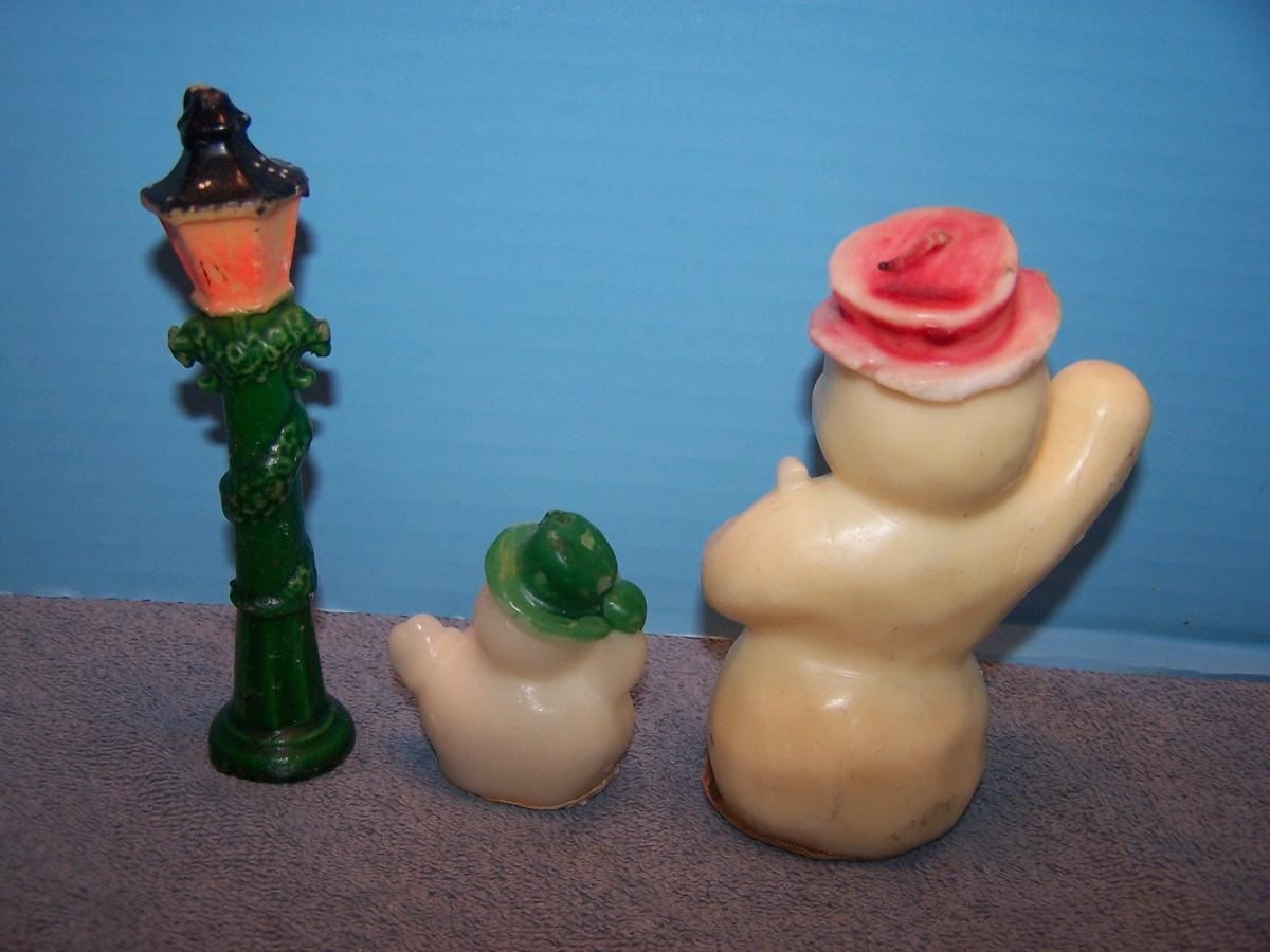 WONDERFUL VINTAGE CHRISTMAS CANDLES!!! THE STREET LAMP CANDLE IS 5 1/2'' TALL. SOME WEAR/DINGS/FADE.