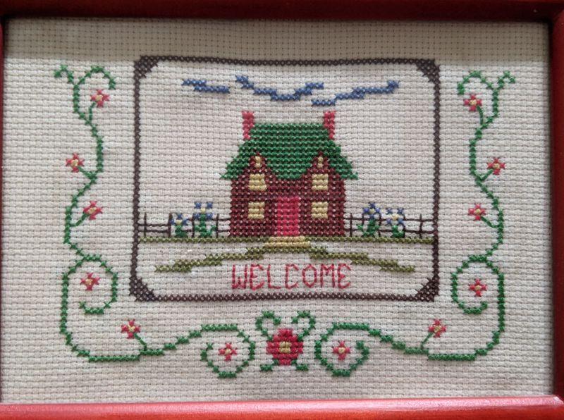 Lot # 8 s -Vintage Counted Cross Stitch in Wooden Frame WELCOME Country House and Garden