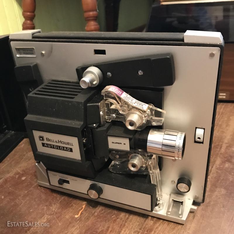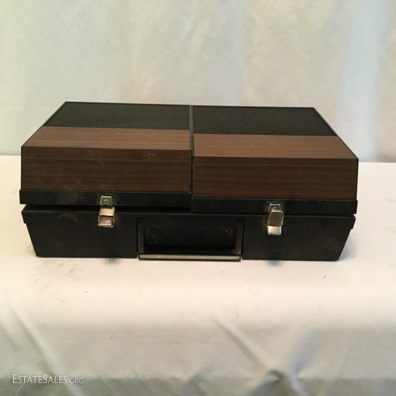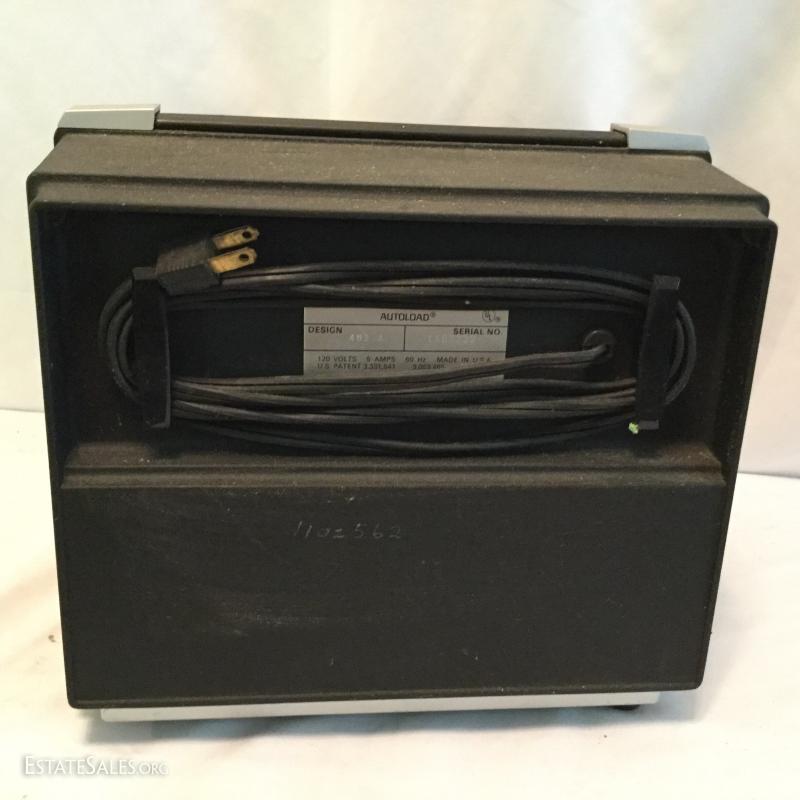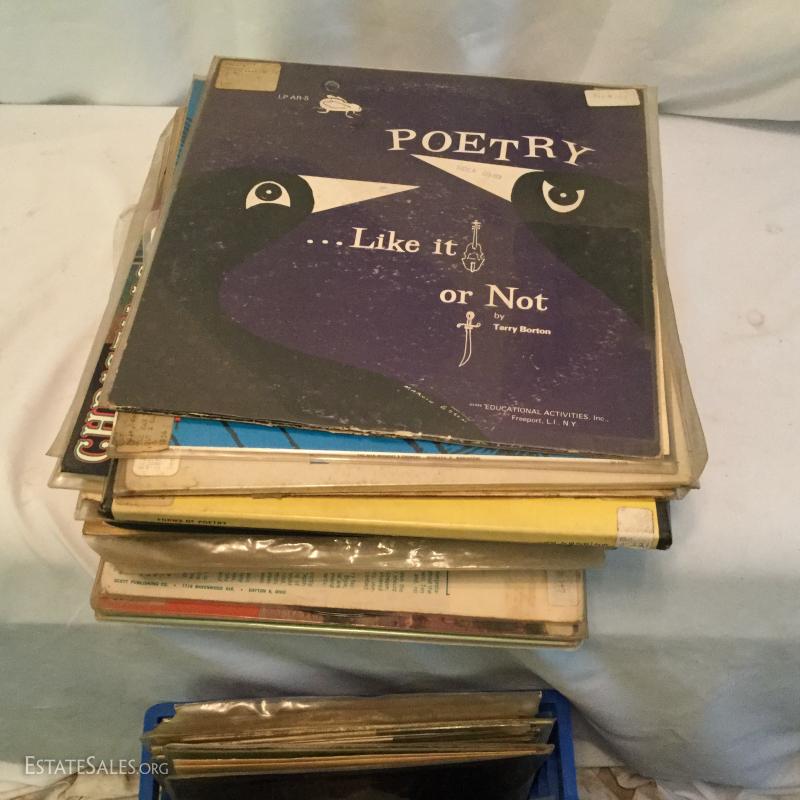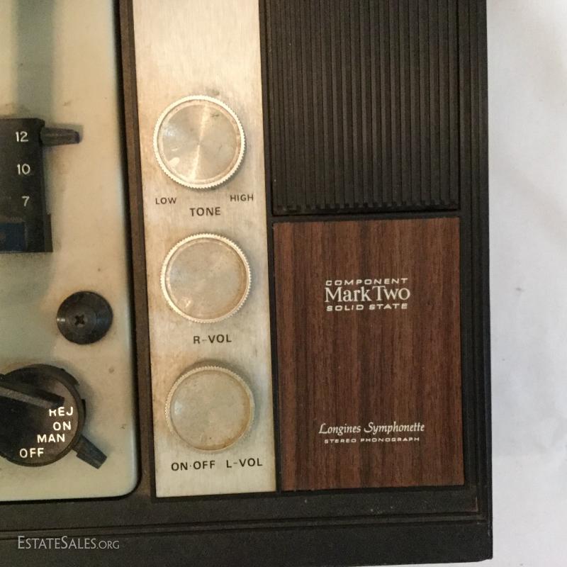 Vintage Longinus Symphonette Stereo Phonograph in case, crafted in Great Britain. A Standard Panasonic PLL Multi Plex Citcuit Record Player and a Bell & Howell Autoload film Projector. Lot also includes about 100 LPs. Mostly poetry. Most in plastic cover and old library records.