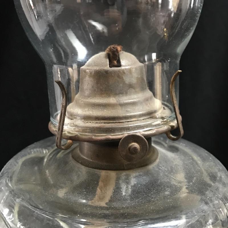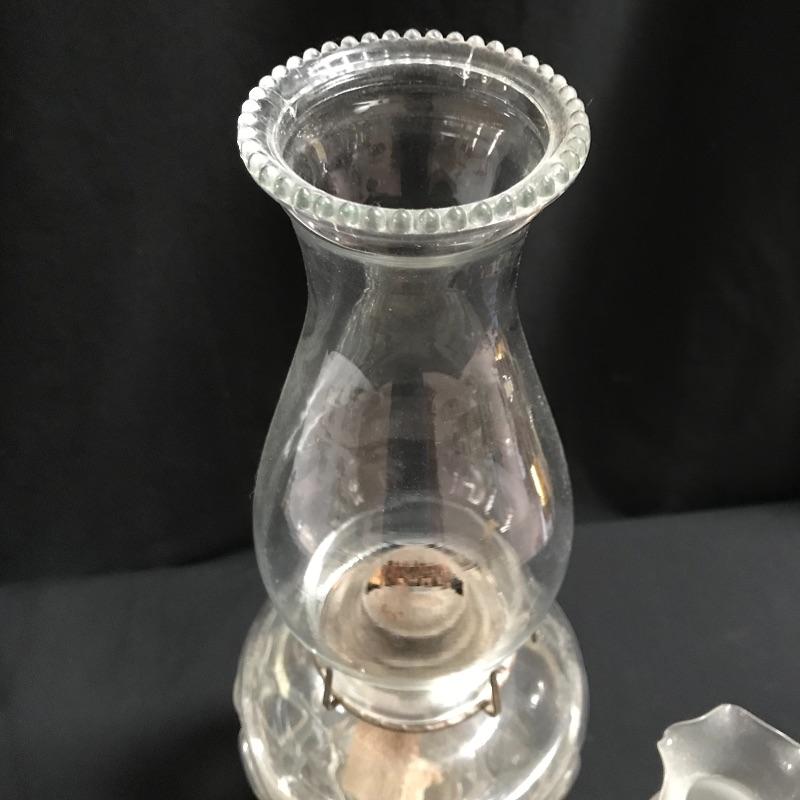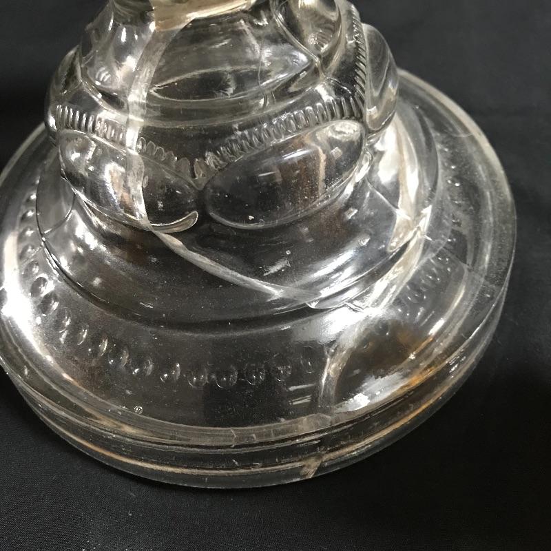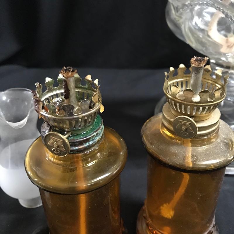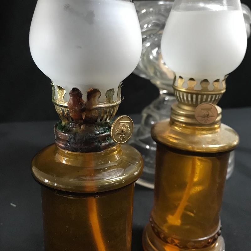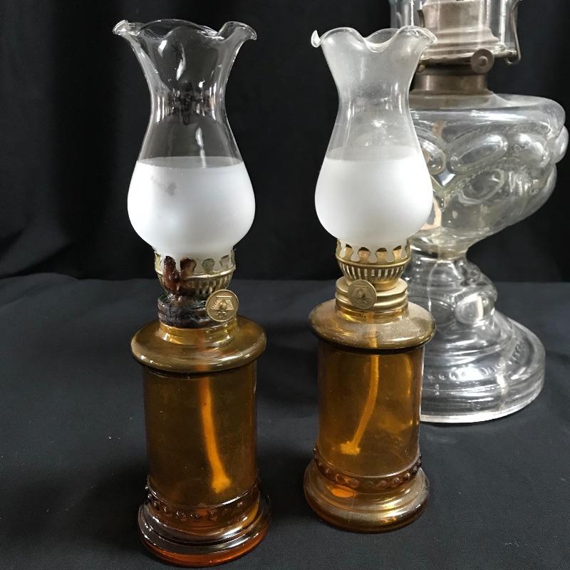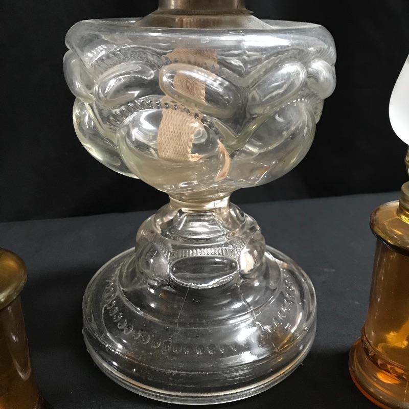 Two small matching Amber bodied oil lamps with a partial frosting on shade. There is also a large cast clear oil lamp with knob topped shade. There appears to be a large crack in the base, but it doesn’t appear to affect the integrity of the base. The large lamp is approximately 17” tall. Shipping available.