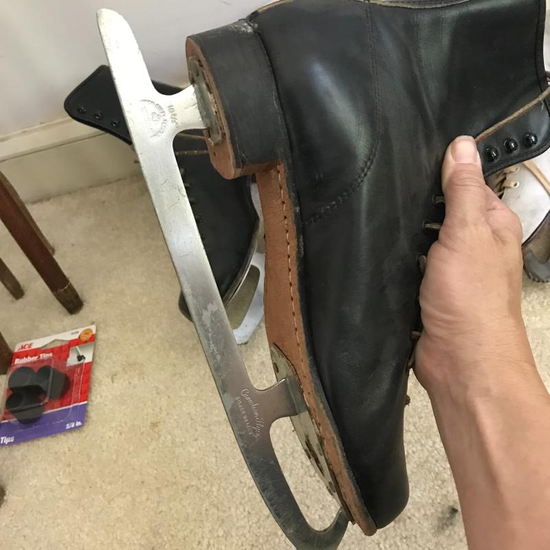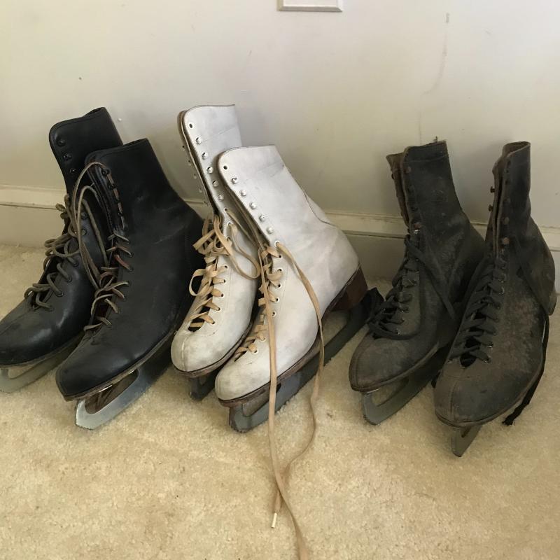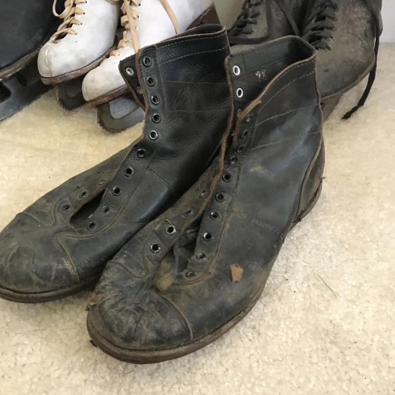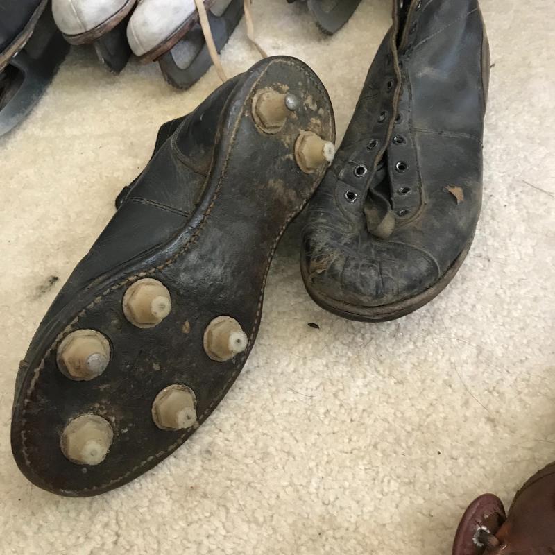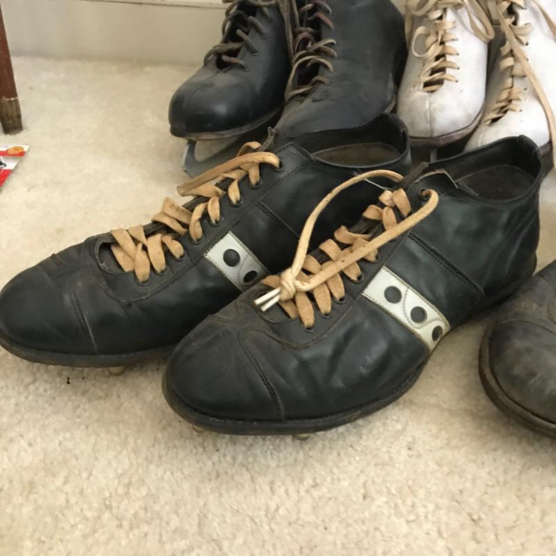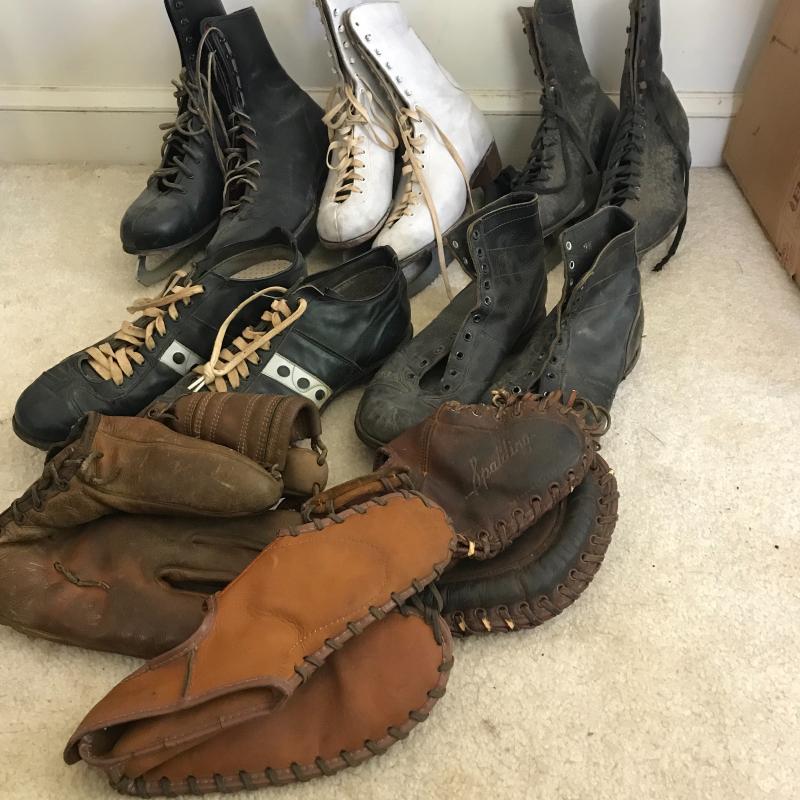 3 pairs of ice skates and two pairs of vintage sport spikes. Sizes not found on most. Also, 3 leather ball gloves. More of a collectible lot than functional but some may still have some life in them. Lot is available for shipping or local pick up.