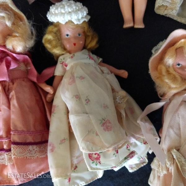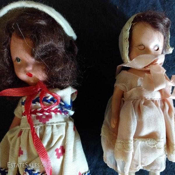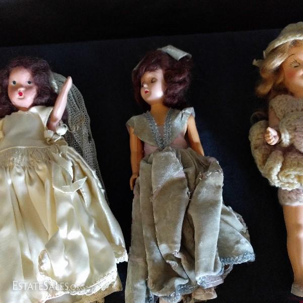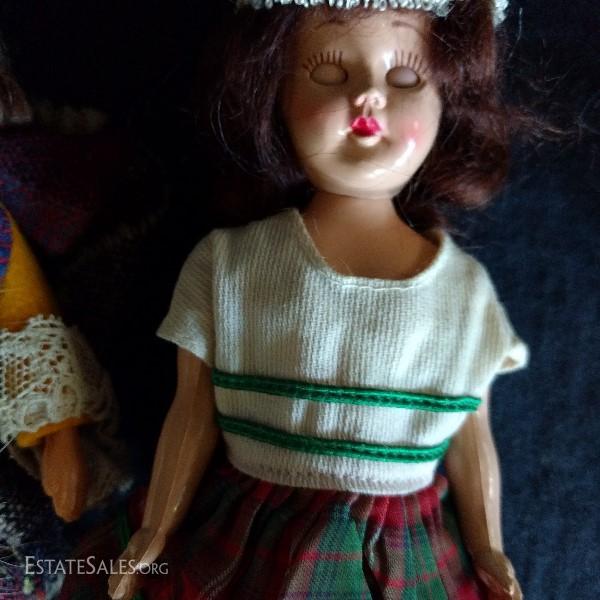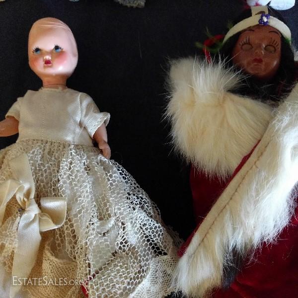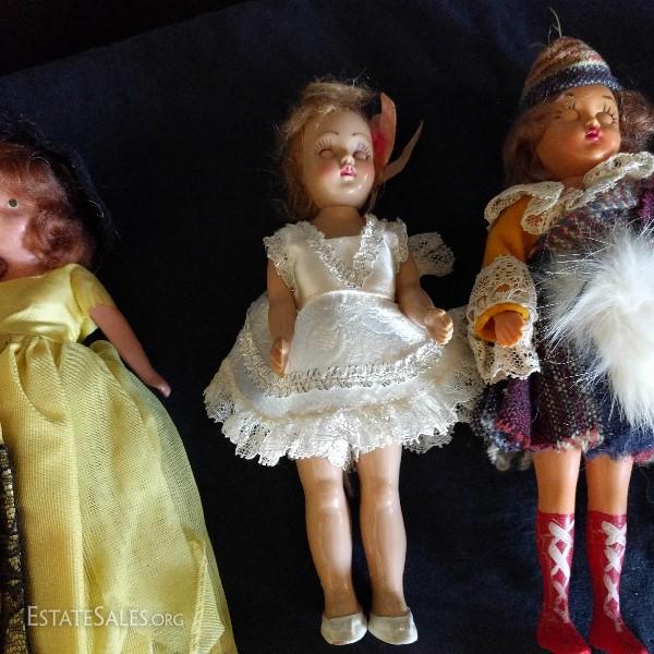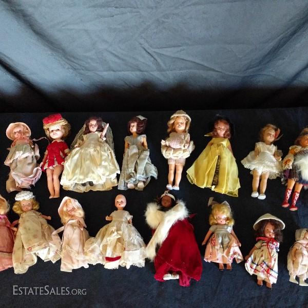16 Vintage Storybook Dolls with original costumes and back stamp. Two varieties of doll within the lot: bisque and hard plastic. 3 dolls have detached arms; 1 with a detached head. Reminder: out-of-state auction winners have S&H/alternate payment options.