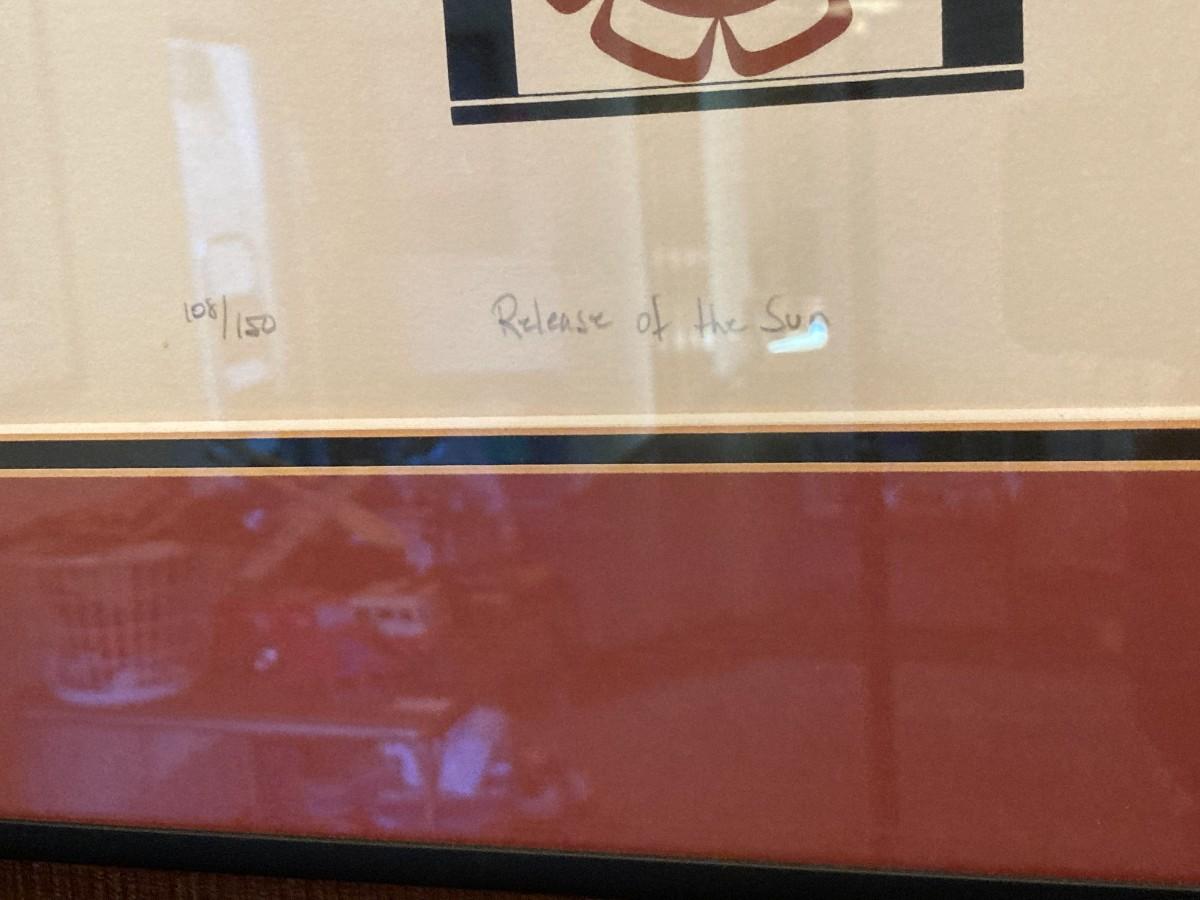3rd piece of a Trilogy. Signed and numbered. 1977. Title: Release of the Sun. Edition: 108/150. Framed and matted. Approx 28x22.