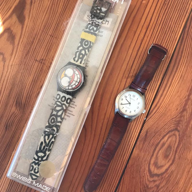 This lot contains one Swatch in original box and one Timex watch. Each has been worn. Swatch is part of the Artist’s Collection, “Arnould Fashions” by Jak Arnould. Timex is Carriage design. Shipping available or local pickup in Asheville, NC.
