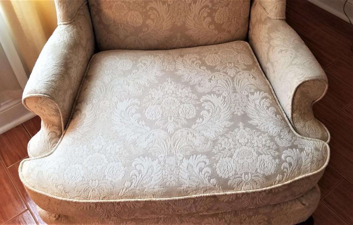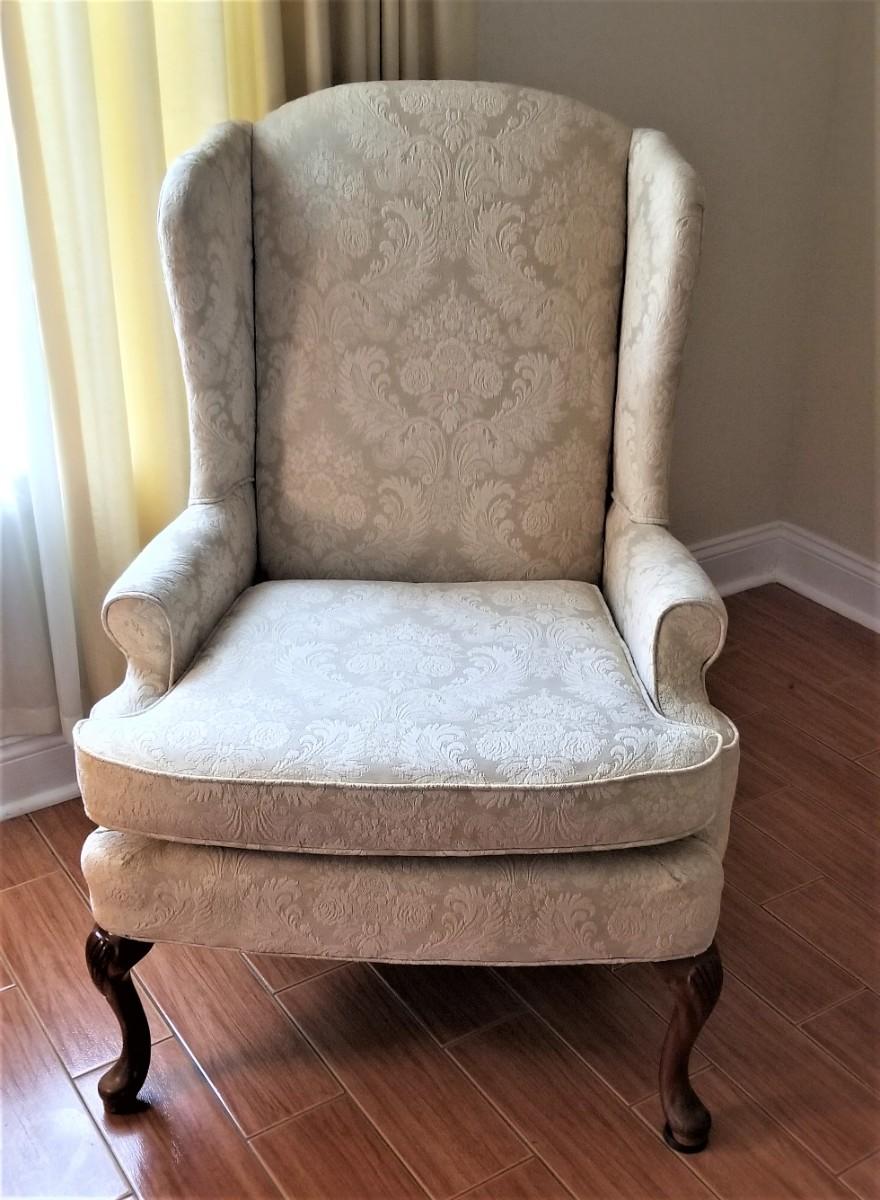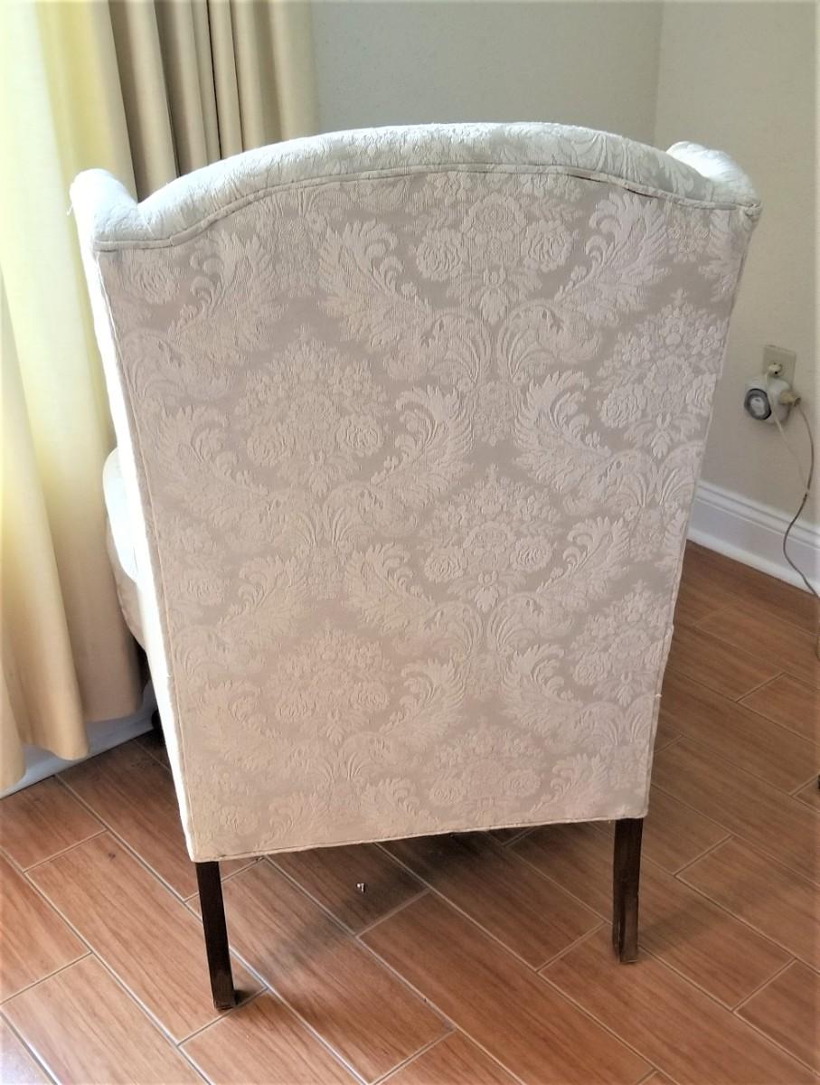 From the Pem-Kay Furniture Co. of Conover, N.C. - traditional winged-back chair in an ivory damask. Super clean - the arm covers have never been taken out of the packaging. 28" across, 23" deep, 43.5" tall. Queen Anne style legs. Finished all the way around - a sign of quality.