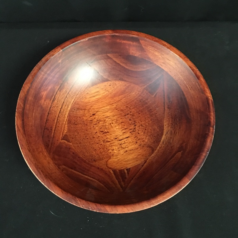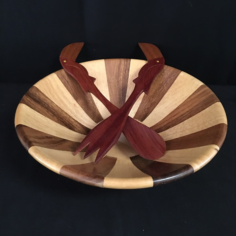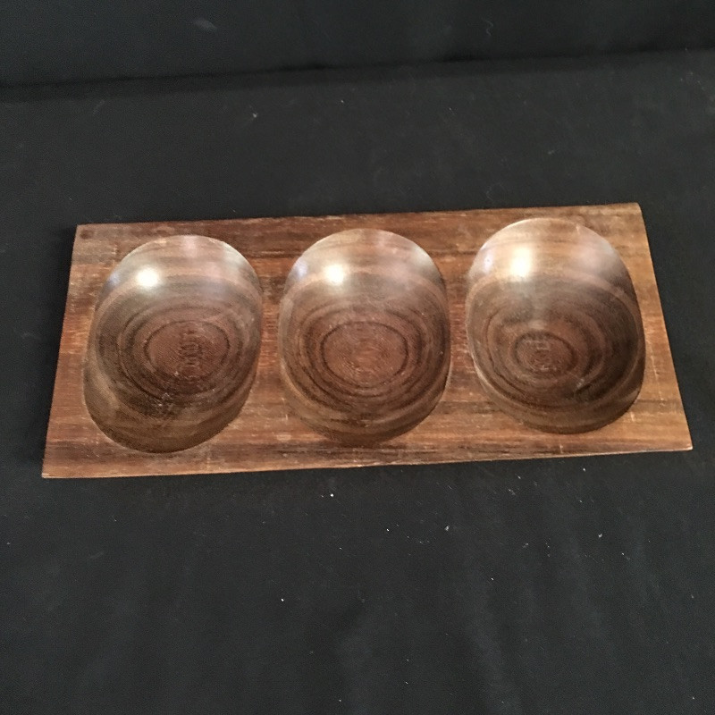 Add some character to the kitchen with this nice collection of wooden salad bowls with wooden serving utensils, two wooden plates, a three bowl tray and more. Largest plate measures 14”D. Get back to nature with these neat wooden bowls.