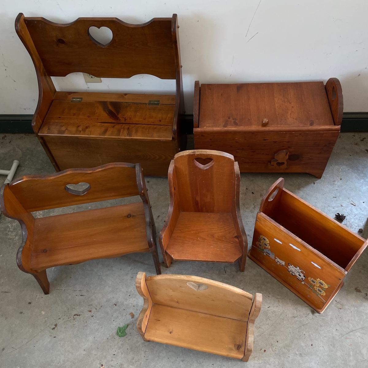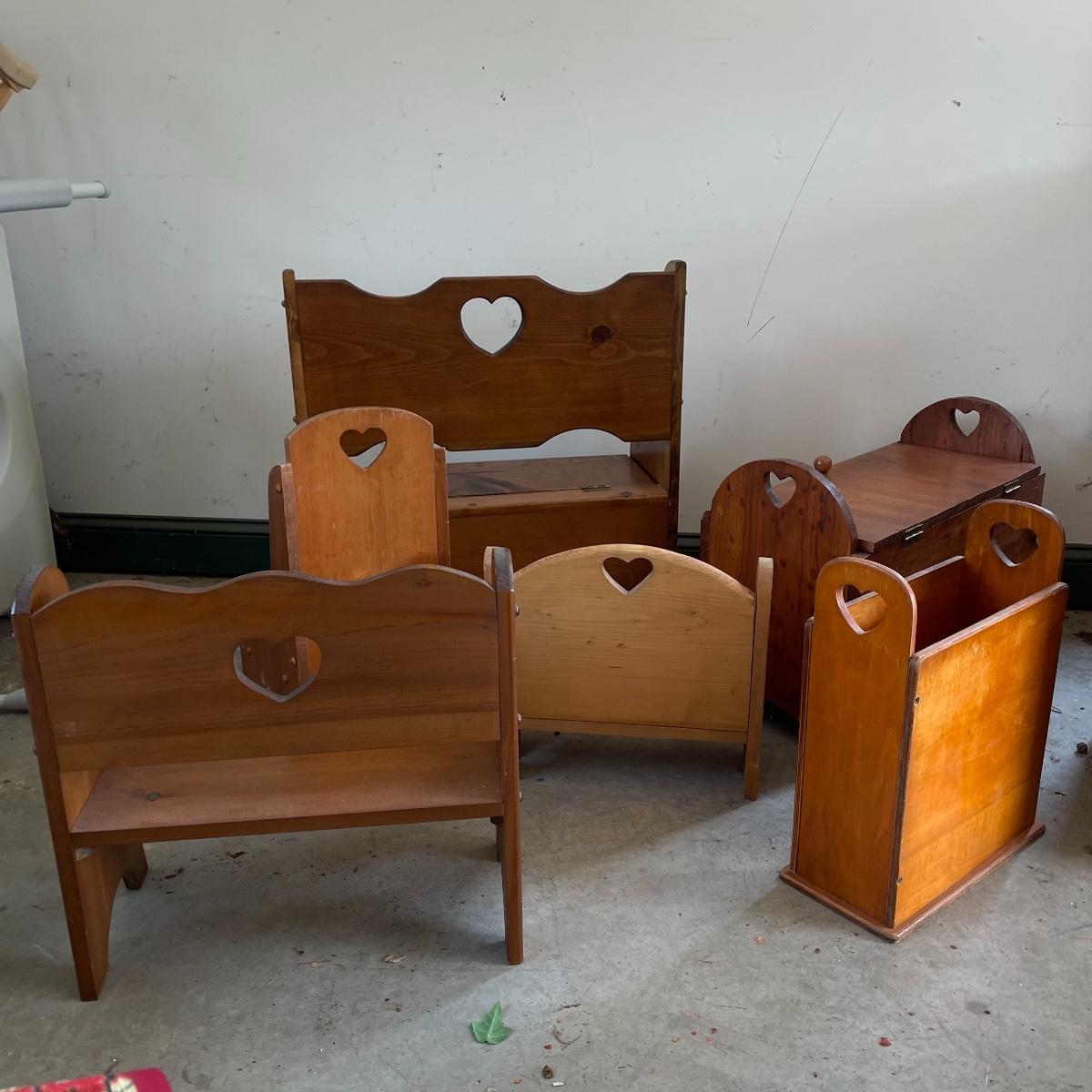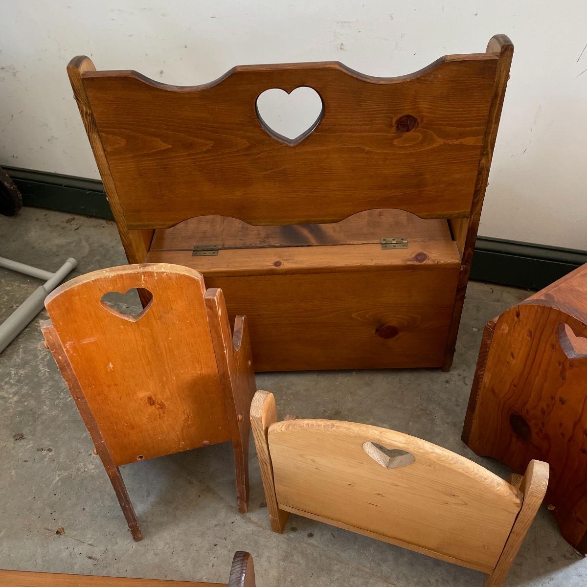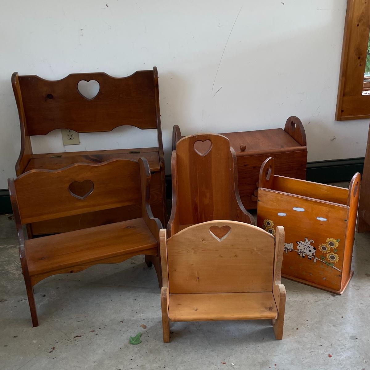 This lot includes five adorable pieces of solid wood furniture with hearts, and one pressed wood crate with painted farm scene. While this lot is geared for kids or doll collectors, even larger humans can appreciate these little pieces for decor! Two larger pieces are chests perfect for storing toys or sentimentals. The bend with the high back measures approximately 25.5” x 11.5” x 28” with a seat height at 13”. Lot features another bench and seat for little ones and an even smaller bench perfect for dolls or stuffed animals. See images. Local pick up only.