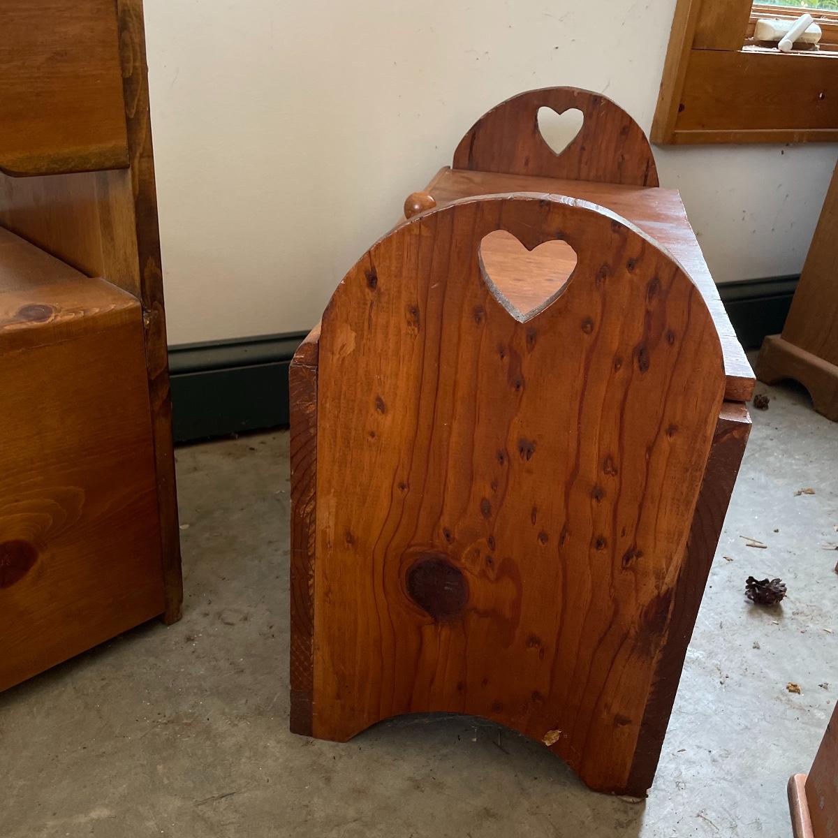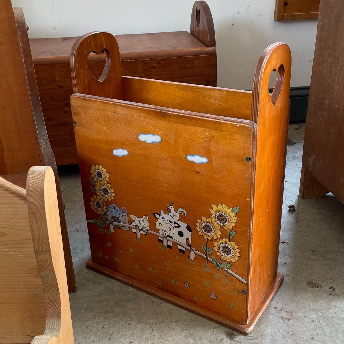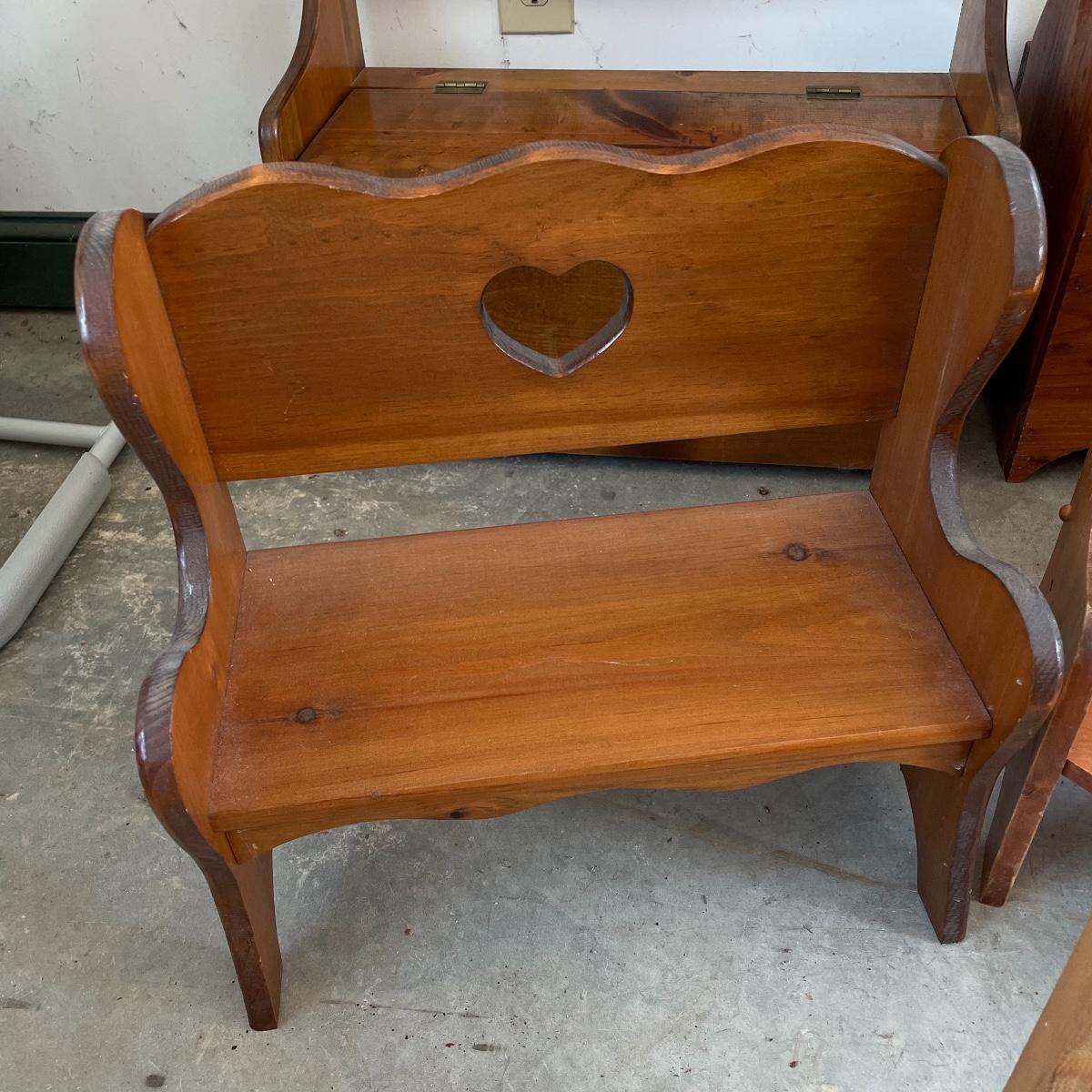This lot includes five adorable pieces of solid wood furniture with hearts, and one pressed wood crate with painted farm scene. While this lot is geared for kids or doll collectors, even larger humans can appreciate these little pieces for decor! Two larger pieces are chests perfect for storing toys or sentimentals. The bend with the high back measures approximately 25.5” x 11.5” x 28” with a seat height at 13”. Lot features another bench and seat for little ones and an even smaller bench perfect for dolls or stuffed animals. See images. Local pick up only.