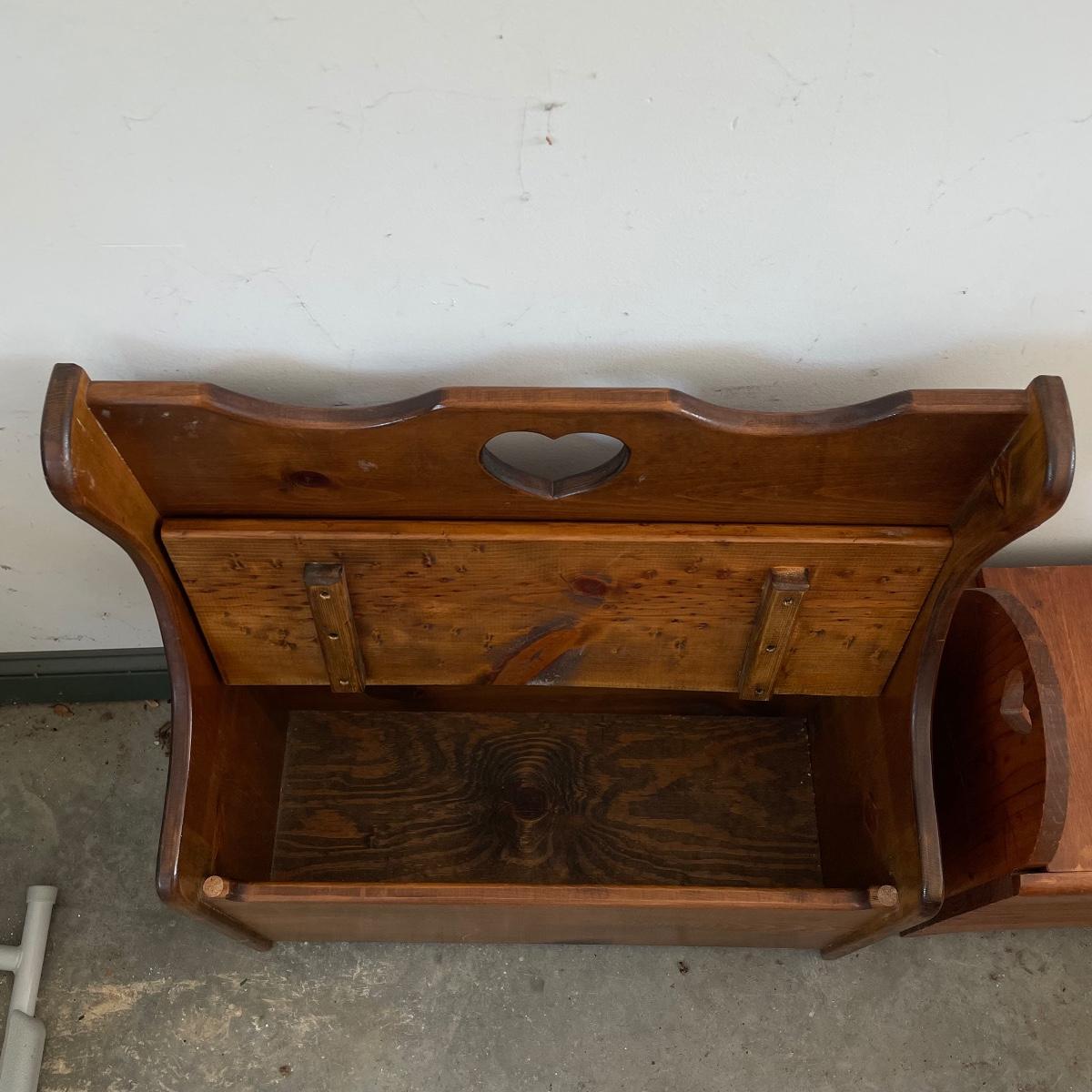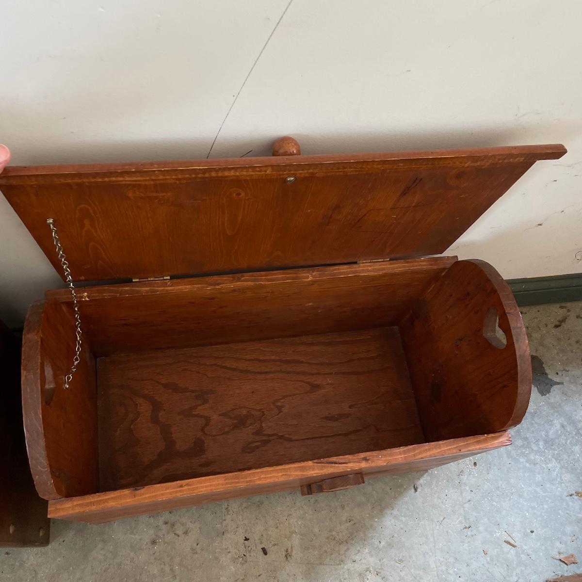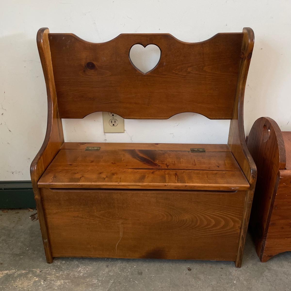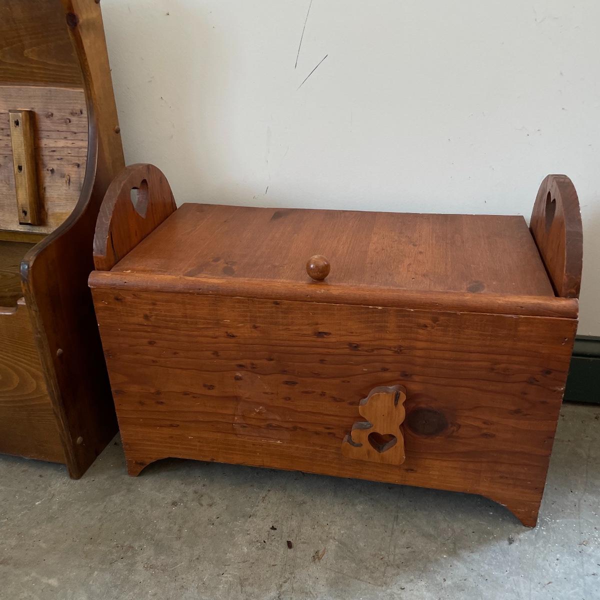 This lot includes five adorable pieces of solid wood furniture with hearts, and one pressed wood crate with painted farm scene. While this lot is geared for kids or doll collectors, even larger humans can appreciate these little pieces for decor! Two larger pieces are chests perfect for storing toys or sentimentals. The bend with the high back measures approximately 25.5” x 11.5” x 28” with a seat height at 13”. Lot features another bench and seat for little ones and an even smaller bench perfect for dolls or stuffed animals. See images. Local pick up only.