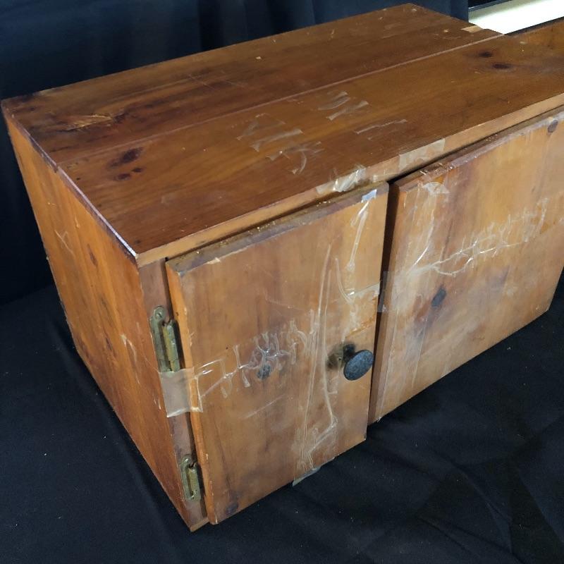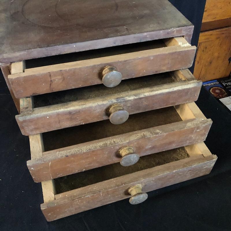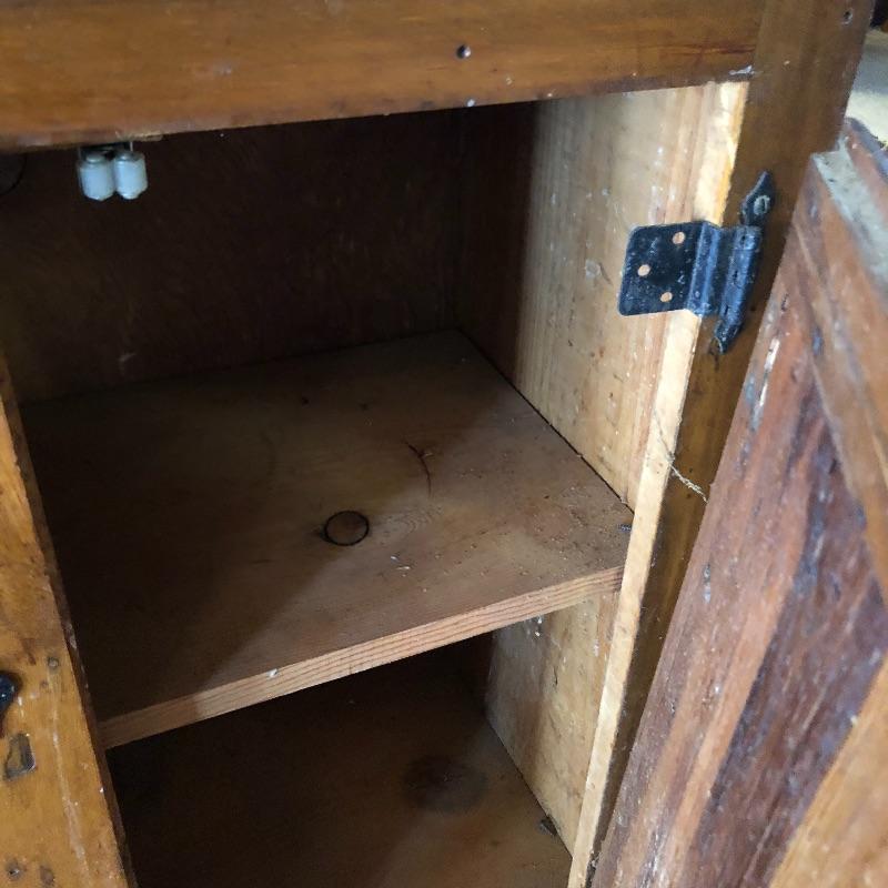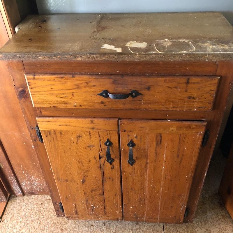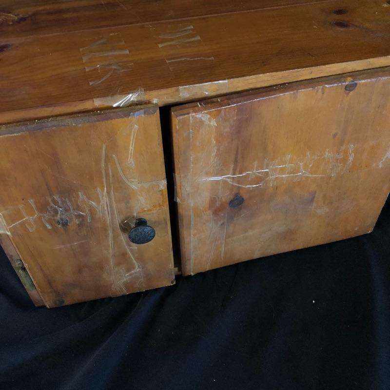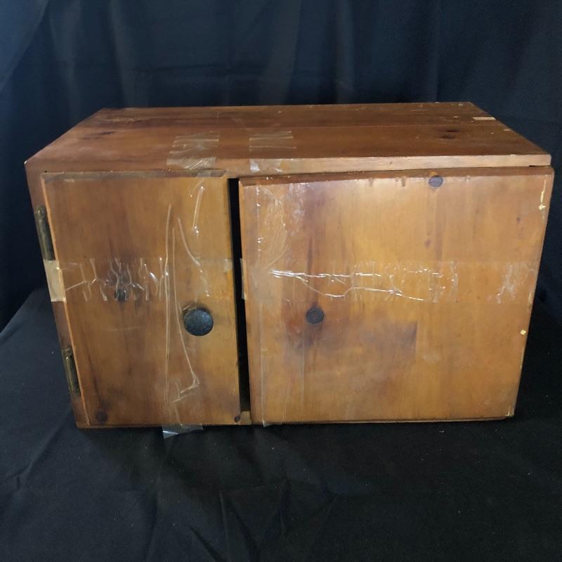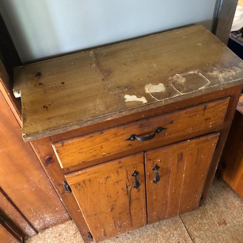 This lot contains three handmade cabinets - perfect for a workshop. The tallest cabinet measures 24” x 12.5” x 36”. One of the cabinet doors is loose as it needs a screw on the hinge. The top is also loose. The smallest cabinet has four drawers. It measures approximately 15” x 13” x 11”. The third cabinet has two doors and has old tape on it. It measures 20.5” x 12” x 13.5”. Local pick up only.