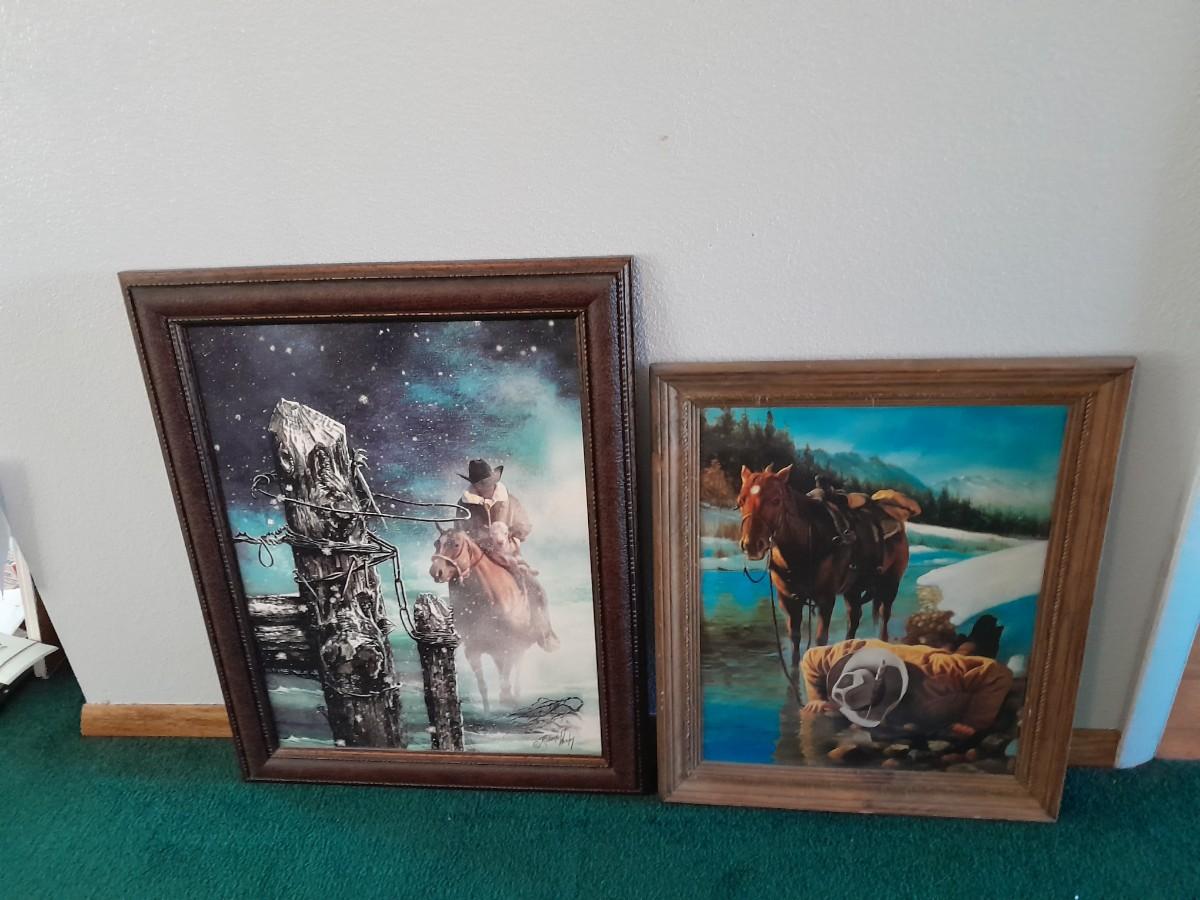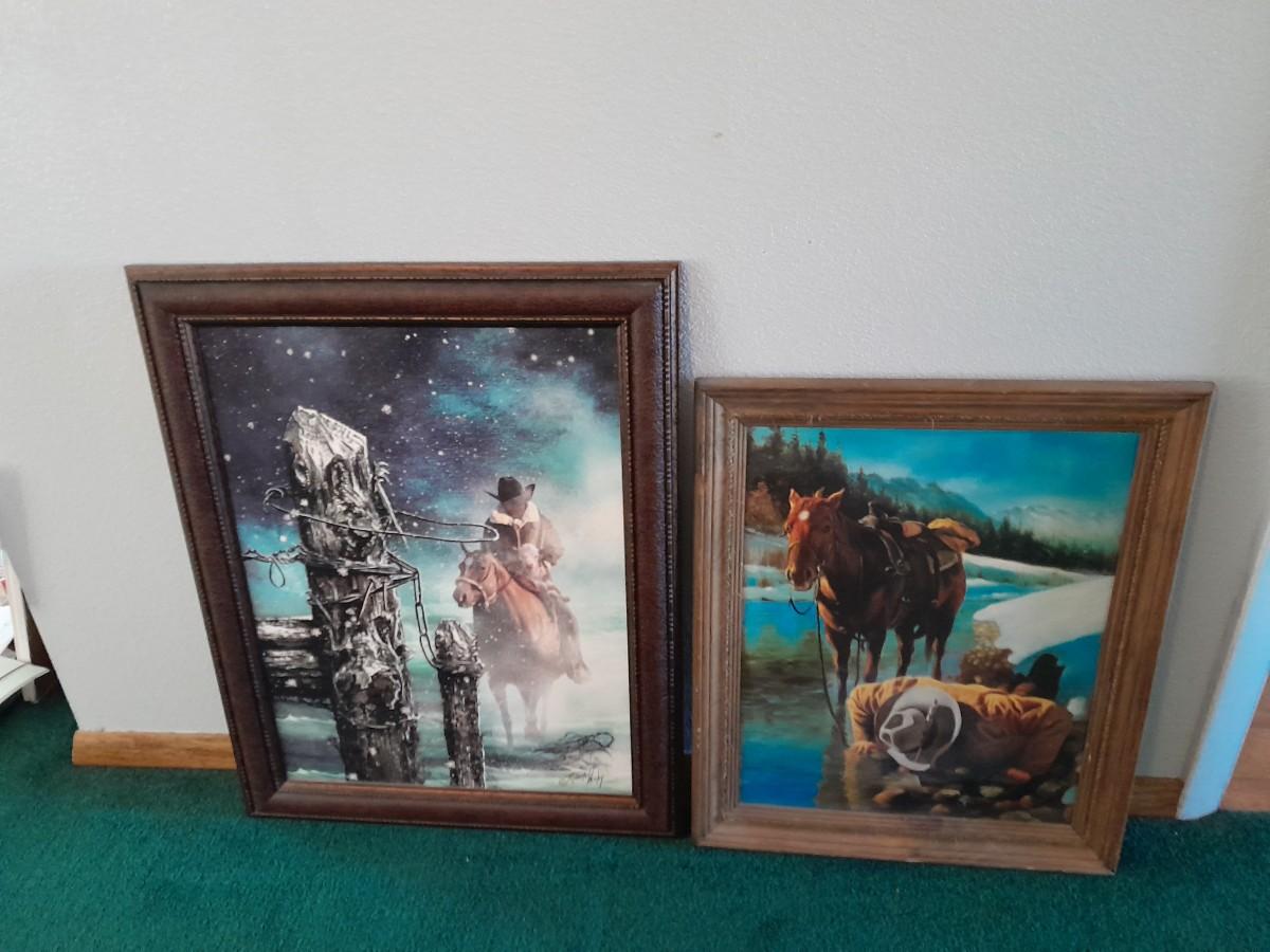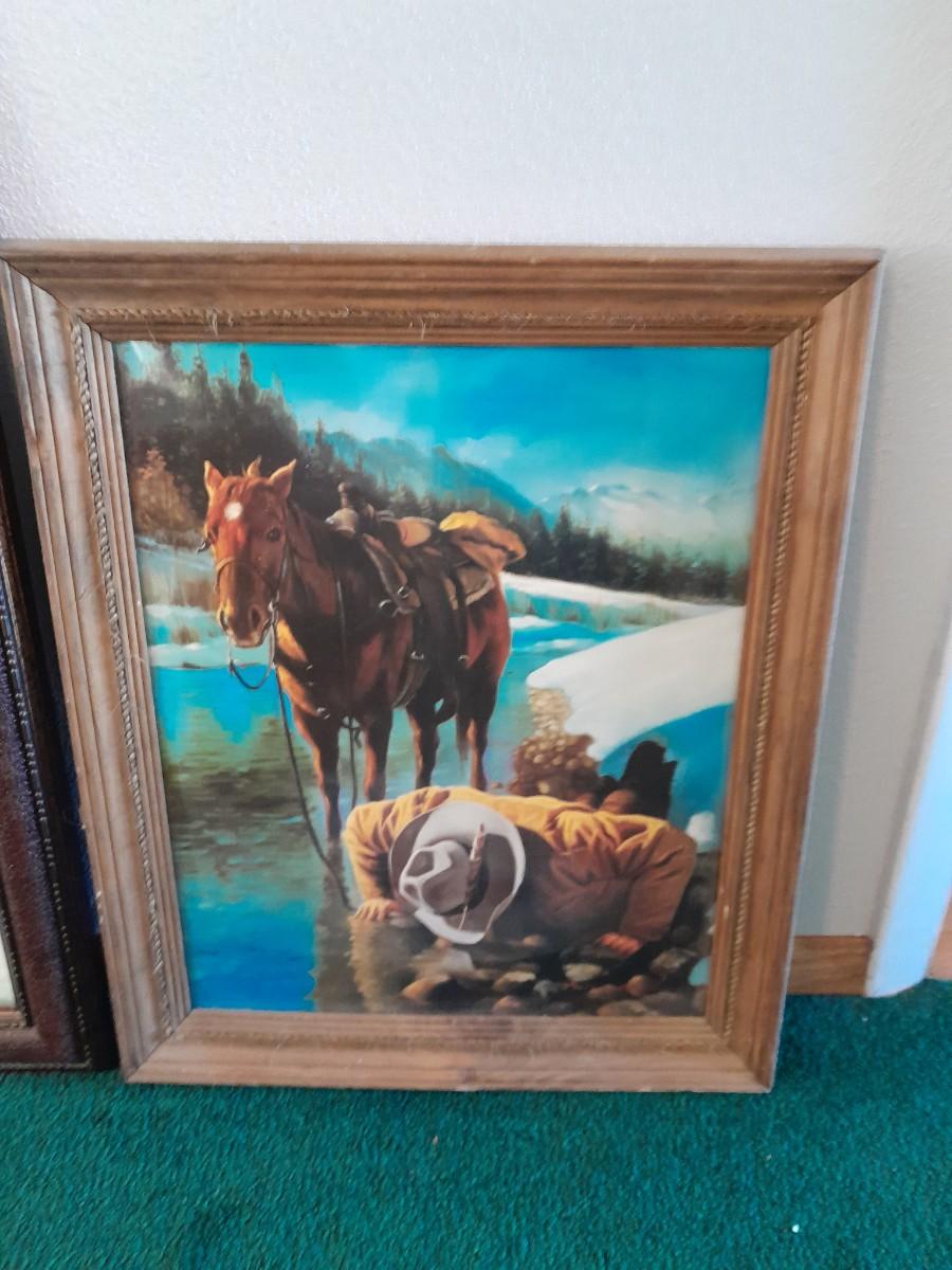 TWO FRAMED PICTURESARTIST SIGNED "ORPHAN" FROM STONE CREST DESIGNS, 23" X 29" AND COWBOY DRINKING FROM A STREAM 12" X 24"