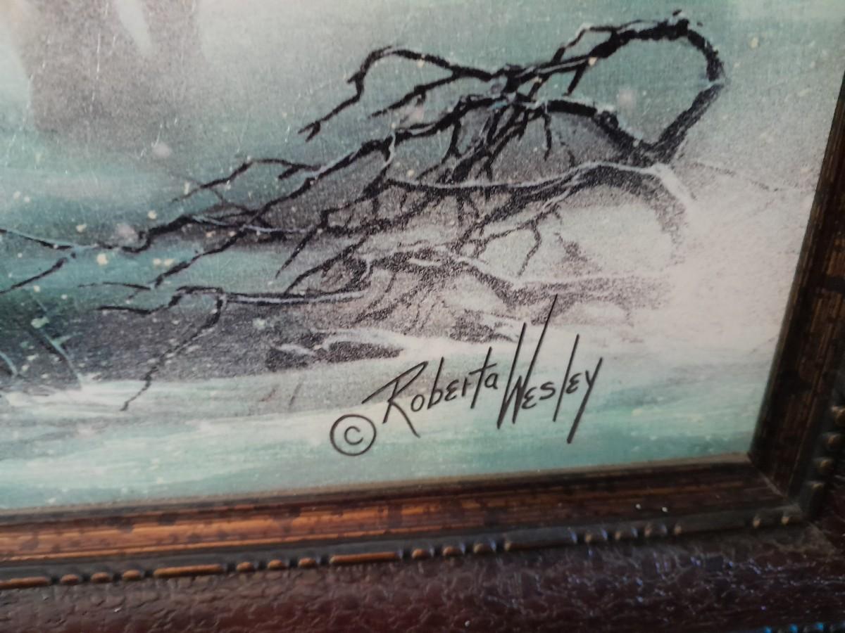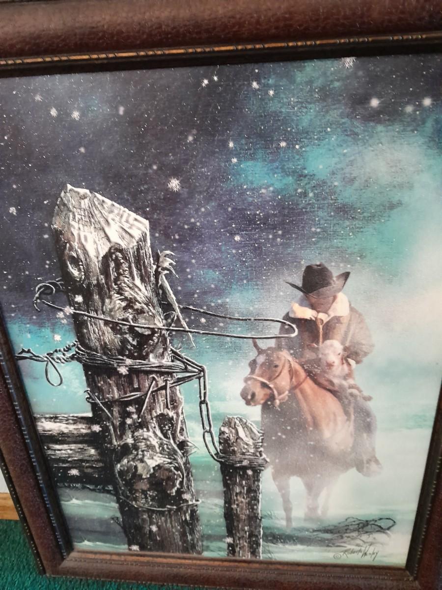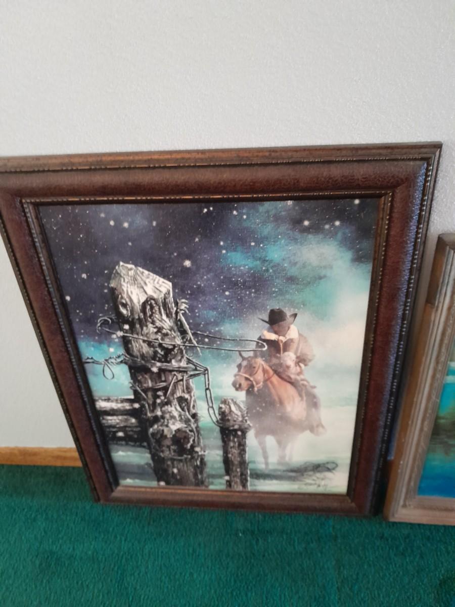 TWO FRAMED PICTURESARTIST SIGNED "ORPHAN" FROM STONE CREST DESIGNS, 23" X 29" AND COWBOY DRINKING FROM A STREAM 12" X 24"