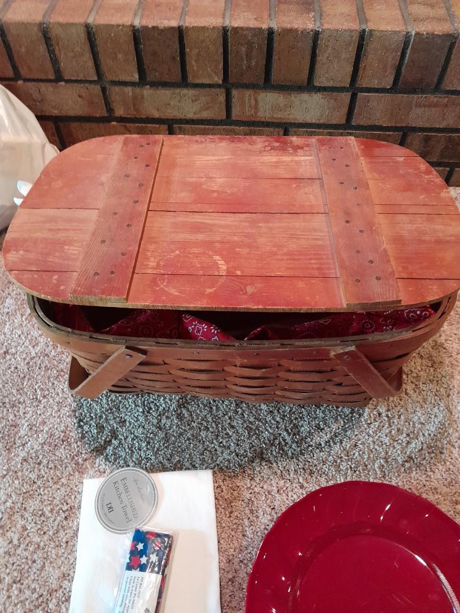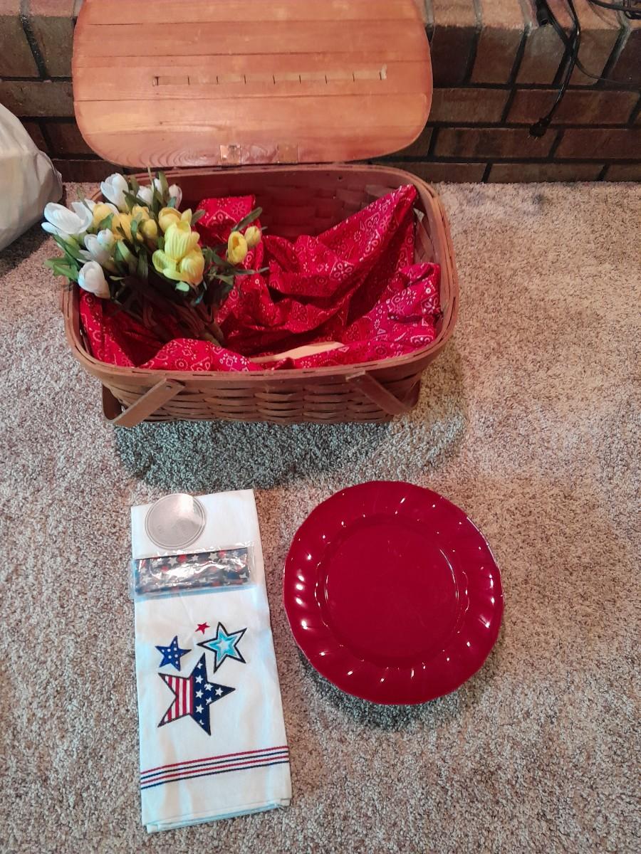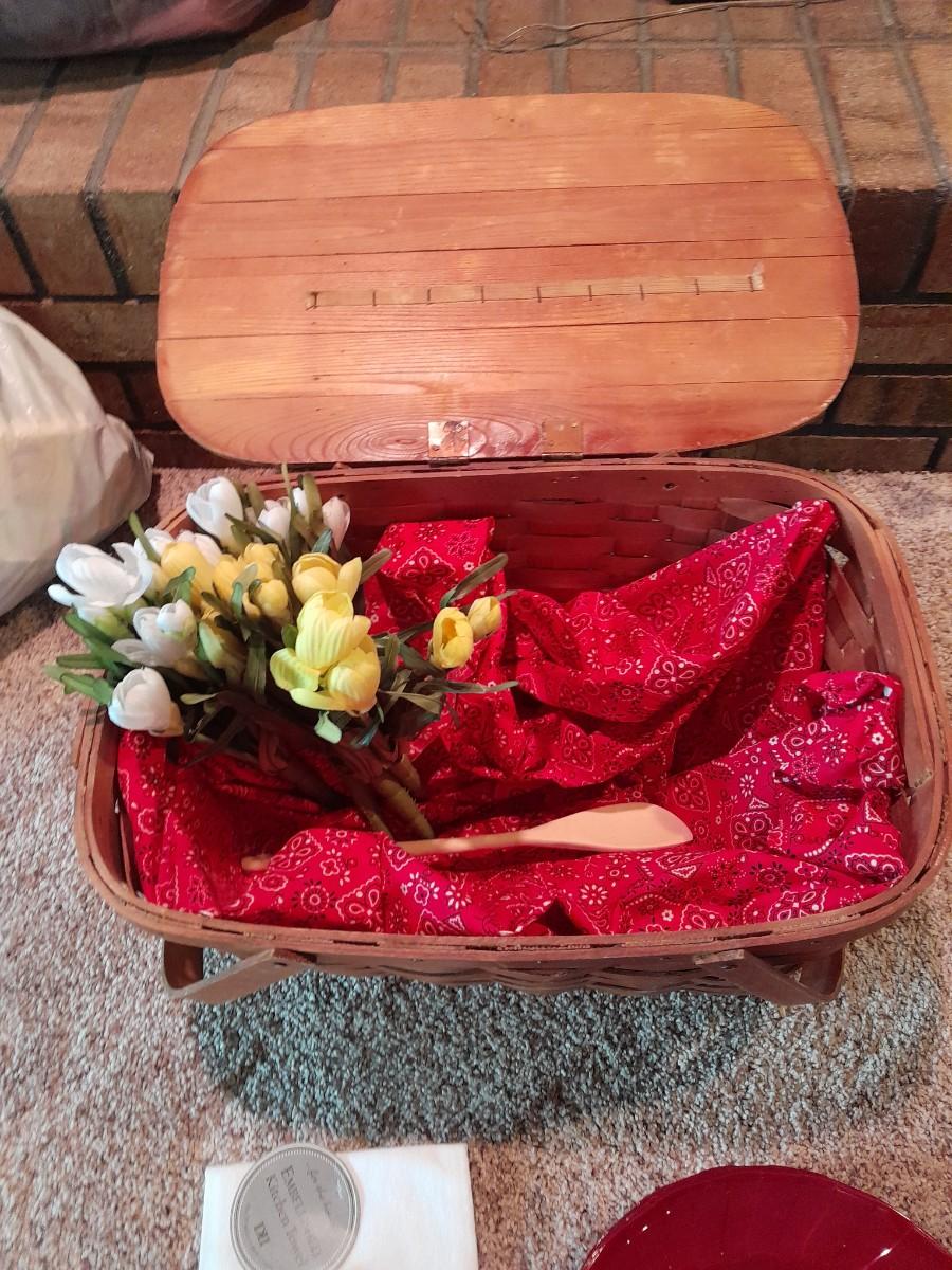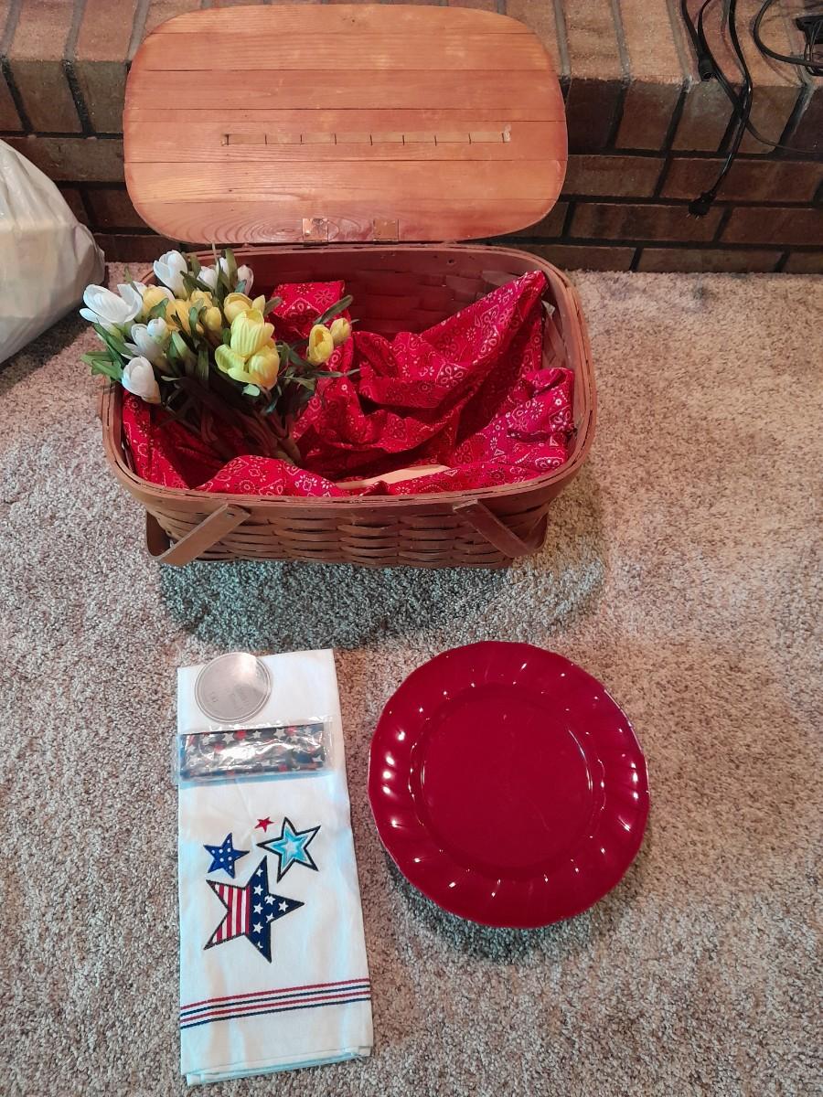 WOOD / WICKER VINTAGE PICNIC BASKET WITH BOQUE OF FAUX FLOWERS, NECK COOLER, KITCHEN TOWEL, AND PLASTIC PLATES