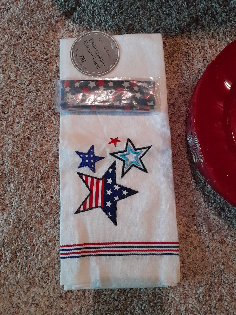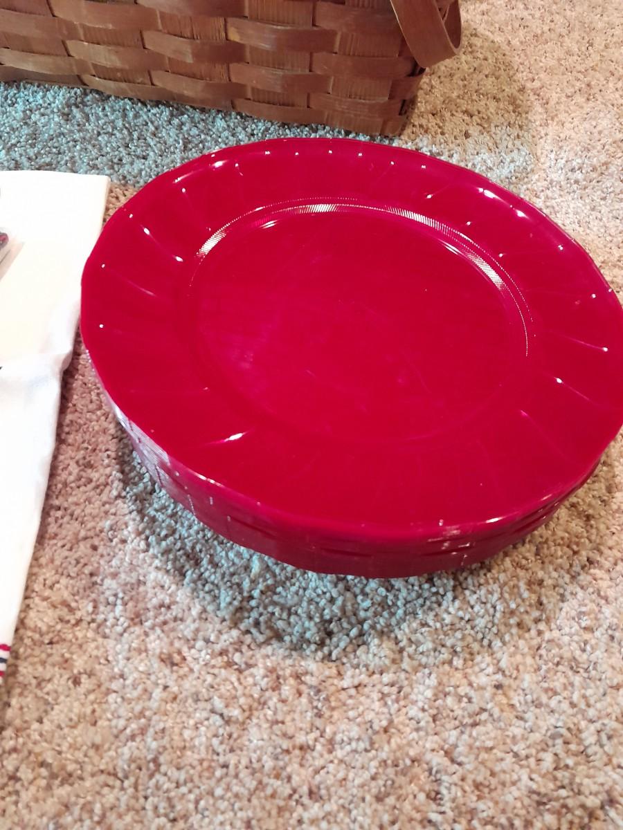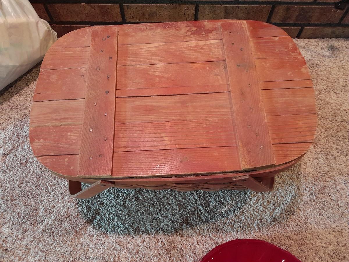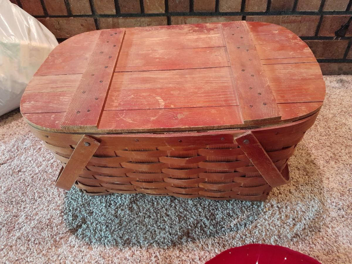 WOOD / WICKER VINTAGE PICNIC BASKET WITH BOQUE OF FAUX FLOWERS, NECK COOLER, KITCHEN TOWEL, AND PLASTIC PLATES