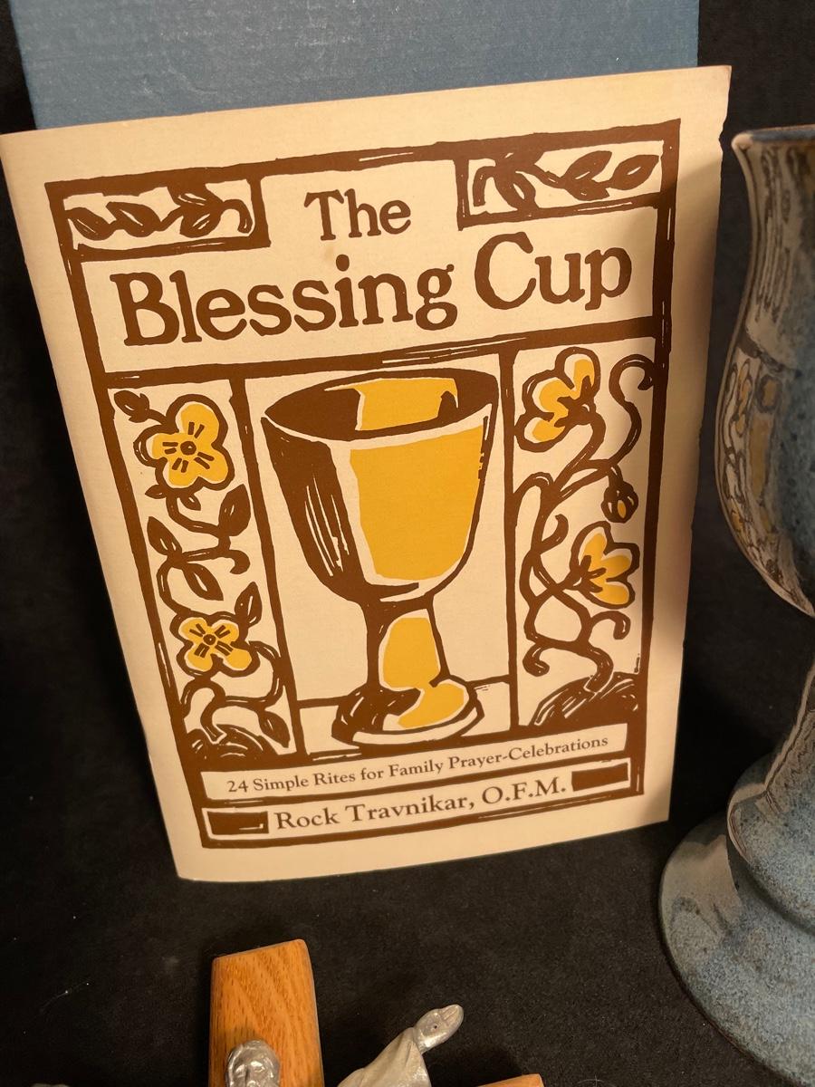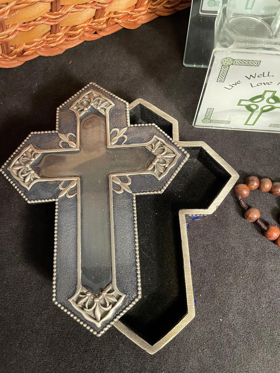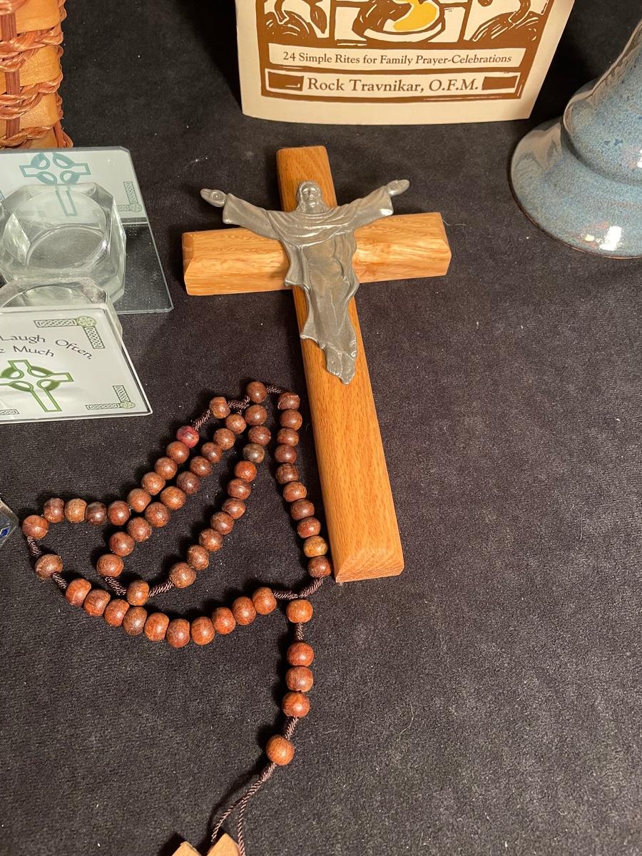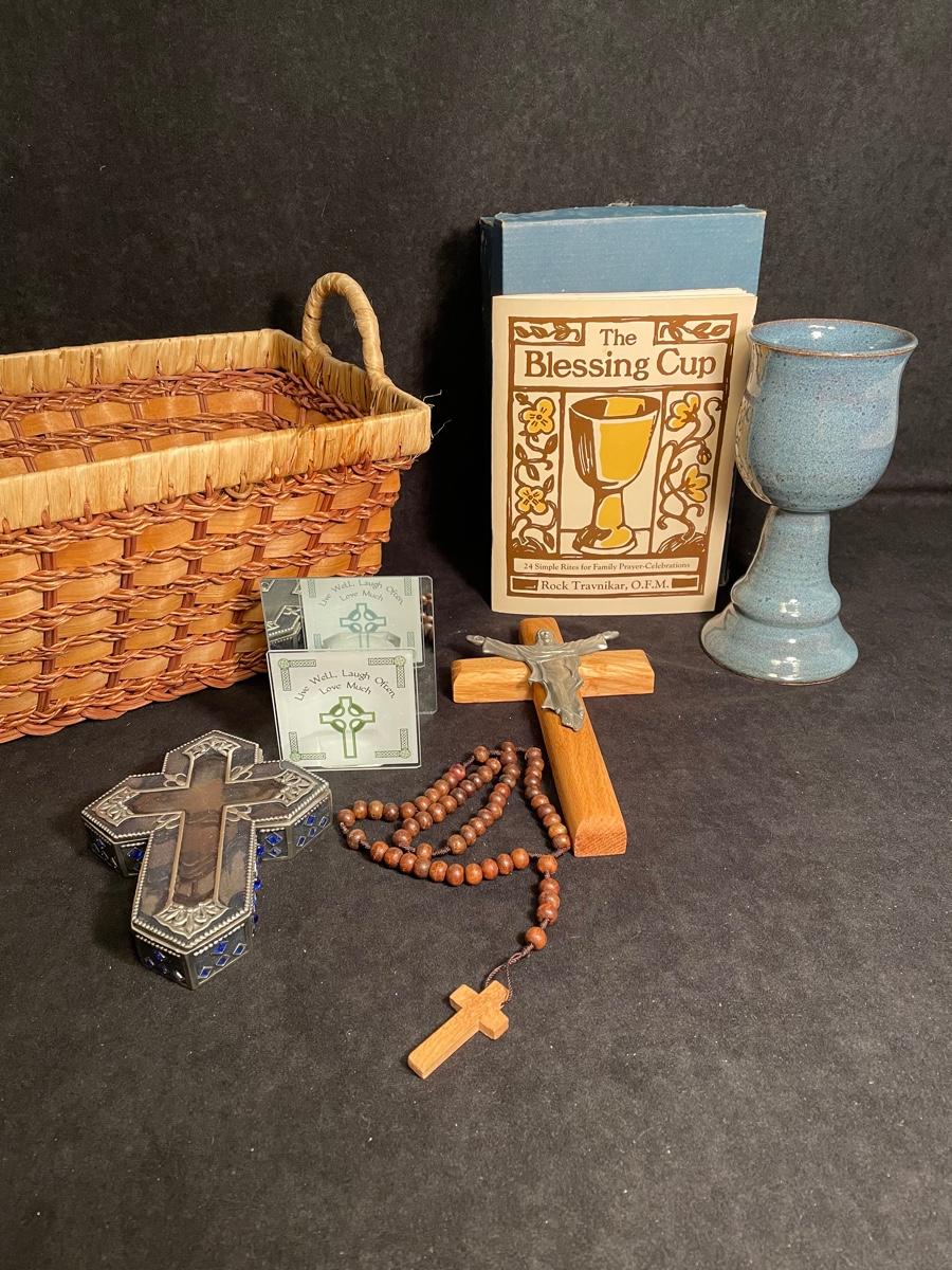 Lot 341 Basket, Rosary, "The Blessing Cup" Booklet and Cup, Crucifix, Cross Trinket Box, Votive Holder