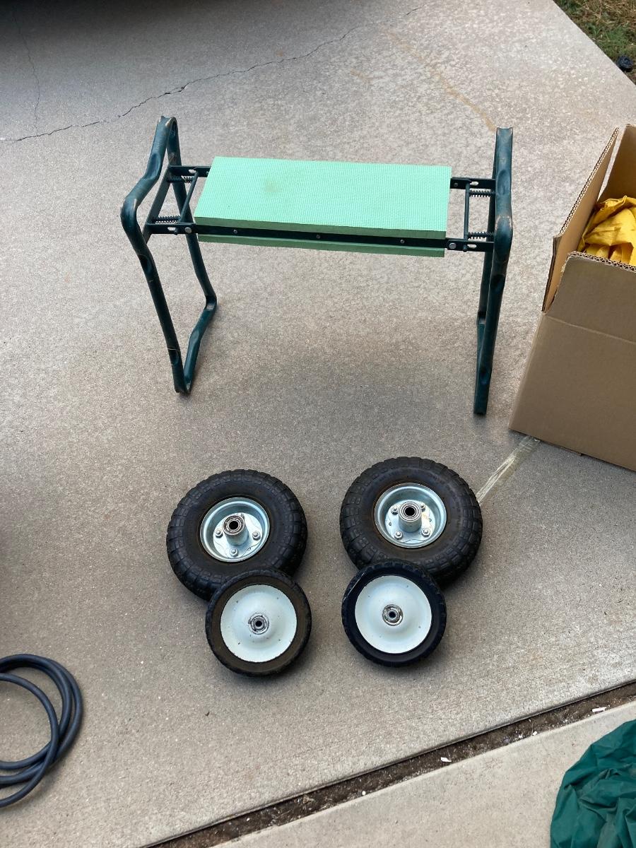 LOT 341 GARDENING BENCH, WHEELS, AND PATIO FURNITURE/ETC. COVERS (GARAGE)