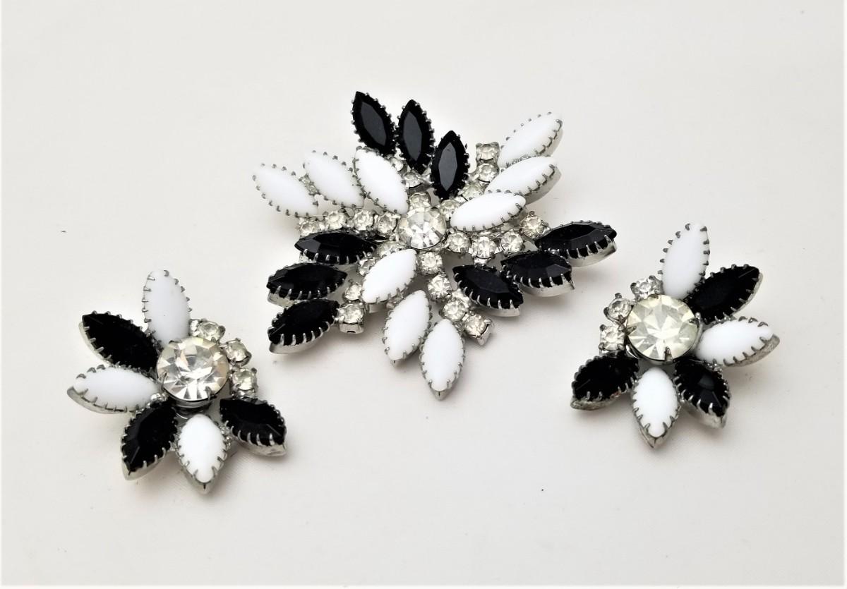 Unsigned, but still a vintage beauty - nice brooch set with Black and Clear rhinestones, and cabochon white stones, silvertone setting. Matching clip earrings. Brooch is about 2.5" across - all stones present and prong-set. Earrings about 1.5" long. Great condition.