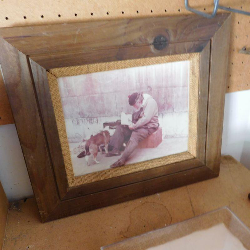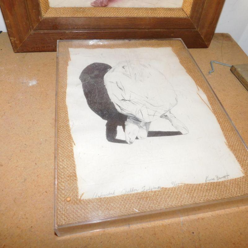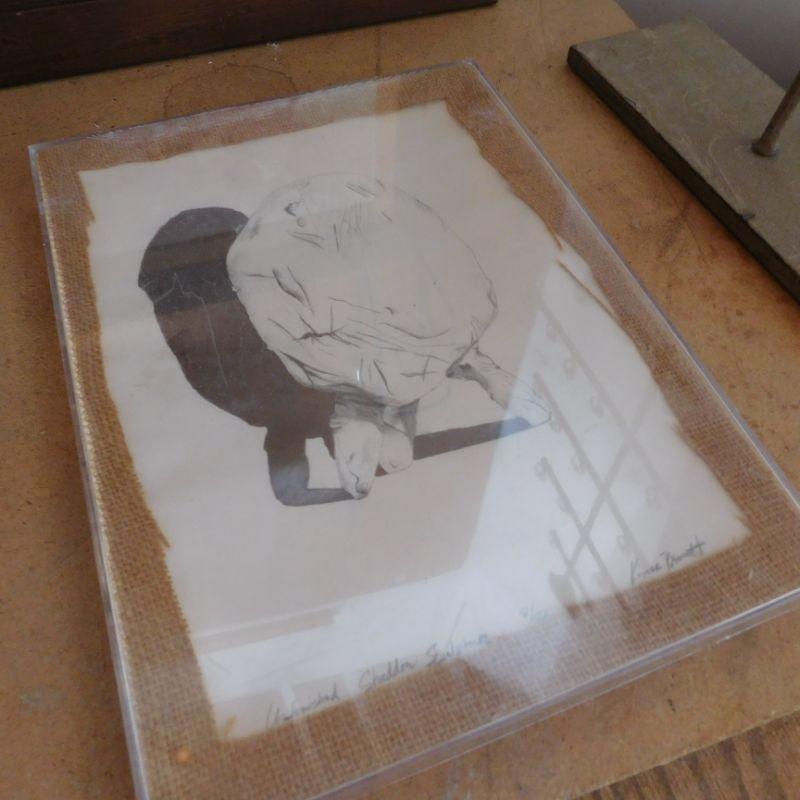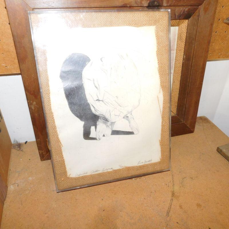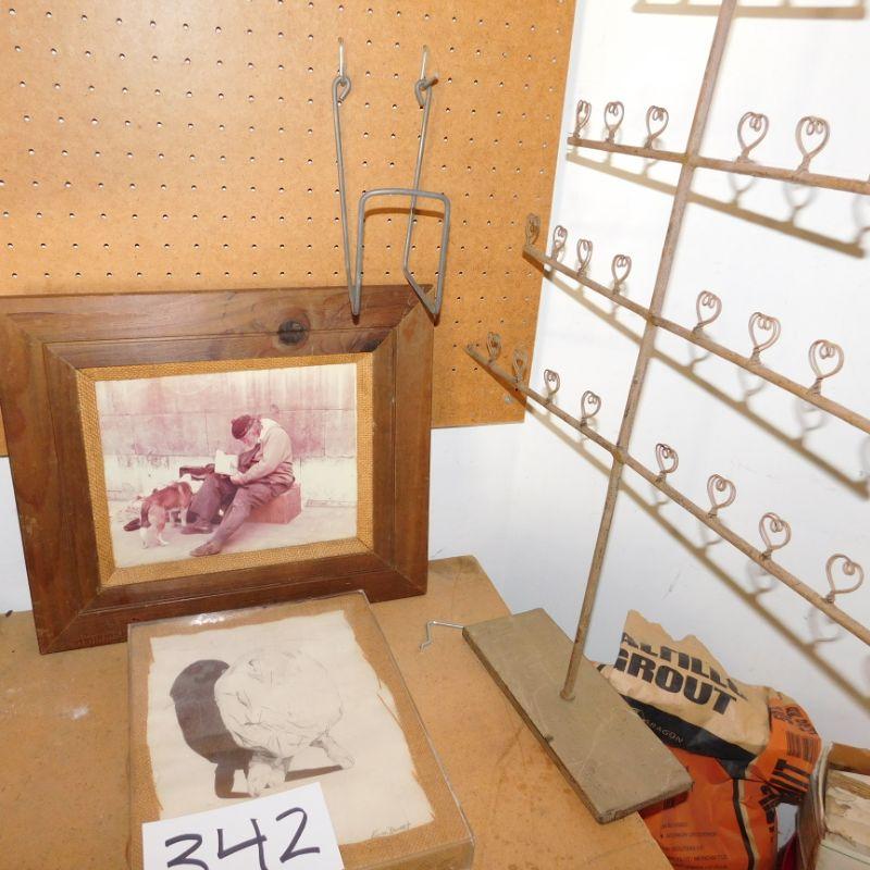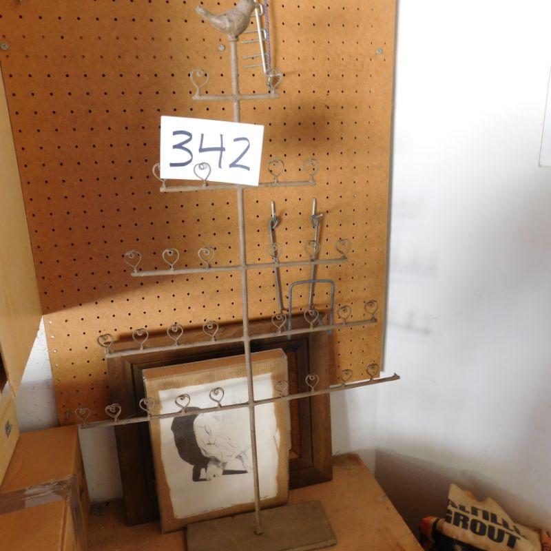 Lot 342. Metal tree with clips for cards, two pieces of framed art