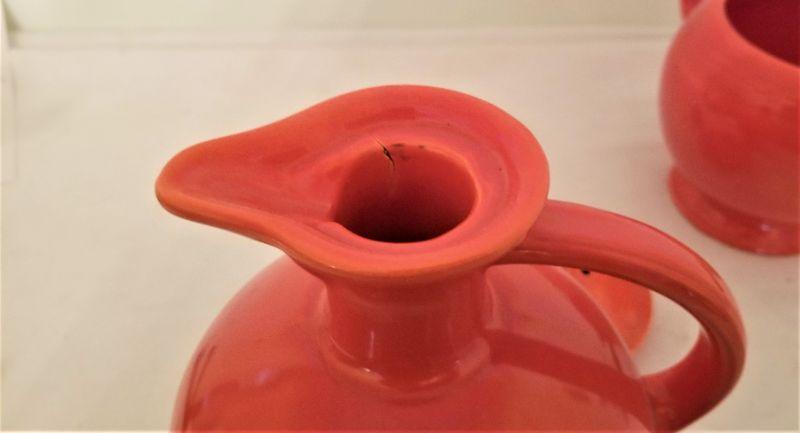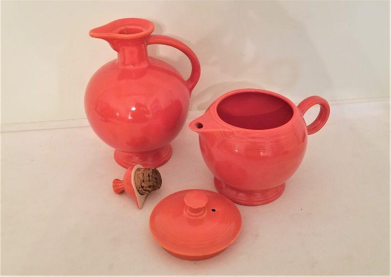 Two great pieces of vintage Fiesta Ware here - we found them hiding on top of a tall cupboard. Note small stress fracture at water pitcher spot (inside rim). Otherwise good condition. Pitcher measures 10" tall, teapot is 7" tall.