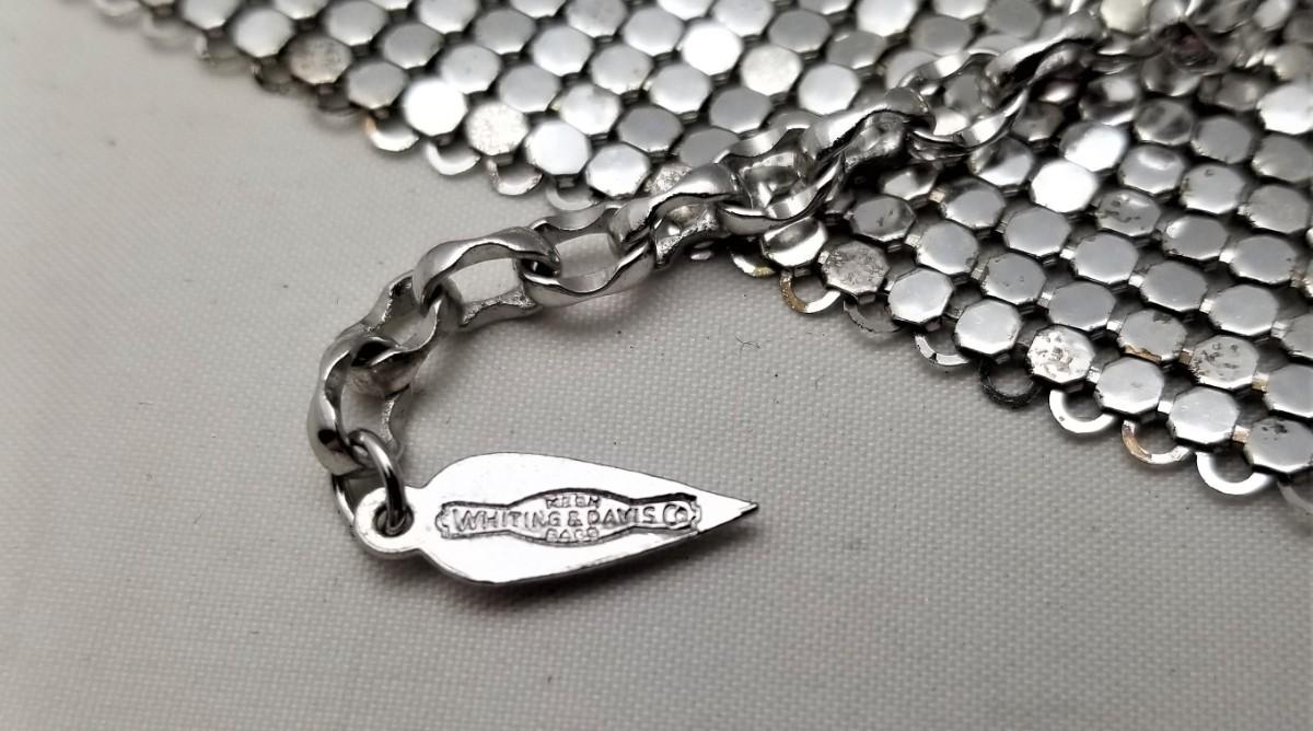 So 70's....vintage Whiting & Davis (marked) Silver-tone bib style necklace. Goo vintage condition.. Shiny Bright, nice and supple. About 9" long in front.