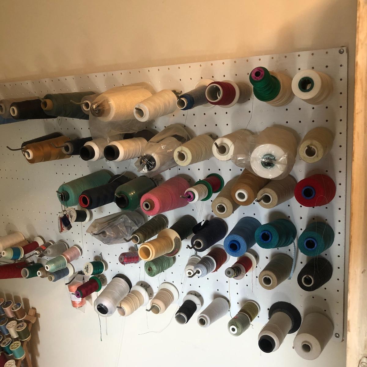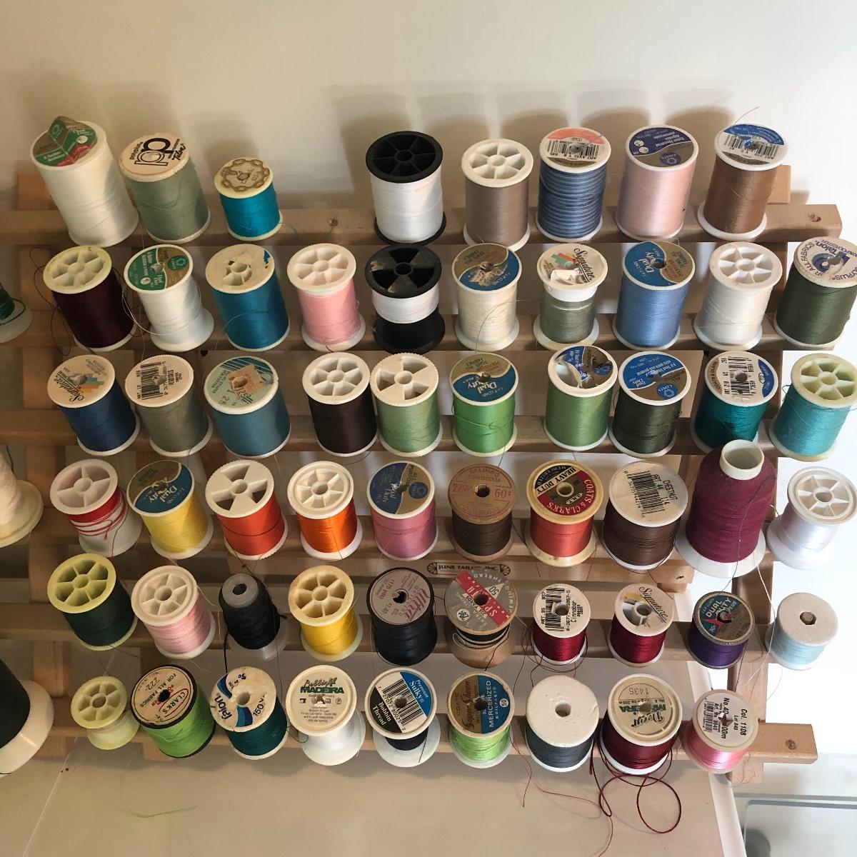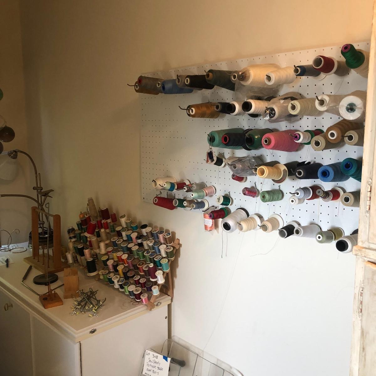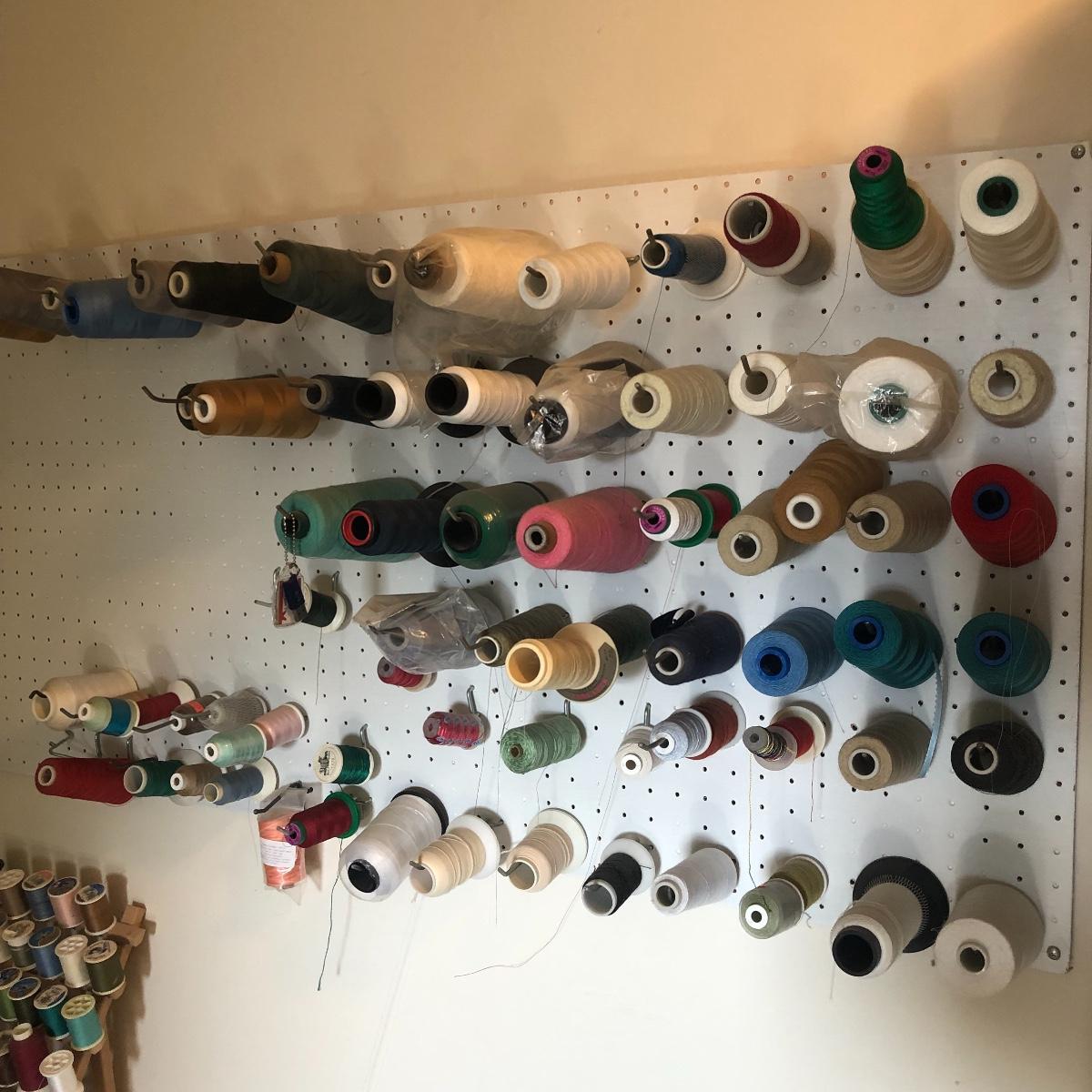 Sew to your heart’s content with this lot! It contains over 160 spools of thread (of varying sizes!), six thread stands and a peg board with pegs to better hang and organize your larger spools of thread. The winner bidder will need to remove the peg board from the wall. It measures 48” x 24”. Local pick up only.