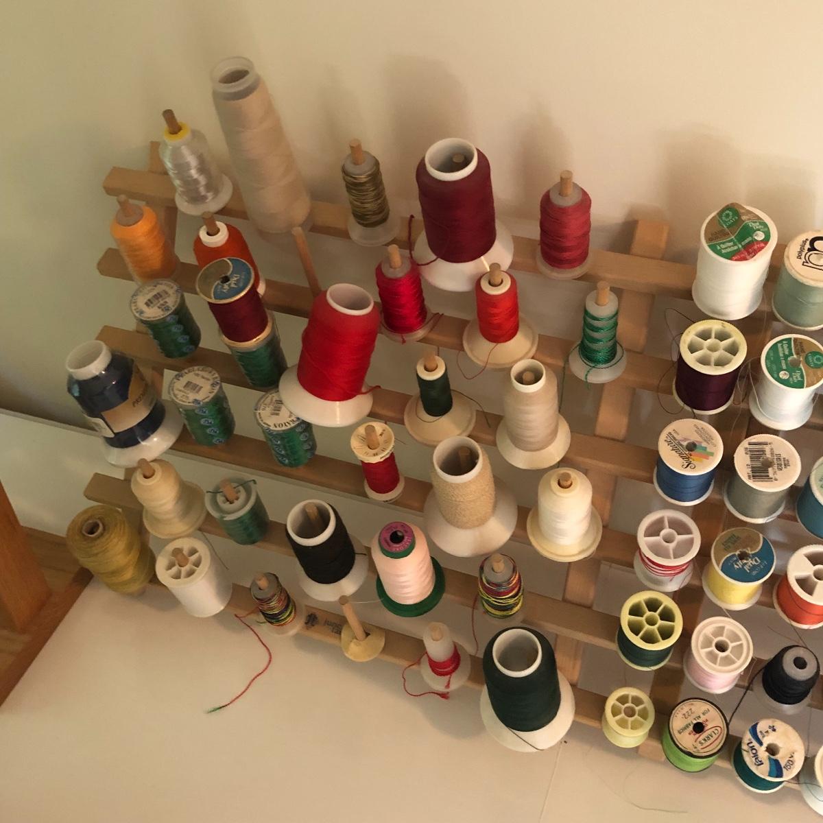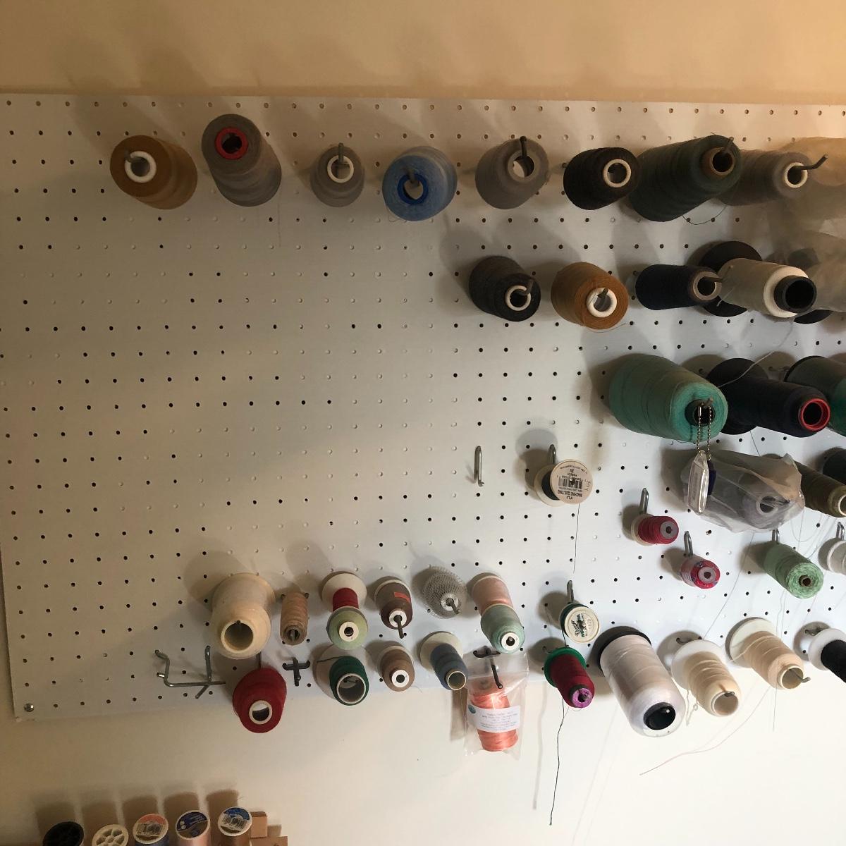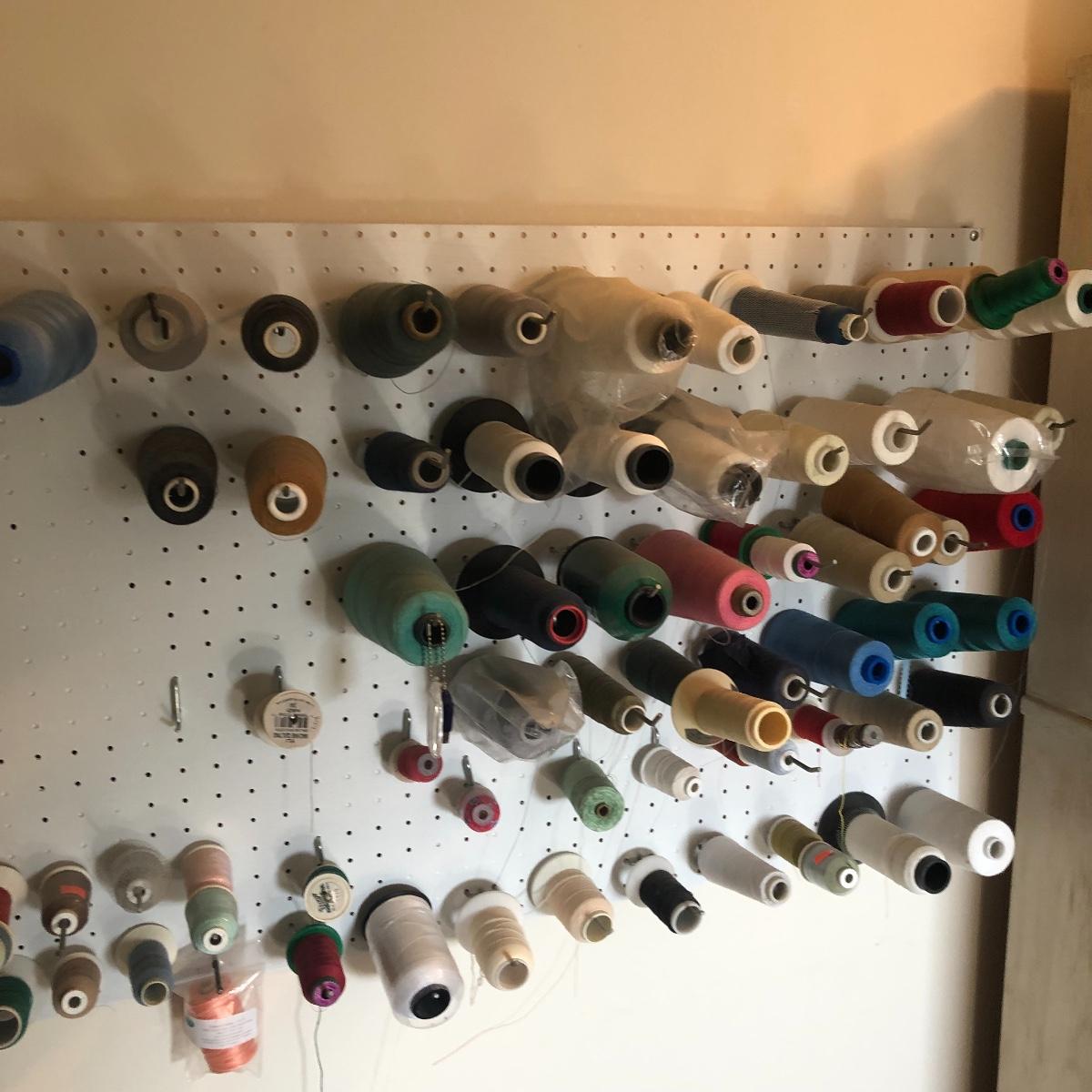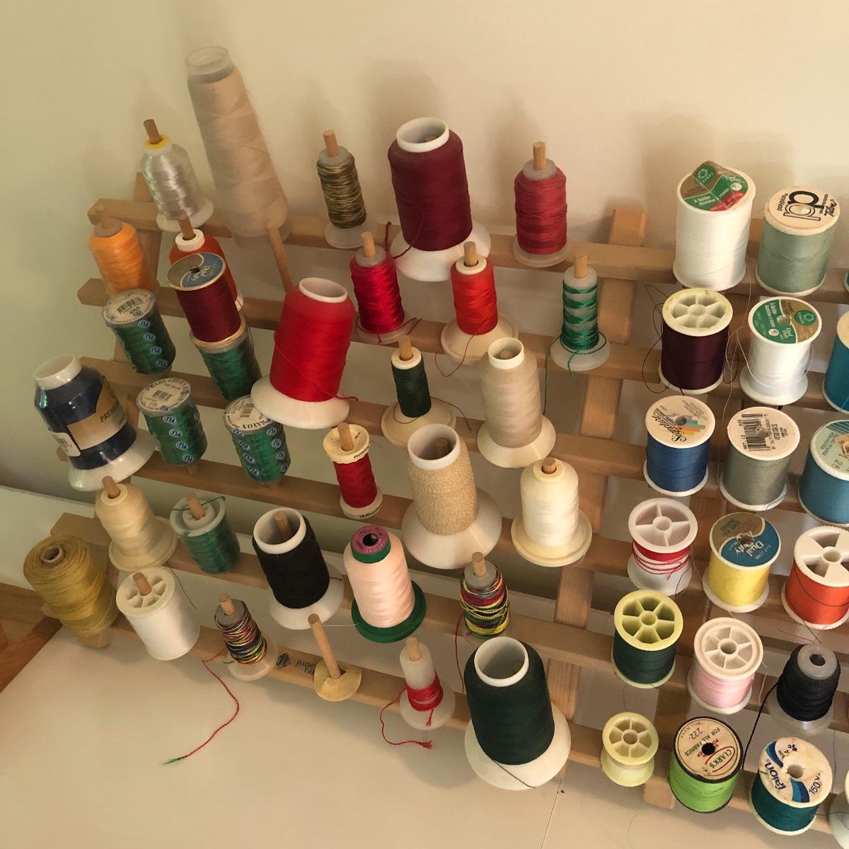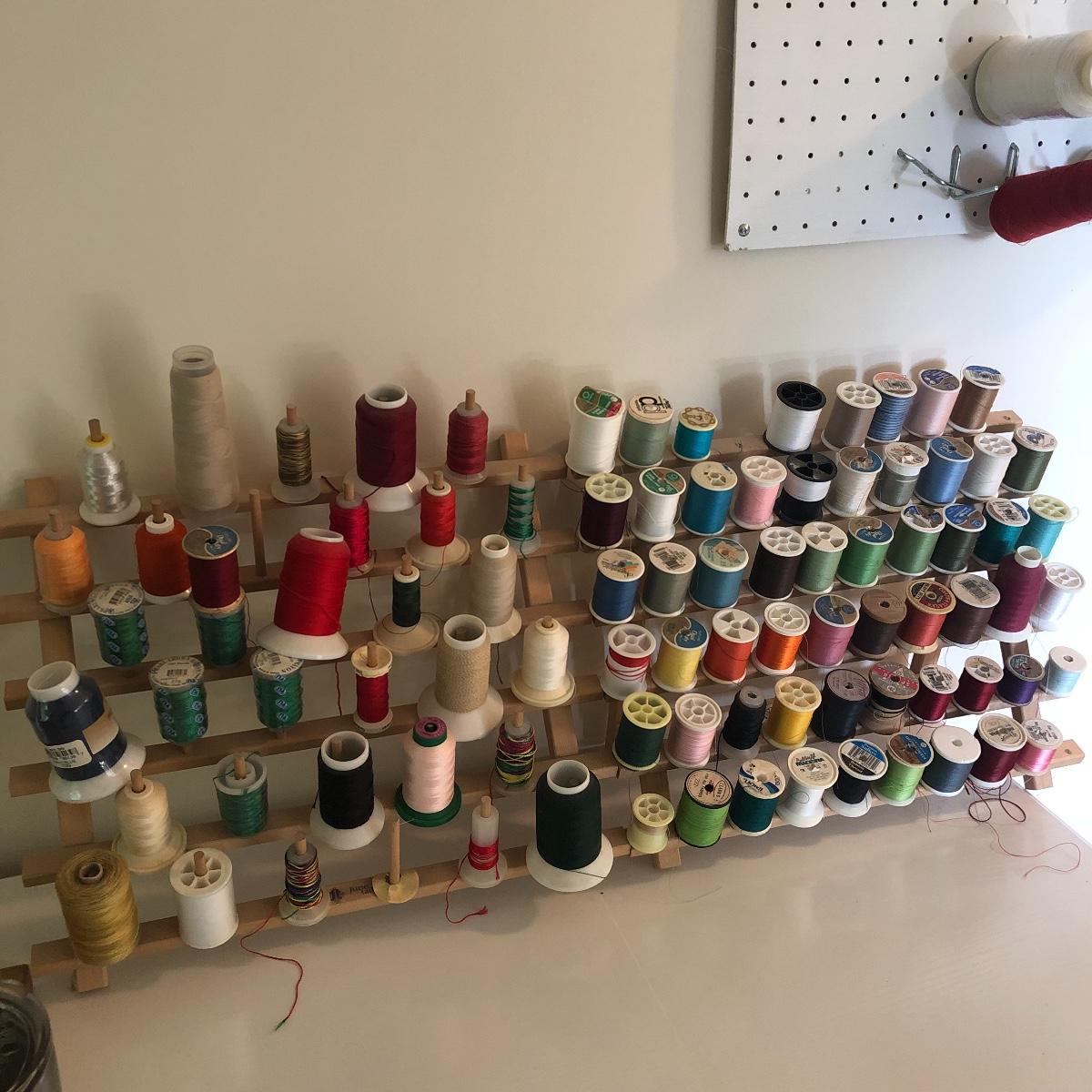 Sew to your heart’s content with this lot! It contains over 160 spools of thread (of varying sizes!), six thread stands and a peg board with pegs to better hang and organize your larger spools of thread. The winner bidder will need to remove the peg board from the wall. It measures 48” x 24”. Local pick up only.