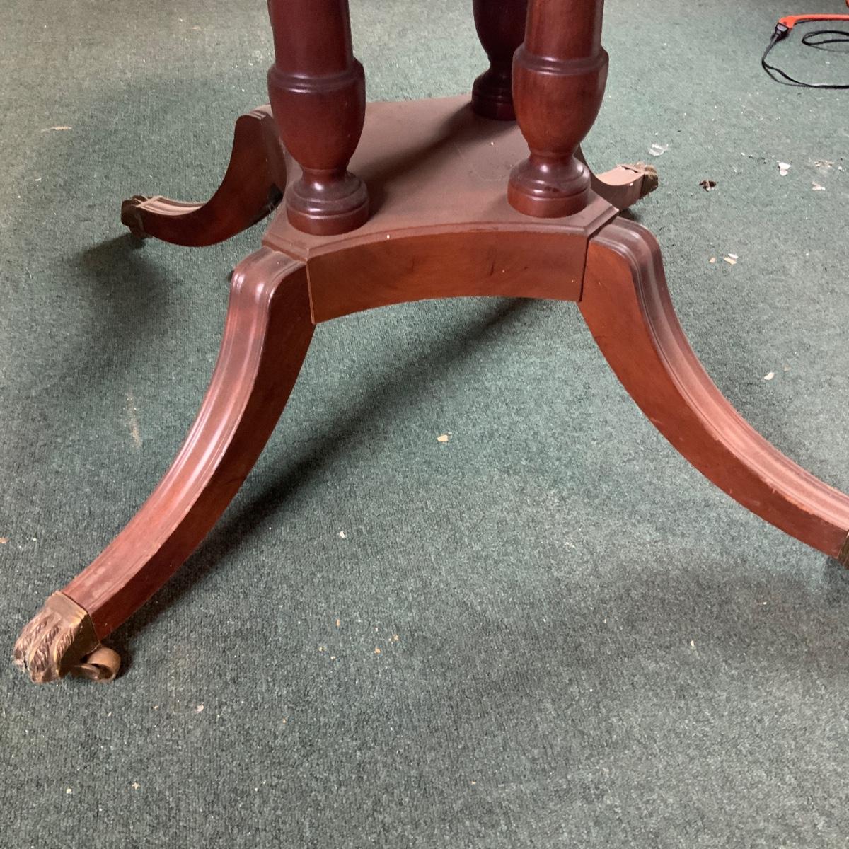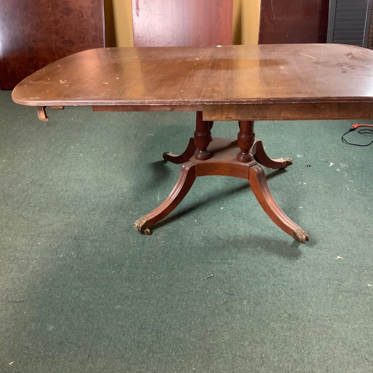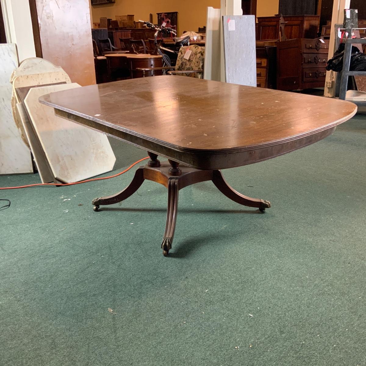 Dining table with a unique base. Would look great in a dining room. Some restoration required. Or just toss a table cloth over it! //::\\ Please see photos for details and condition. No attempt has been made to hide any imperfections. All items listed in this auction are warehouse items, and need to be cleaned. A majority of the items need restoration as well. All items are sold AS IS and WITHOUT GUARANTEE. If you are uncertain about an item, DO NOT BID. Due to the nature of this online auction in-person inspection is HIGHLY recommended. All Sales are FINAL. Pick Up Times are FIRM. Please confirm with your own schedule that you can pick up in the scheduled times listed in the Terms and Conditions. Any questions please message the auctioneer. DO NOT Contact The Harp Gallery.