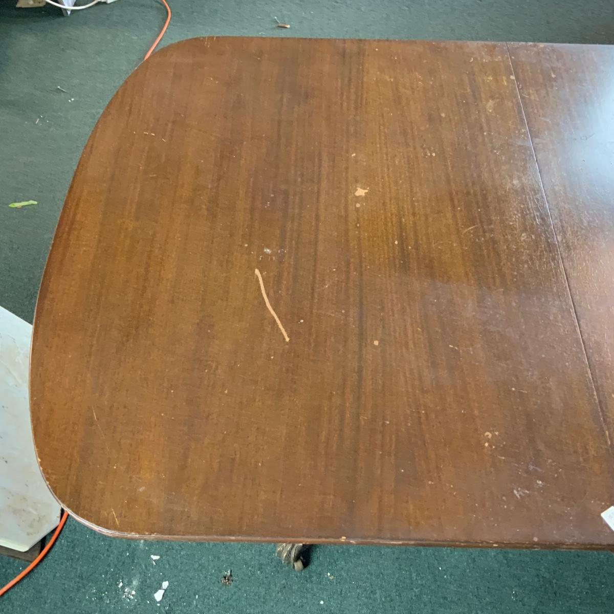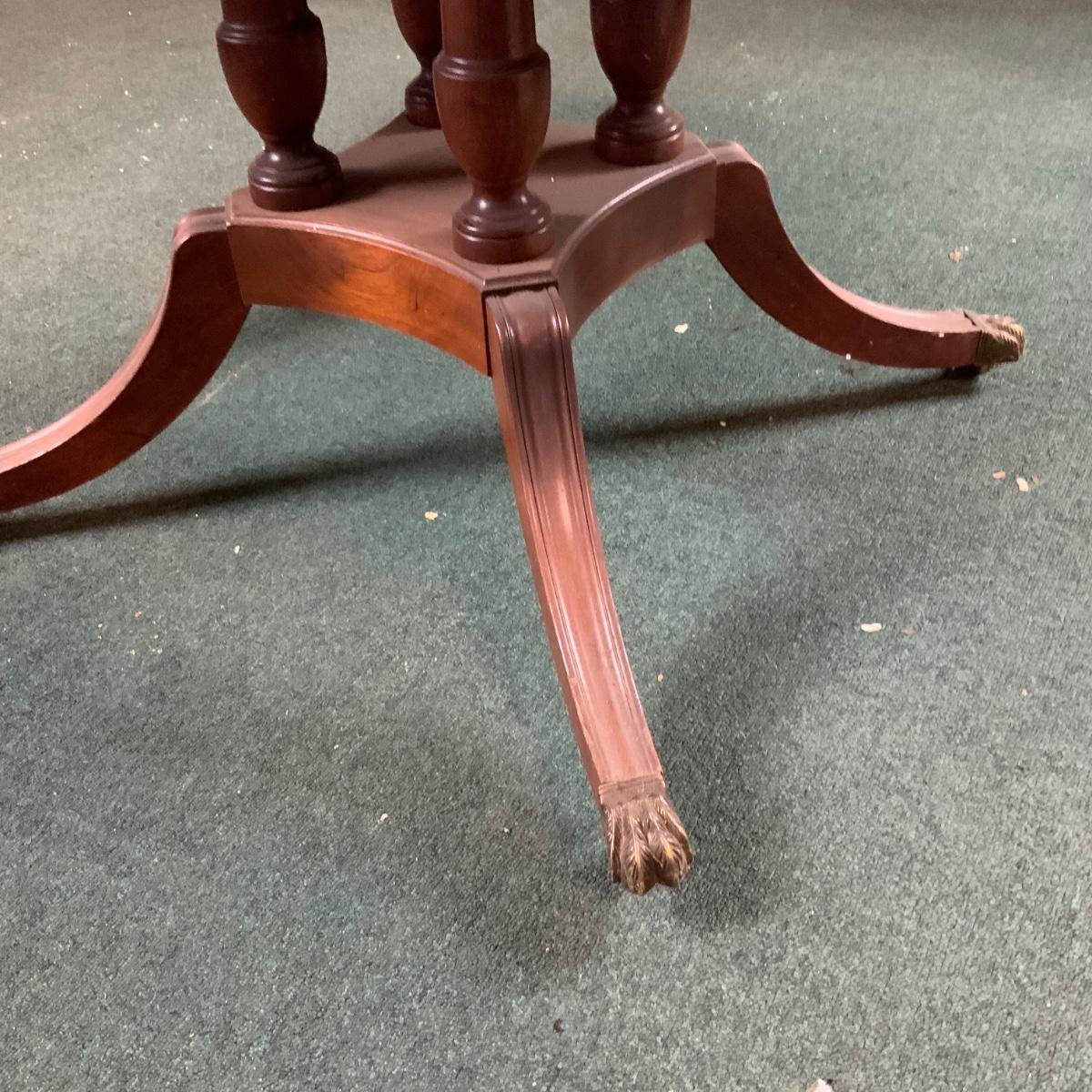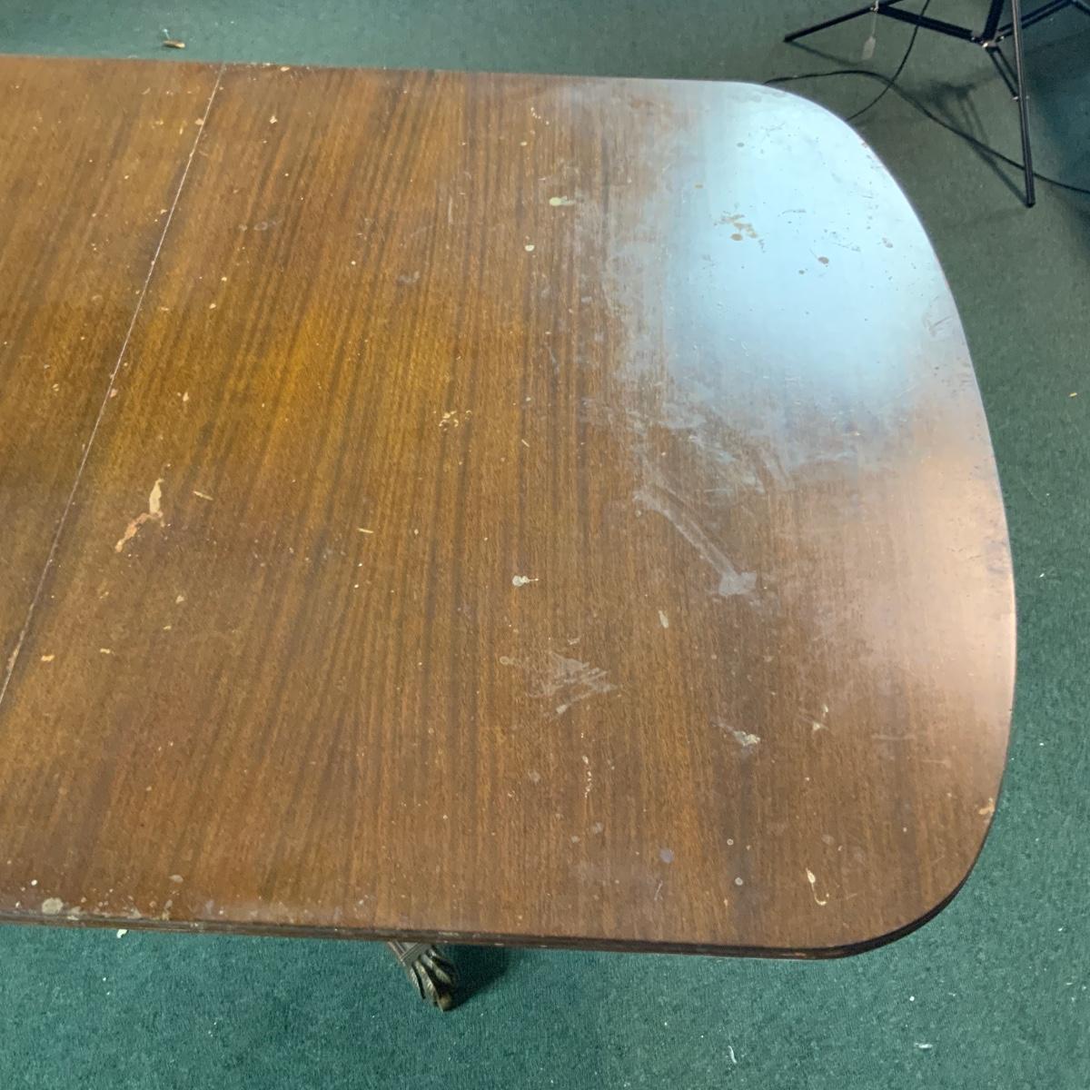 Dining table with a unique base. Would look great in a dining room. Some restoration required. Or just toss a table cloth over it! //::\\ Please see photos for details and condition. No attempt has been made to hide any imperfections. All items listed in this auction are warehouse items, and need to be cleaned. A majority of the items need restoration as well. All items are sold AS IS and WITHOUT GUARANTEE. If you are uncertain about an item, DO NOT BID. Due to the nature of this online auction in-person inspection is HIGHLY recommended. All Sales are FINAL. Pick Up Times are FIRM. Please confirm with your own schedule that you can pick up in the scheduled times listed in the Terms and Conditions. Any questions please message the auctioneer. DO NOT Contact The Harp Gallery.