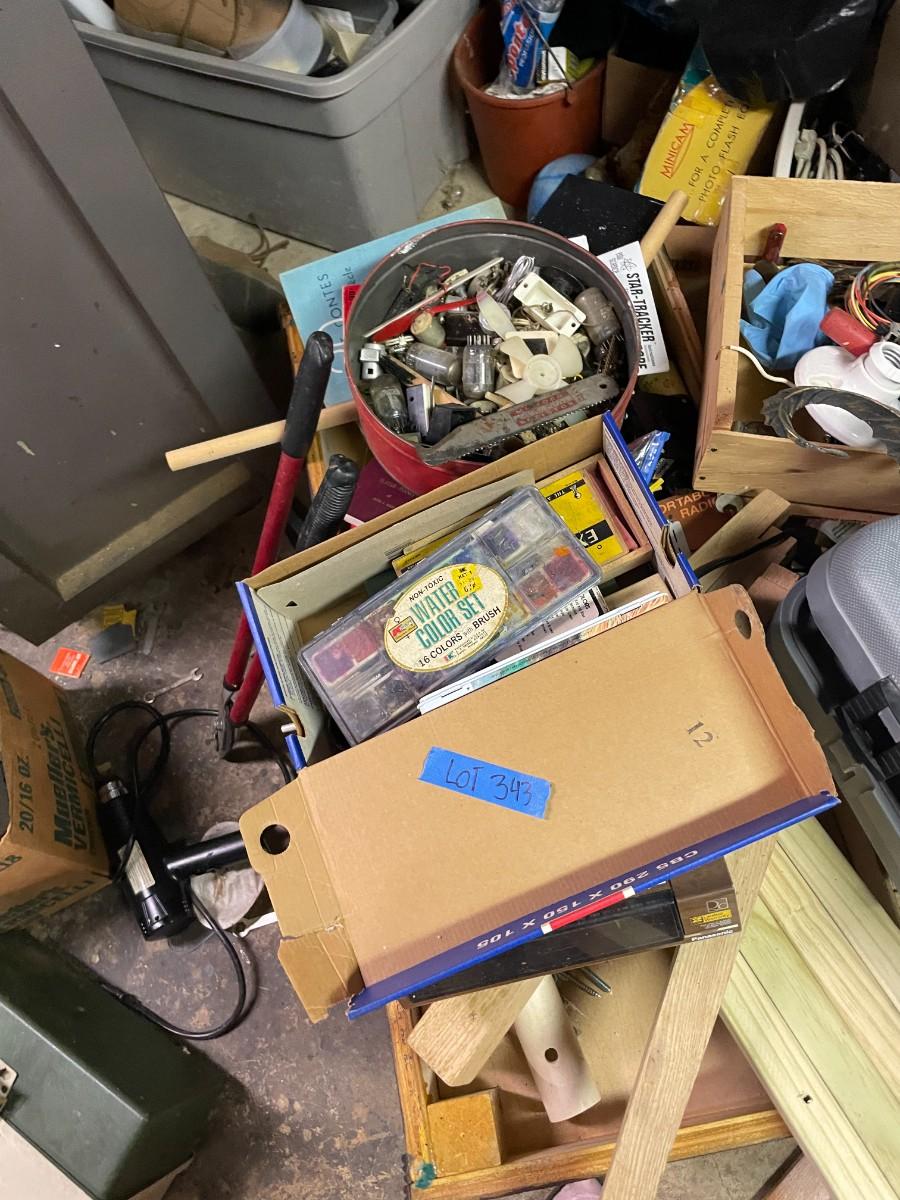 lot 343- shelves, all misc. tools and electronics