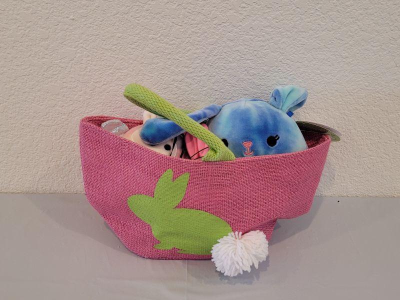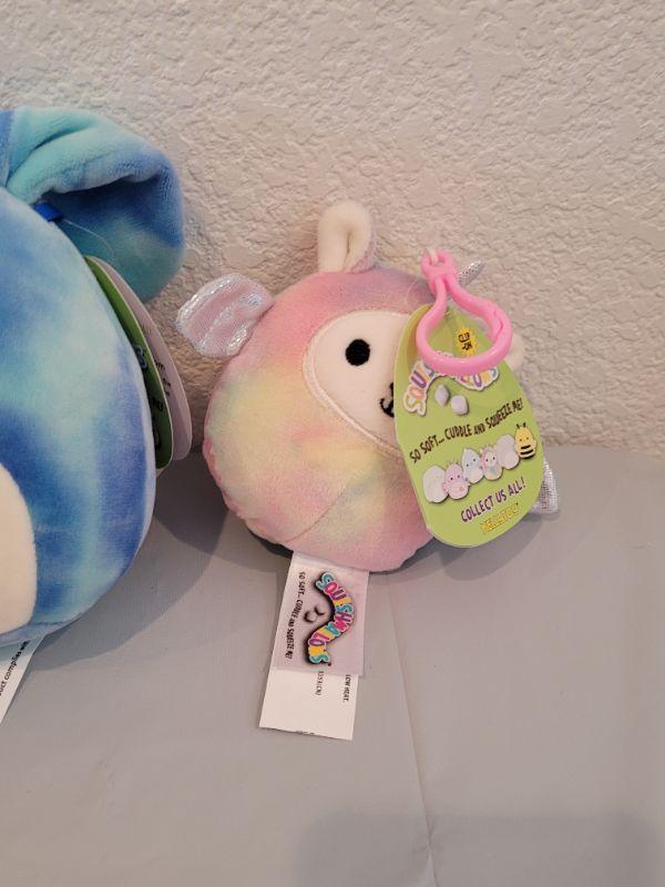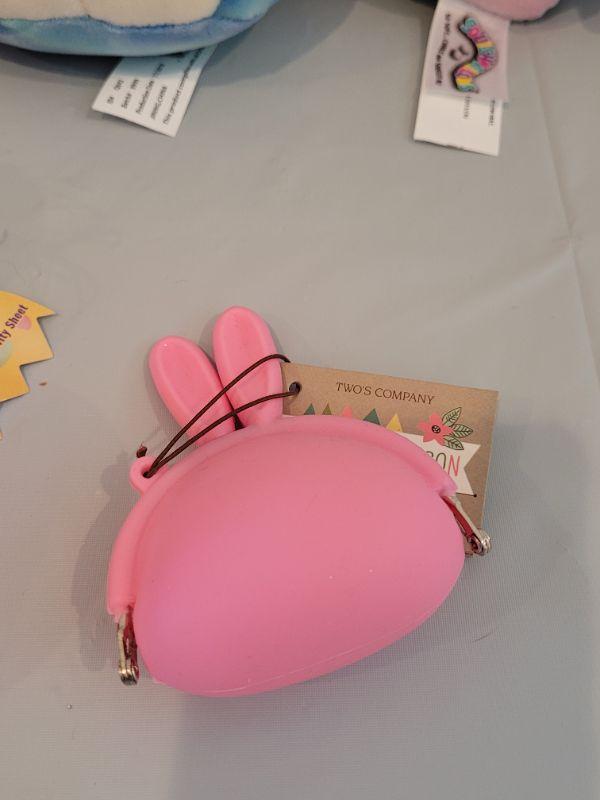 Lot 344: New Hallmark Bunny Purse Bag with Duck Earrings, Lip Balm, Bunny Coin Purse, Gold Egg with Scarf & 2 Squishmallows