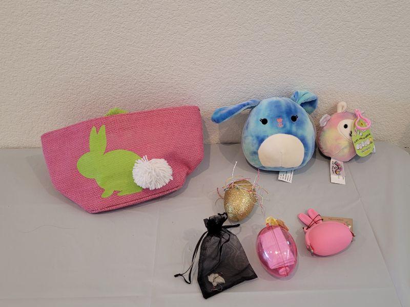 Lot 344: New Hallmark  Bunny Purse Bag with Duck Earrings, Lip Balm, Bunny Coin Purse, Gold Egg with Scarf & 2 Squishmallows