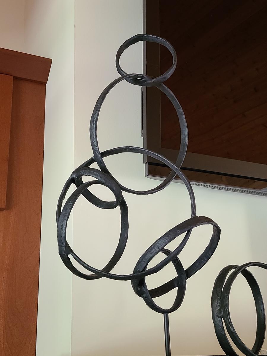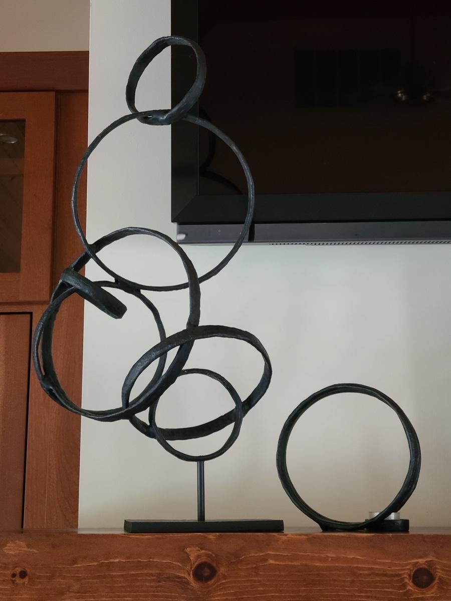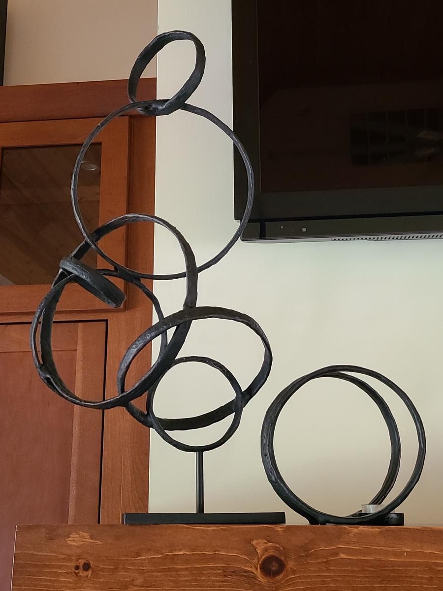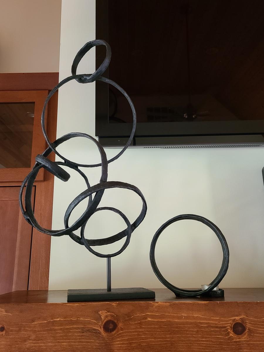 The design of this is gorgeous and it has a fluid moving design depending on how you view it. The smaller stand holds a votive. Perfect home decor! These are heavy and solid metal. Please see all pictures as they are the best representation of the items. The pictures show condition, measurements if taken, and what is included in the lot. Due to the large amount that we photograph and the time frame, we are not always able to take measurements. All items unless noted, are pre-owned and have been used. If you purchased furniture, you must bring help. We do not allow one person to carry large furniture out on their own. Bring help, tools and a truck for the safety of our clients homes, and your personal safety. Company policy. Thank you.