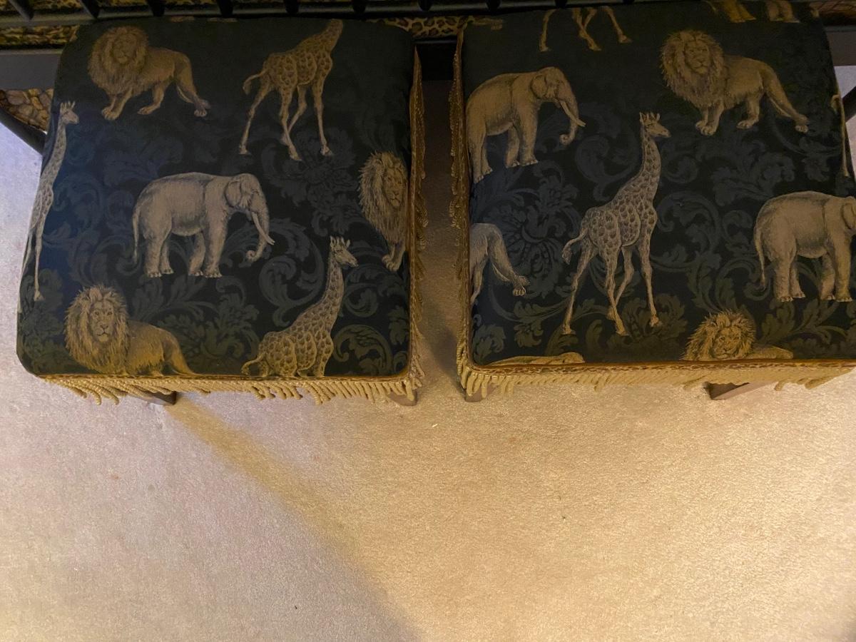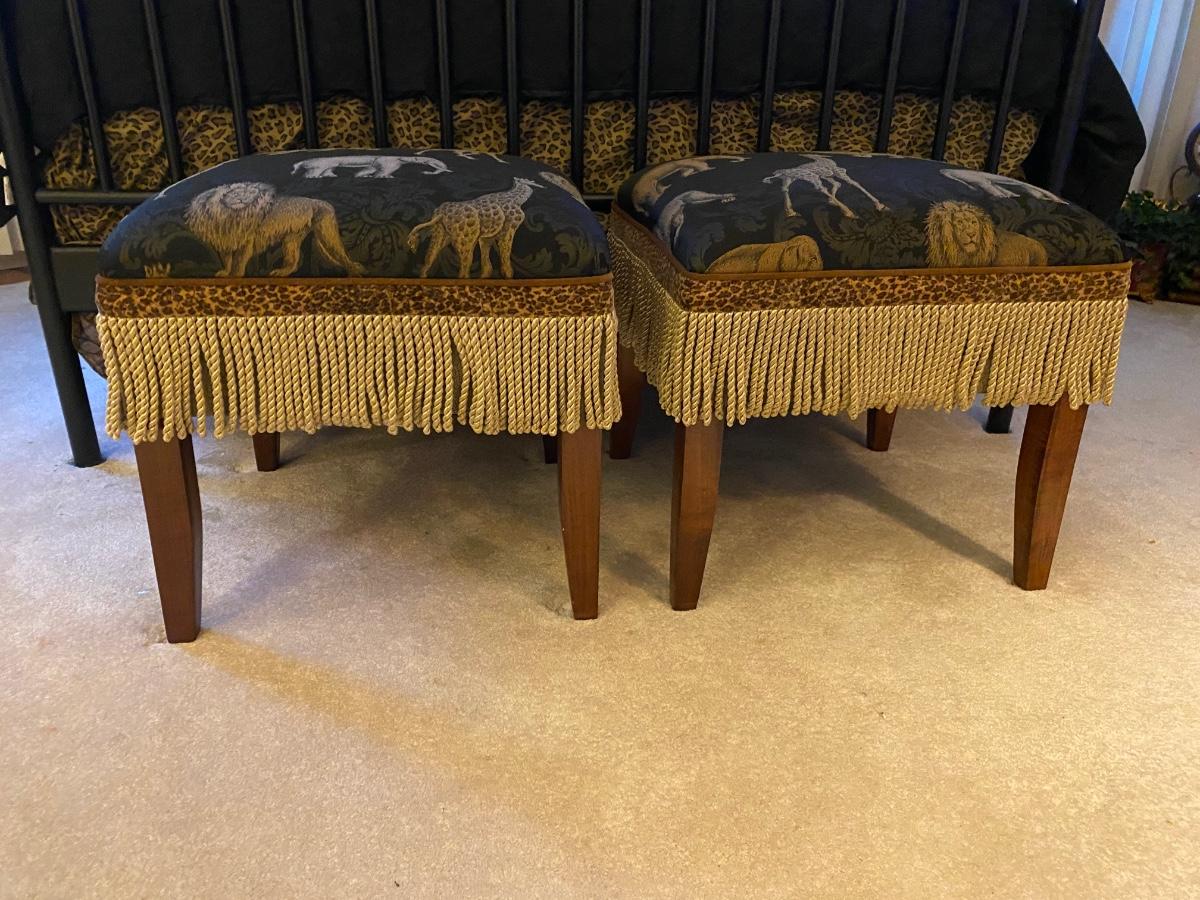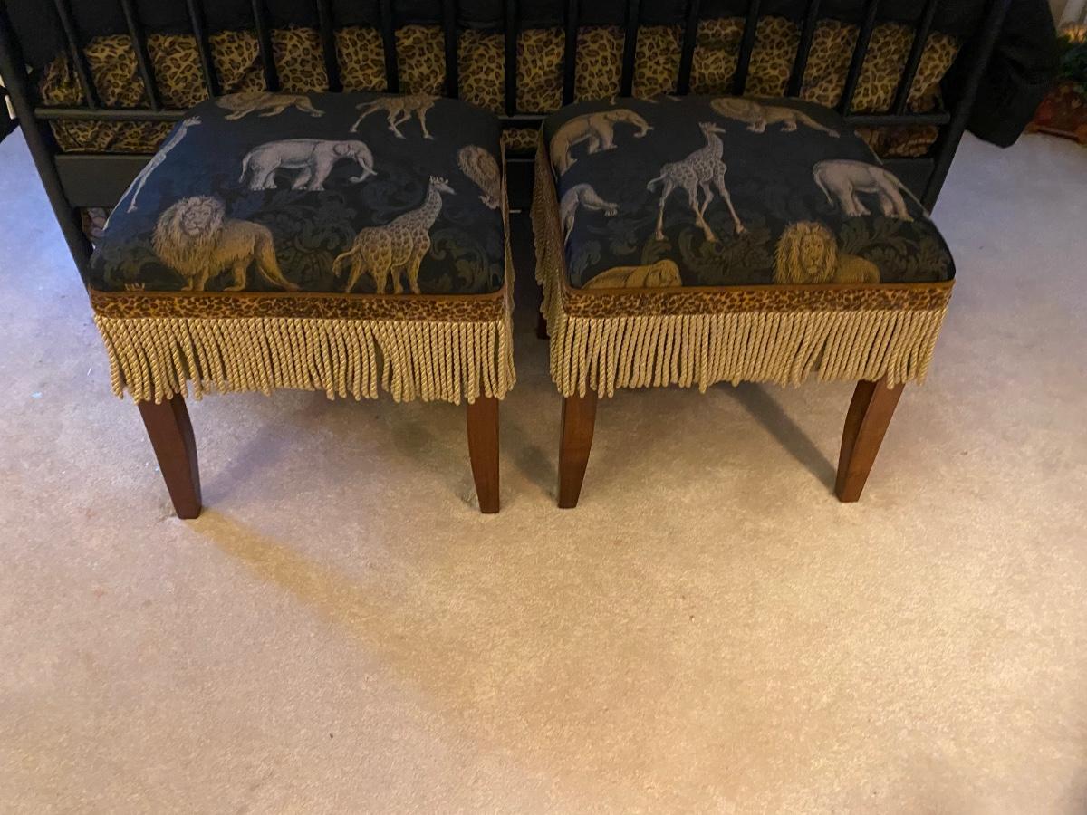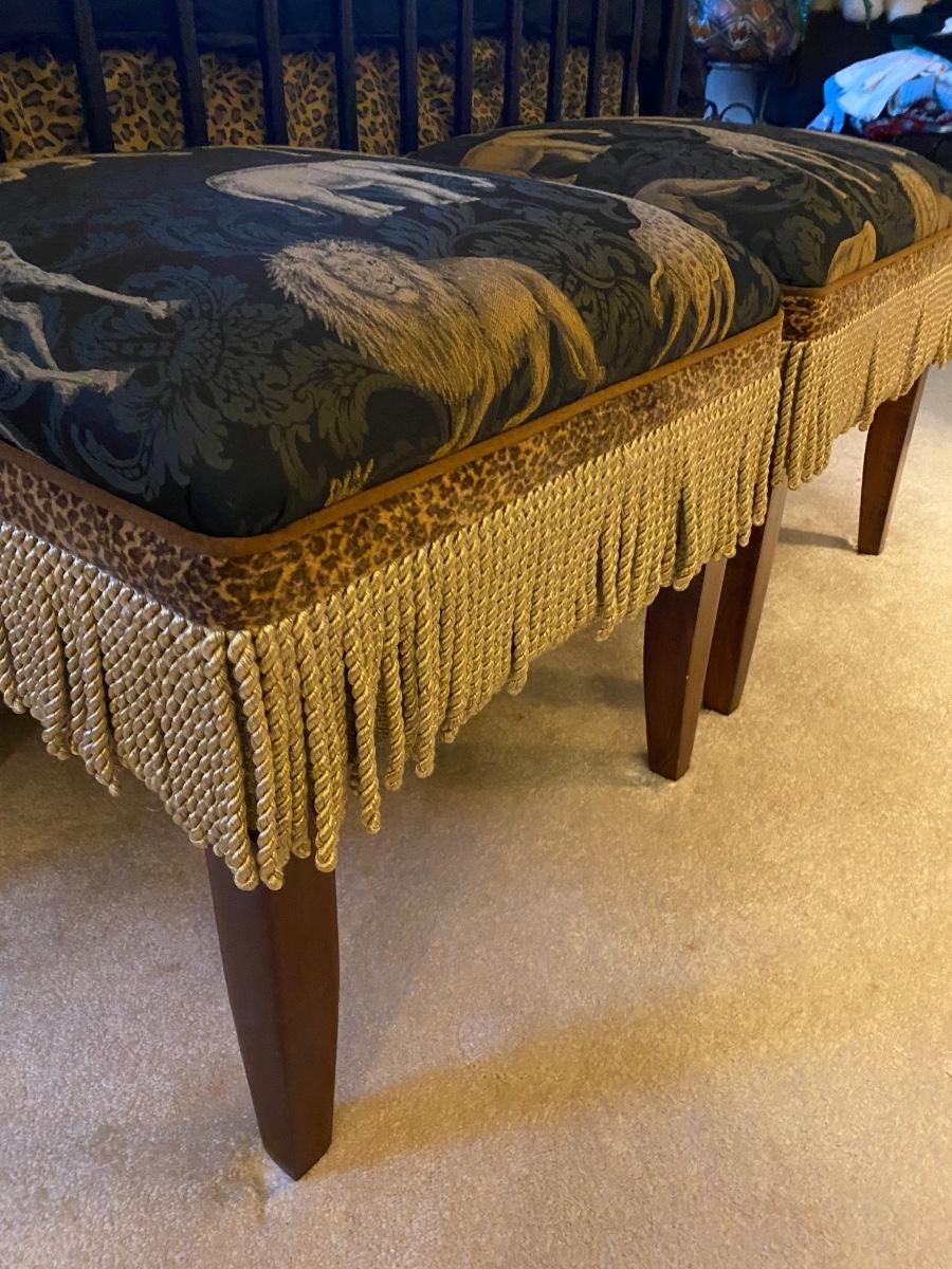 Pair of upholstered animal/safari printed bed benches. These are sized to sit on at end of the bed, or as corner accents with pillows.