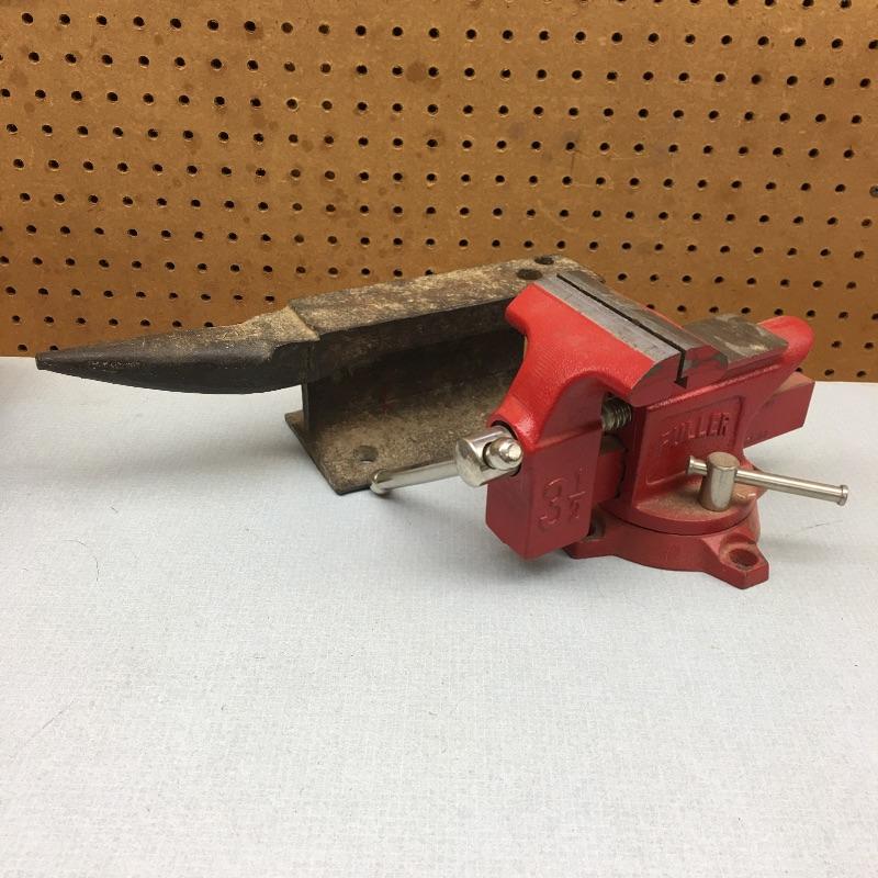Anvil and vise. Lot includes mini anvil and Fuller 3.5” vise. Two great tools for your workshop, you will wonder how you ever got along without them. Anvil measures 3.75” x 12.75” x 3.5”.