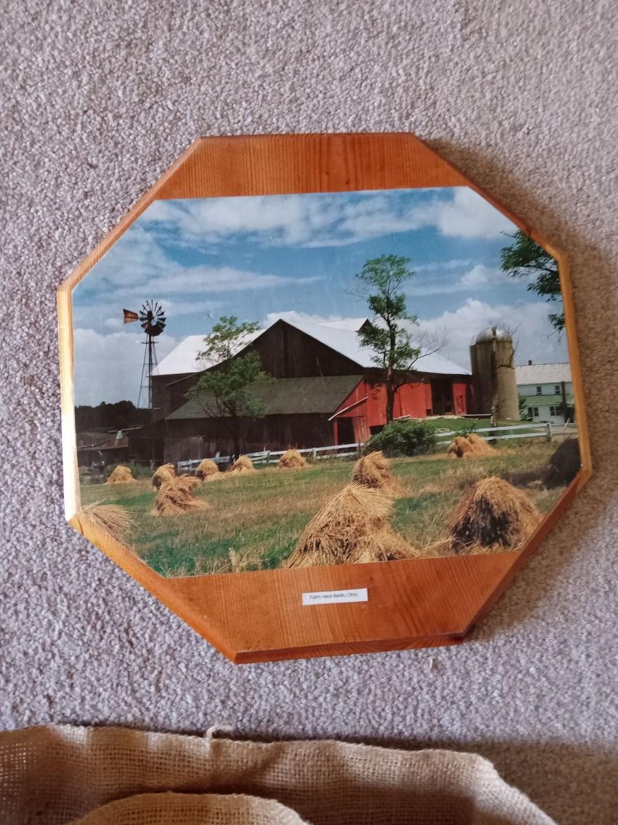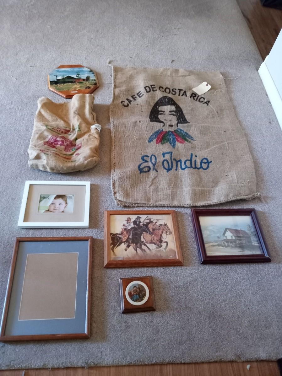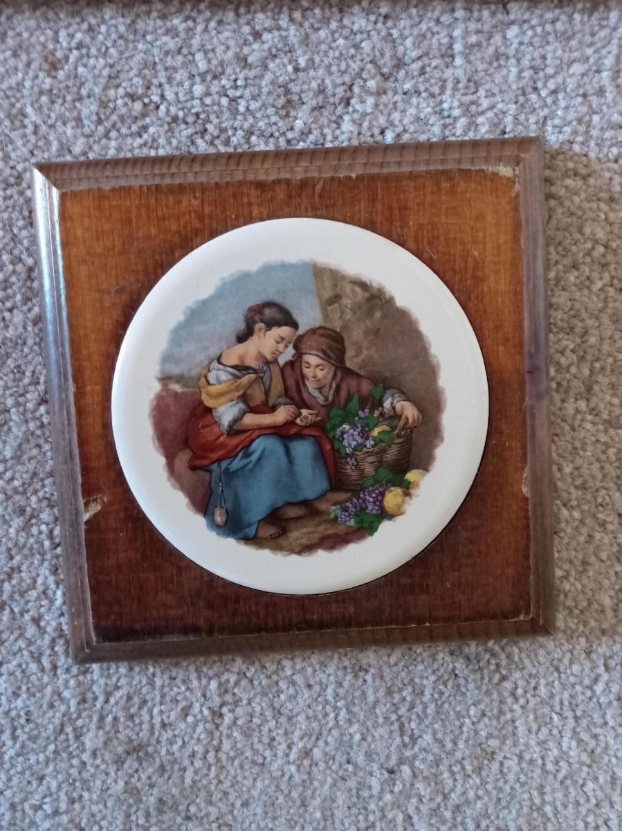 2 PICTURE FRAMES, A DECOUPAGE PICTURE ON WOOD AND A SMALL PAINTED PICTURE ON A CERAMIC CIRCLE MOUNTED ON WOOD