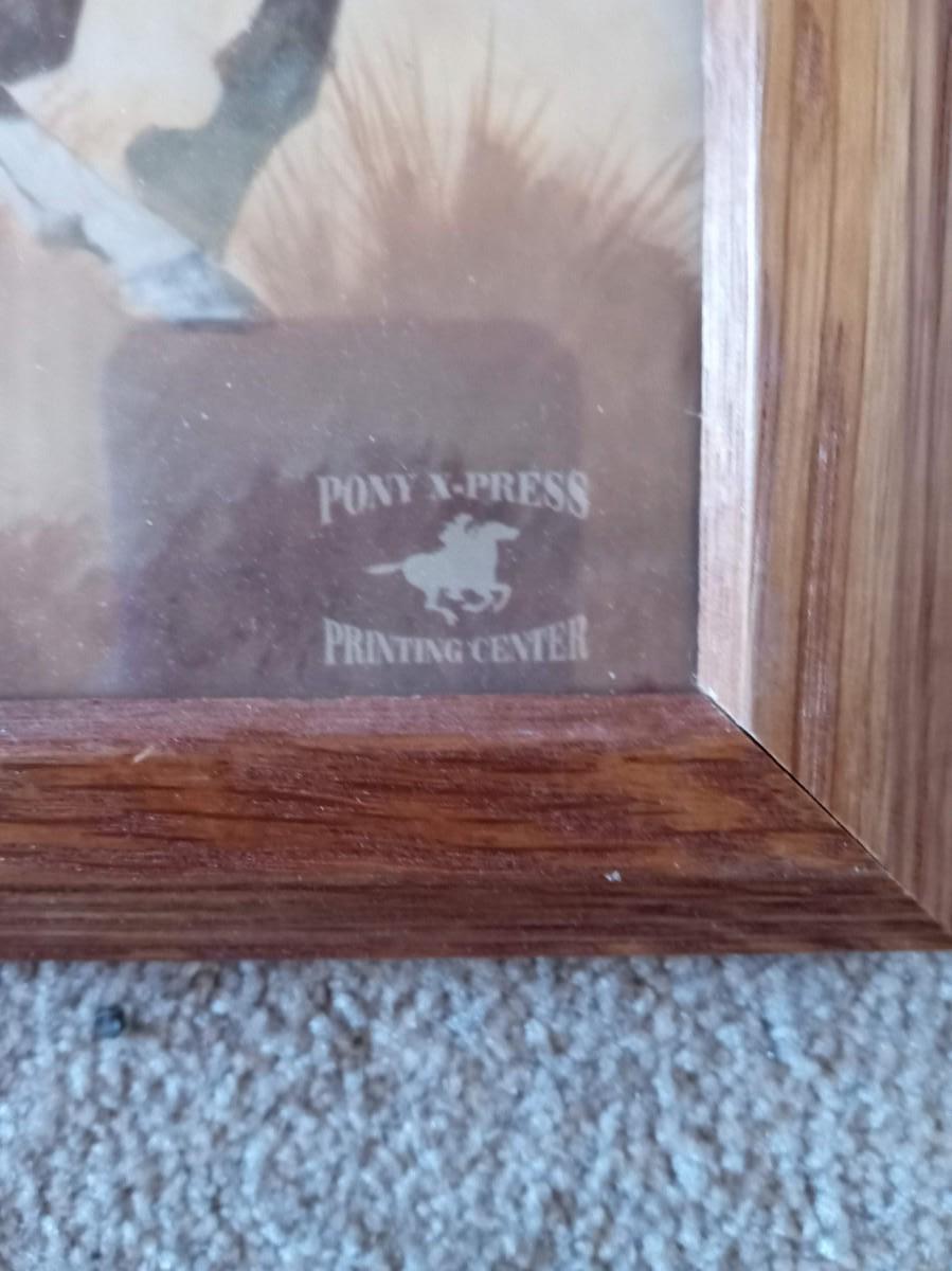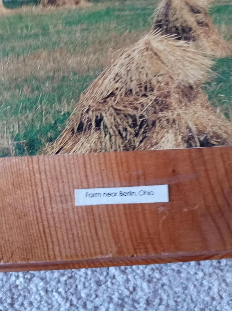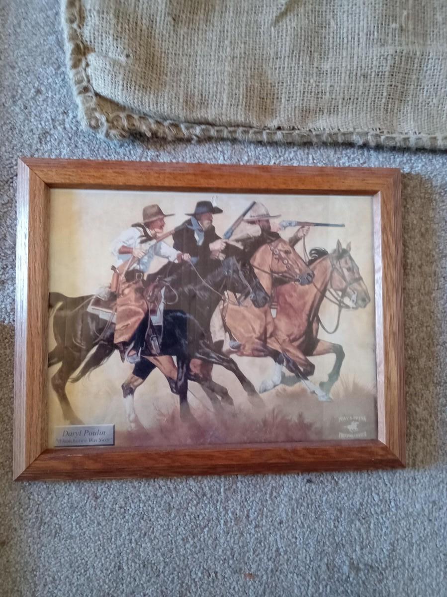 2 PICTURE FRAMES, A DECOUPAGE PICTURE ON WOOD AND A SMALL PAINTED PICTURE ON A CERAMIC CIRCLE MOUNTED ON WOOD